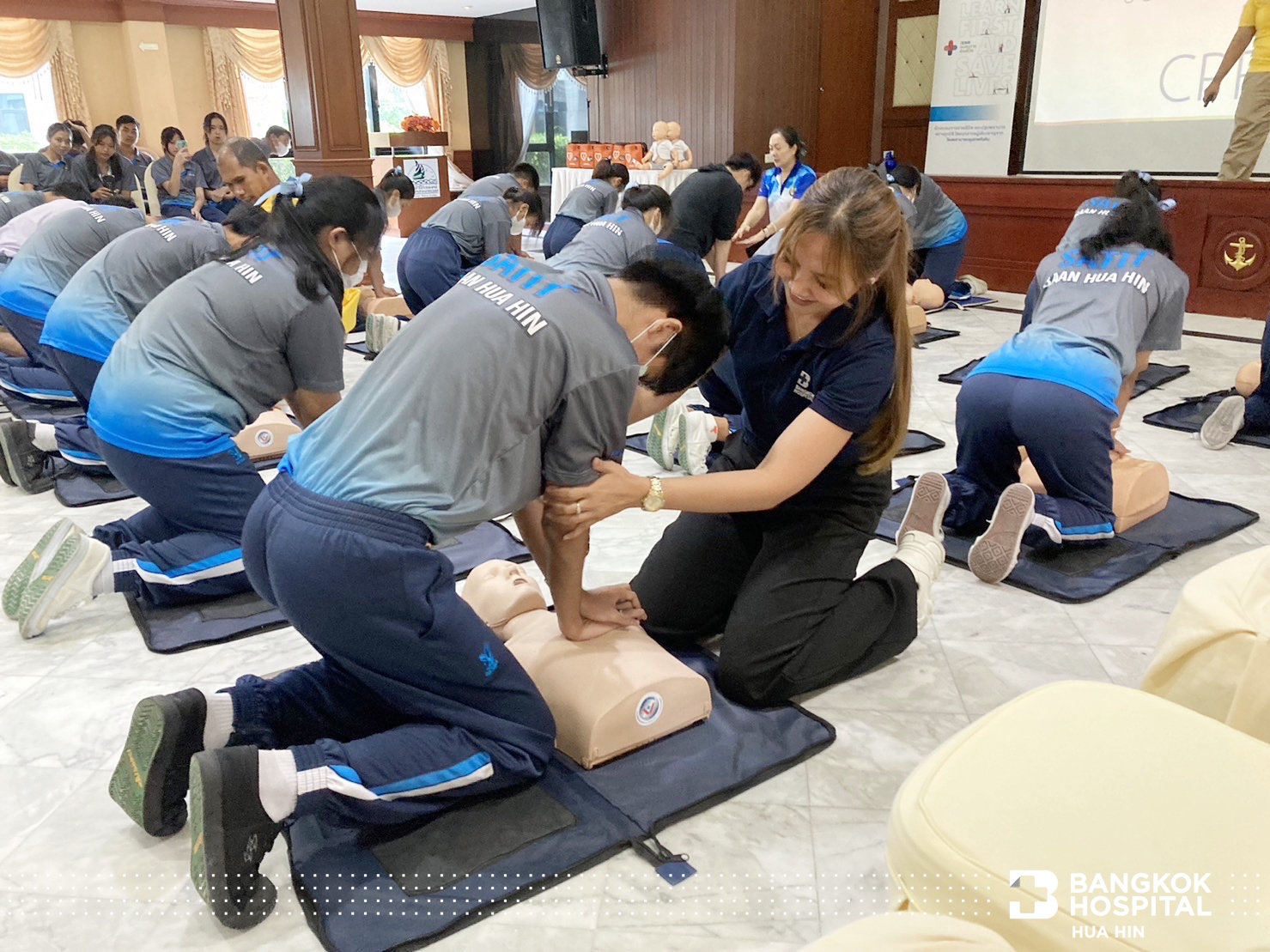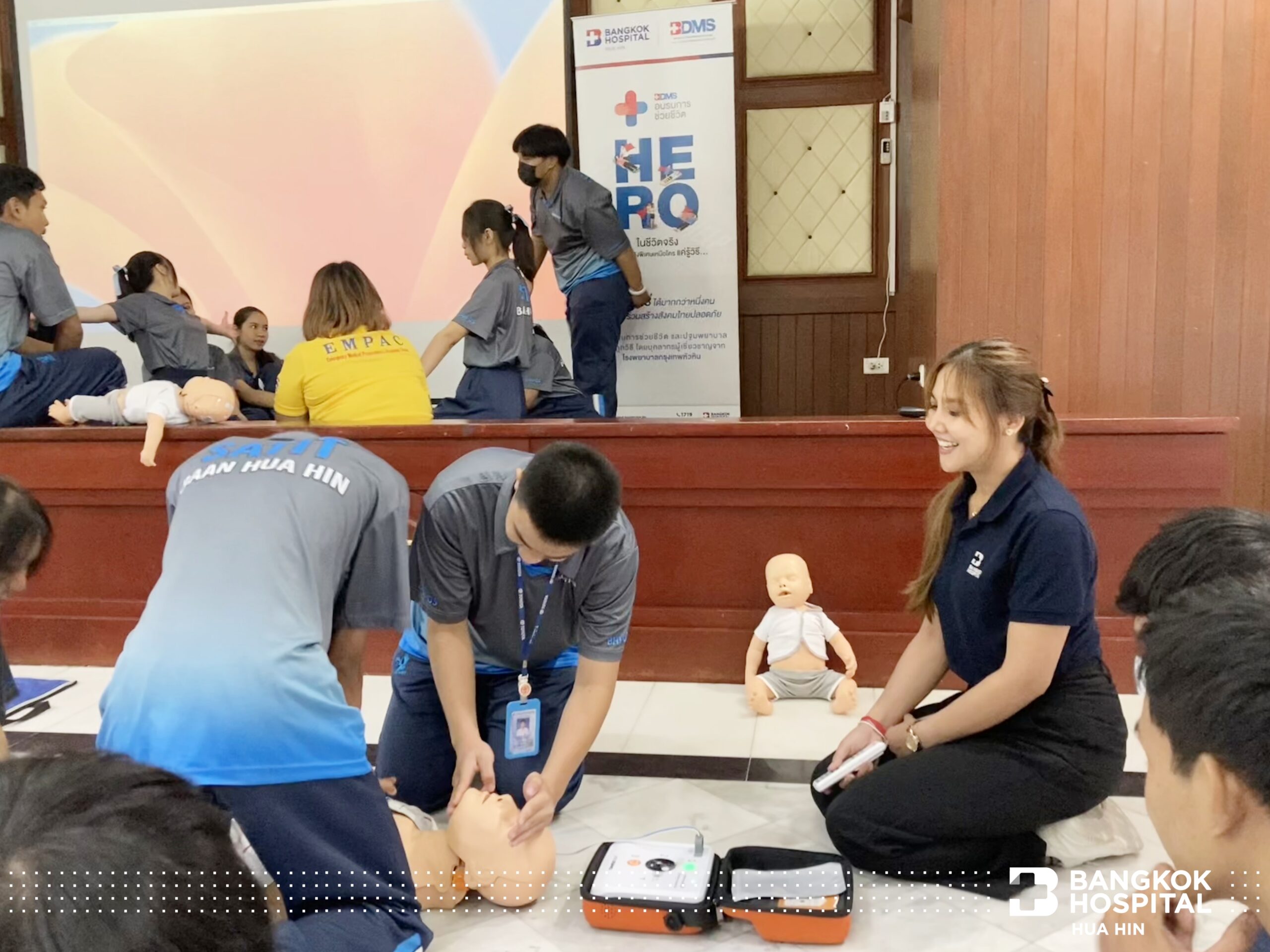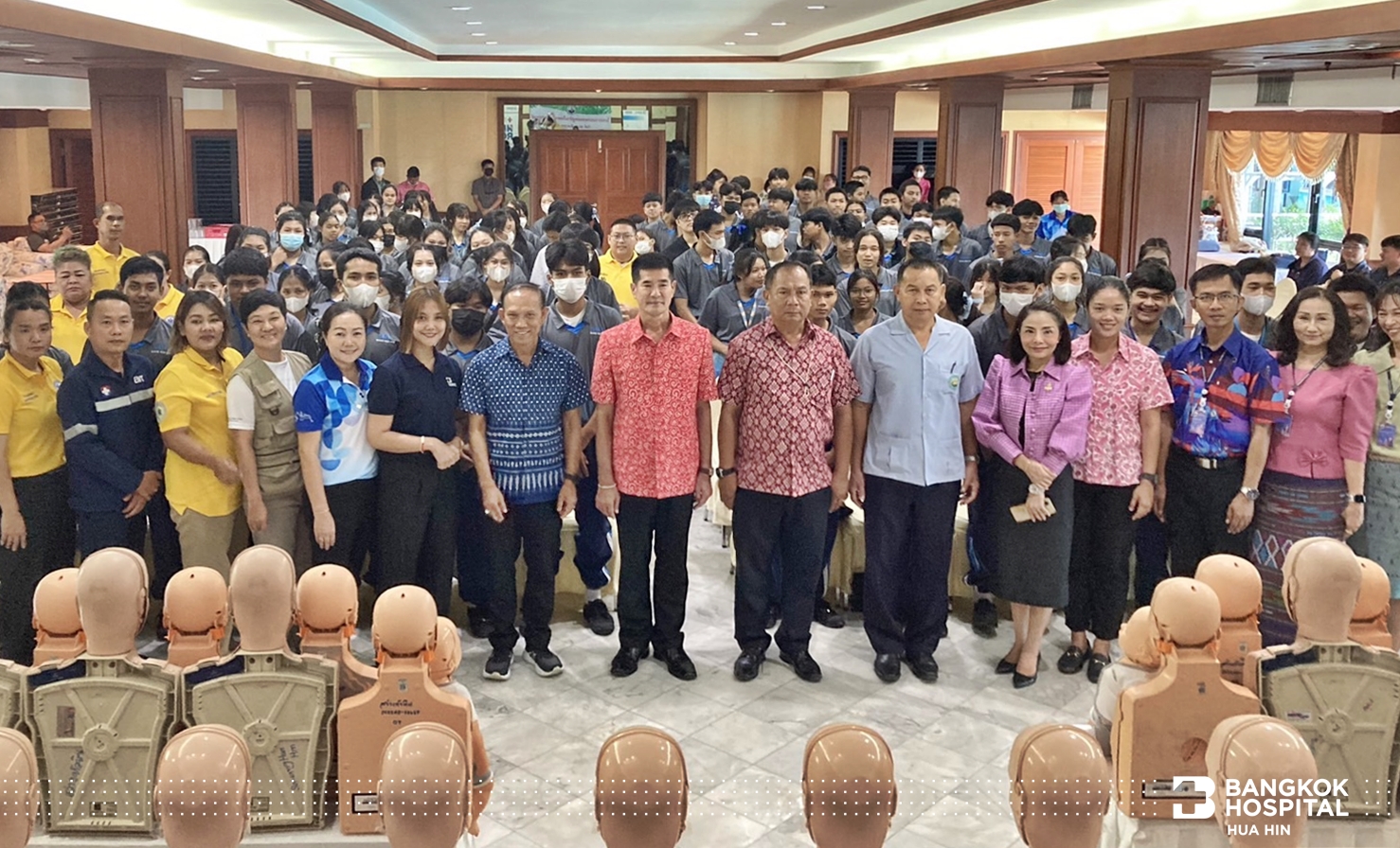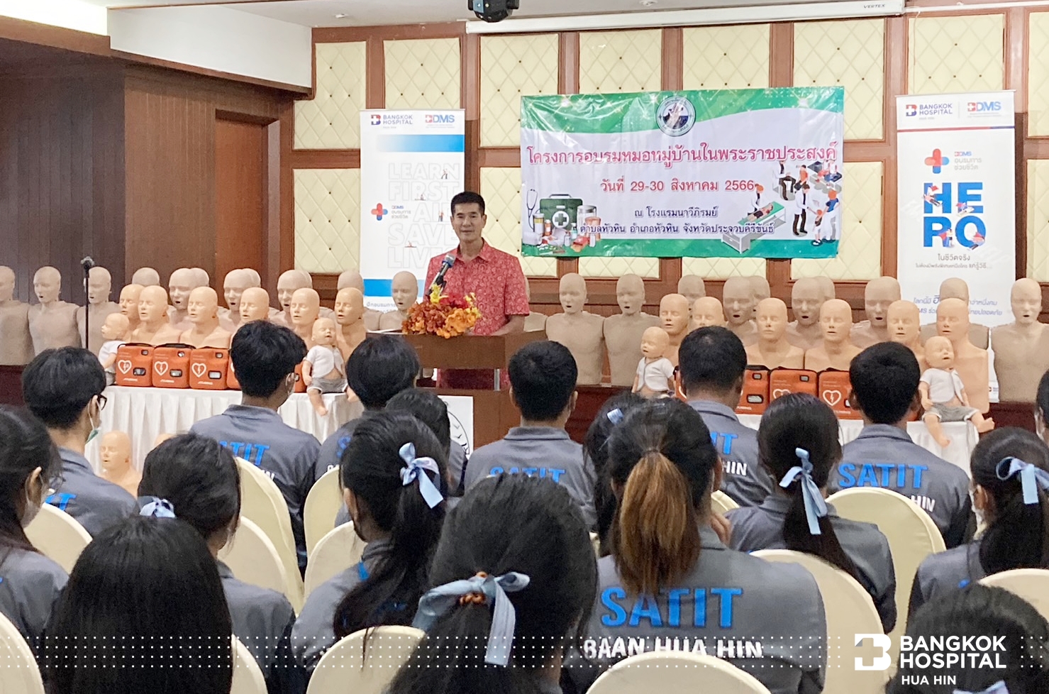 คุณนพพร วุฒิกุล นายกเทศมนตรีเมืองหัวหิน เป็นประธานในพิธีเปิดการอบรม “โครงการอบรมหมอหมู่บ้านในราชประสงค์” ประจำปีงบประมาณ 2566 จัดโดยงานส่งเสริมสุขภาพ กองสาธารณสุขและสิ่งแวดล้อม เทศบาลเมืองหัวหิน โครงการนี้จัดขึ้นด้วยความร่วมมือจากภาคีเครือข่ายในการสนับสนุนทีมวิทยากรผู้เชี่ยวชาญ ได้แก่ โรงพยาบาลกรุงเทพหัวหิน (BDMS อบรมการช่วยชีวิต รุ่นที่ 19 และ 20) มูลนิธิสว่างหัวหินธรรมสถาน และชมรม Share for Life Join for Love ร่วมถ่ายทอดความรู้ทั้งภาคทฤษฎีและการฝึกปฏิบัติในการช่วยชีวิตขั้นพื้นฐาน การปั๊มหัวใจ CPR การใช้เครื่อง AED กระตุกหัวใจด้วยไฟฟ้า และการปฐมพยาบาลเบื้องต้น ให้แก่นักเรียนจากโรงเรียนสาธิตเทศบาลบ้านหัวหิน ระดับชั้นม.4 – 6 และโรงเรียนเทศบาลบ้านบ่อฝ้าย ระดับชั้นม.1 – 3 รวมจำนวนกว่า 230 คน ณ โรงแรมนาวีภิรมย์หัวหิน เมื่อวันที่ 29 – 30 สิงหาคม ที่ผ่านมา