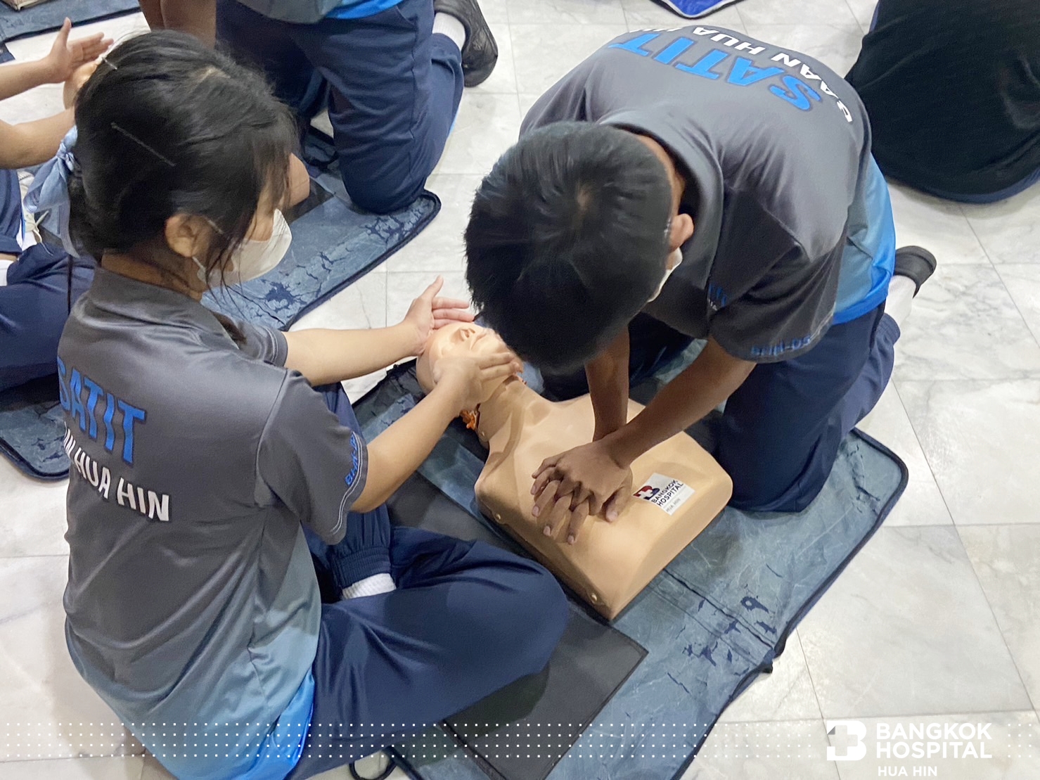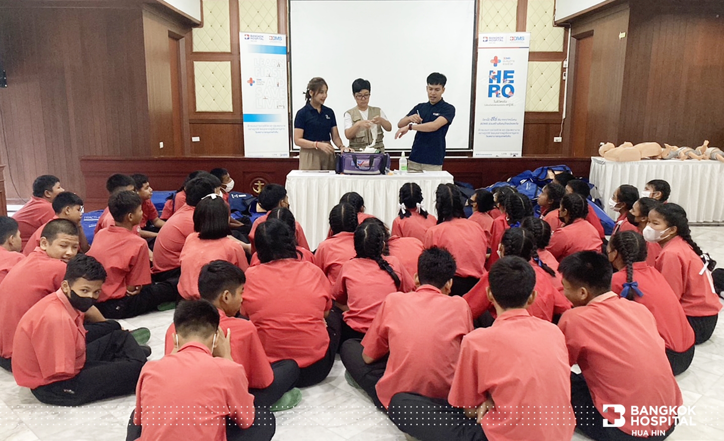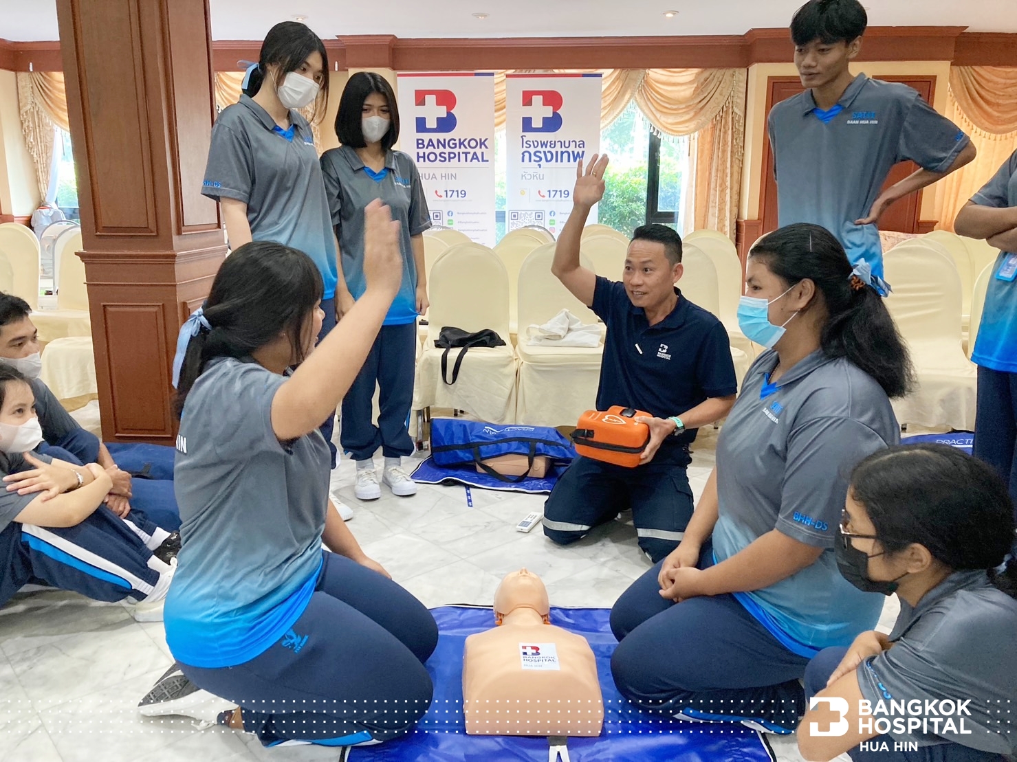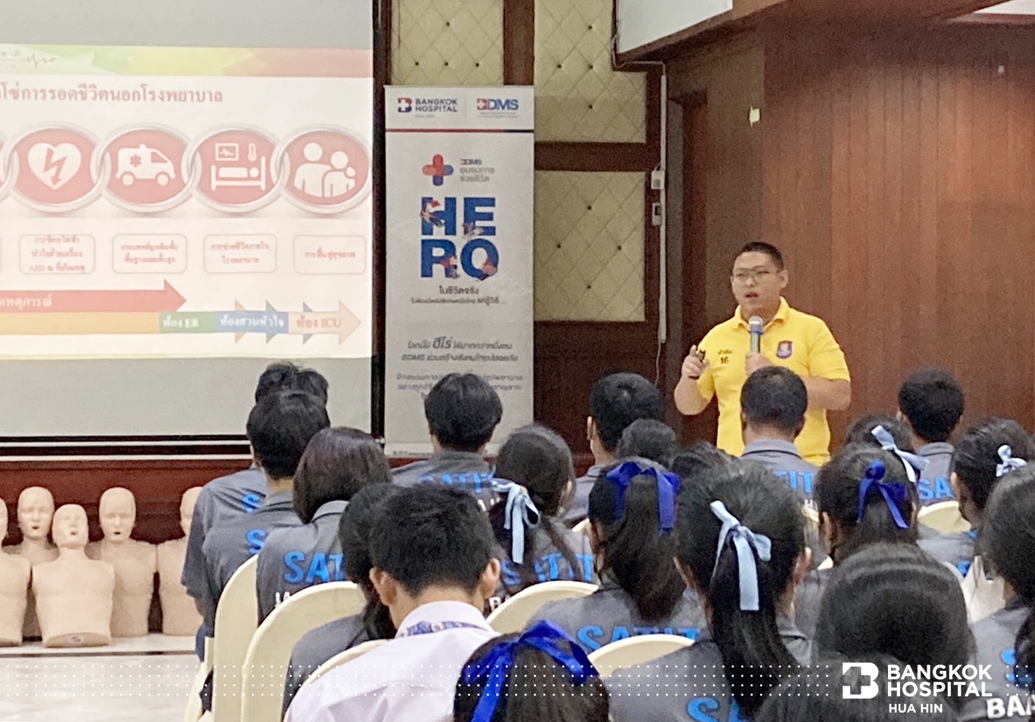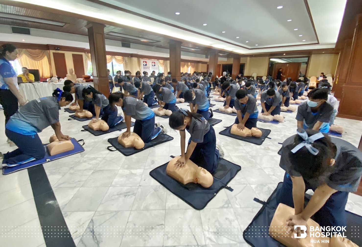 คุณนพพร วุฒิกุล นายกเทศมนตรีเมืองหัวหิน เป็นประธานในพิธีเปิดการอบรม “โครงการอบรมหมอหมู่บ้านในราชประสงค์” ประจำปีงบประมาณ 2566 จัดโดยงานส่งเสริมสุขภาพ กองสาธารณสุขและสิ่งแวดล้อม เทศบาลเมืองหัวหิน โครงการนี้จัดขึ้นด้วยความร่วมมือจากภาคีเครือข่ายในการสนับสนุนทีมวิทยากรผู้เชี่ยวชาญ ได้แก่ โรงพยาบาลกรุงเทพหัวหิน (BDMS อบรมการช่วยชีวิต รุ่นที่ 19 และ 20) มูลนิธิสว่างหัวหินธรรมสถาน และชมรม Share for Life Join for Love ร่วมถ่ายทอดความรู้ทั้งภาคทฤษฎีและการฝึกปฏิบัติในการช่วยชีวิตขั้นพื้นฐาน การปั๊มหัวใจ CPR การใช้เครื่อง AED กระตุกหัวใจด้วยไฟฟ้า และการปฐมพยาบาลเบื้องต้น ให้แก่นักเรียนจากโรงเรียนสาธิตเทศบาลบ้านหัวหิน ระดับชั้นม.4 – 6 และโรงเรียนเทศบาลบ้านบ่อฝ้าย ระดับชั้นม.1 – 3 รวมจำนวนกว่า 230 คน ณ โรงแรมนาวีภิรมย์หัวหิน เมื่อวันที่ 29 – 30 สิงหาคม ที่ผ่านมา