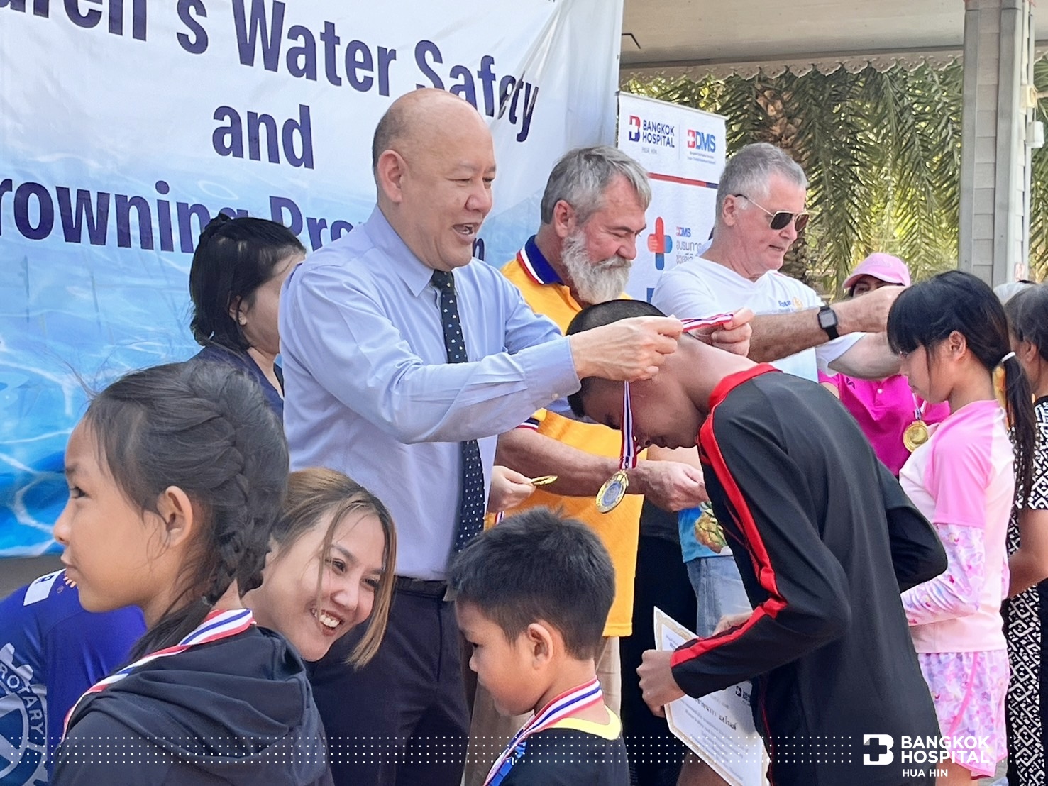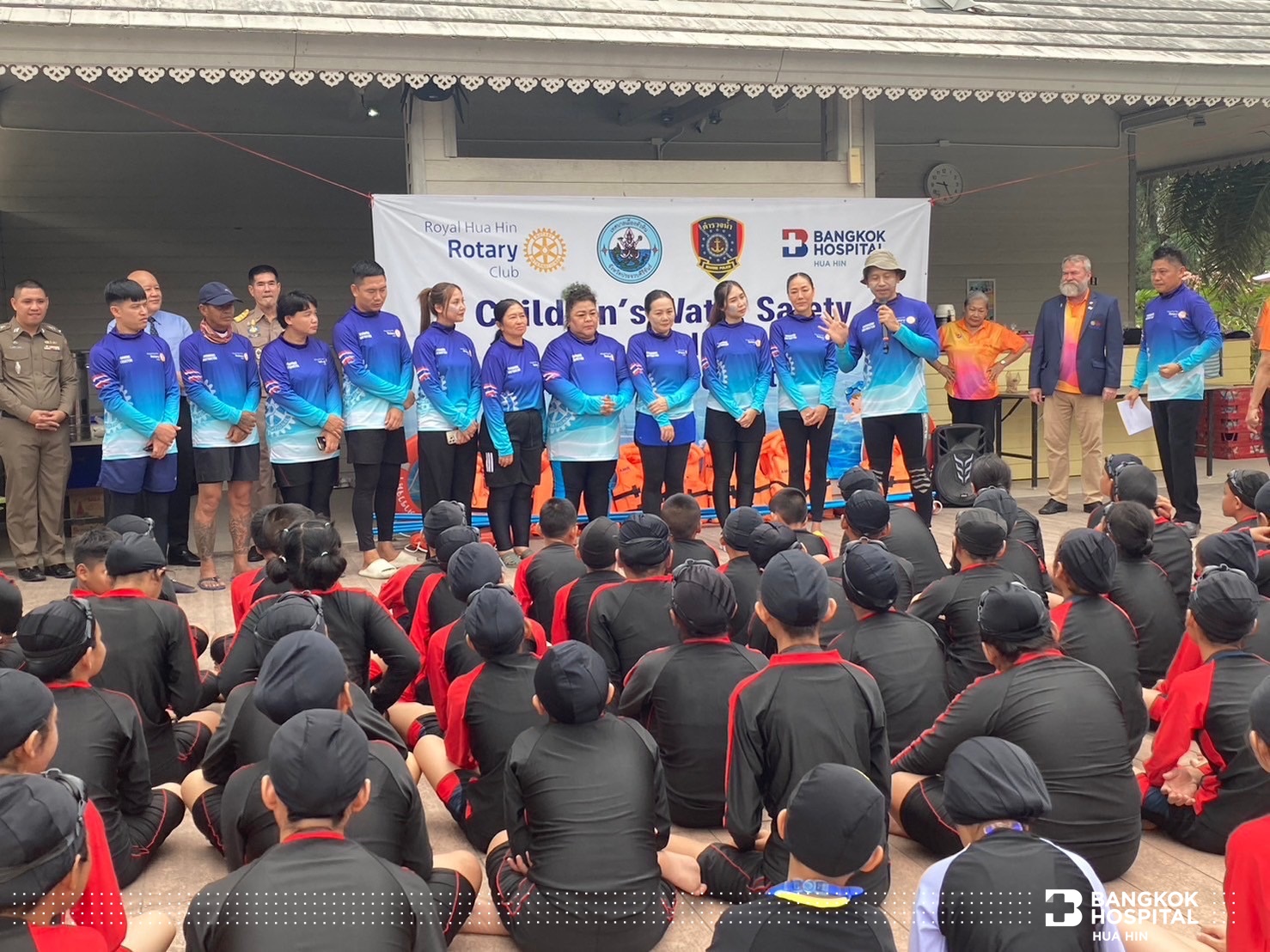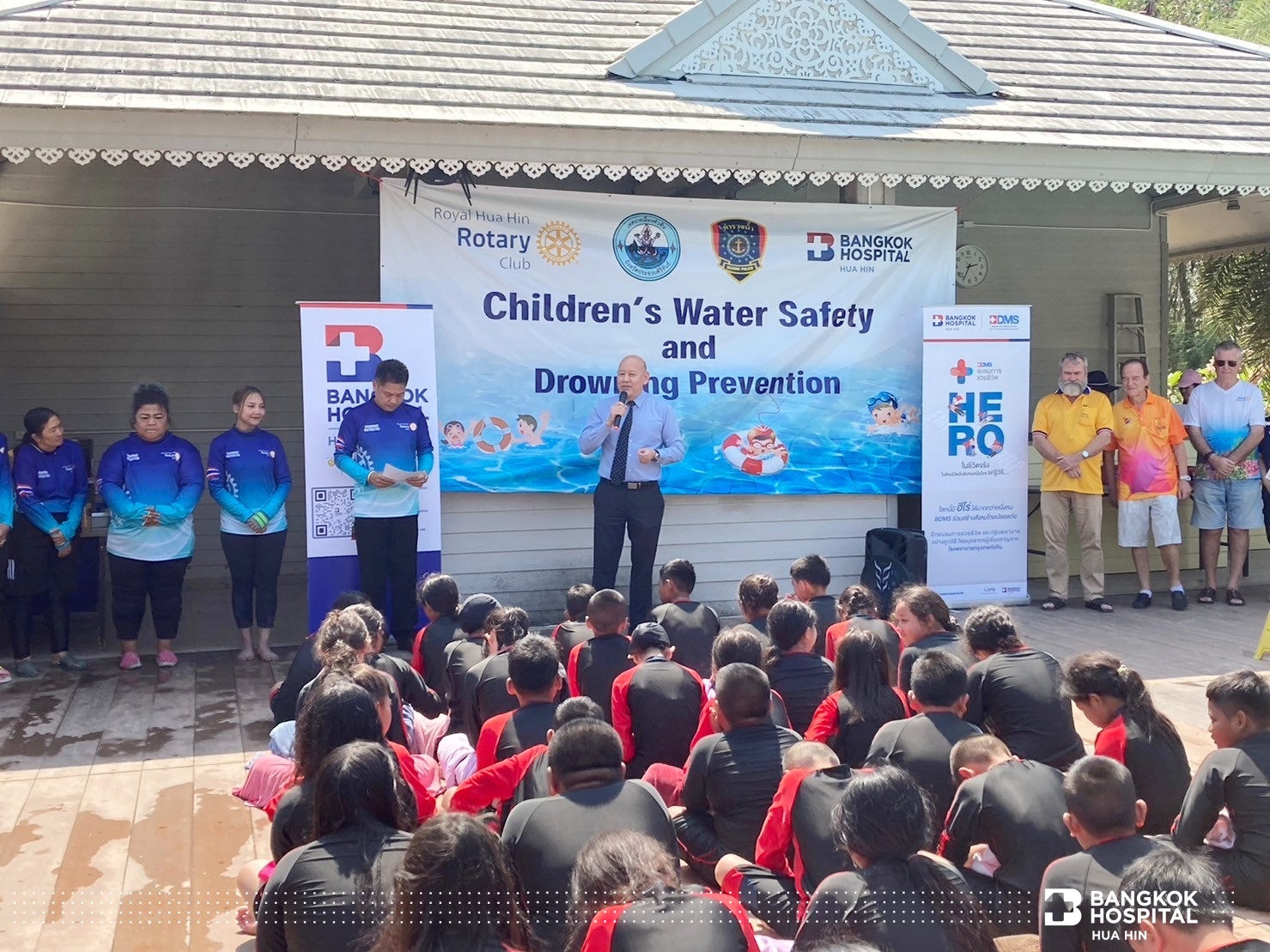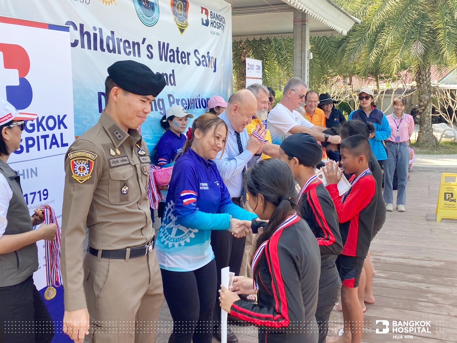 นายกก่อตั้งคุณ Alan Cooper ประธานโครงการสอนน้องว่ายน้ำเพื่อเอาชีวิตรอดสโมสรโรตารีรอยัลหัวหิน คุณ Brian Anderson นายกสโมสรโรตารีรอยัลหัวหิน พร้อมด้วย คุณนพพร วุฒิกุล นายกเทศมนตรีเทศบาลเมืองหัวหิน พันตำรวจโท เทพรัตน์ ถมฉิมพลี สารวัตรตำรวจน้ำปราณบุรี และ นายแพทย์พงษ์ศักดิ์ บุญยะลีพรรณ ผู้ช่วยผู้อำนวยการโรงพยาบาลกรุงเทพหัวหิน ร่วมกันเป็นประธานในการเปิดโครงการสอนน้องว่ายน้ำเพื่อเอาชีวิตรอด (Children’s Water Safety & Drowning Prevention)