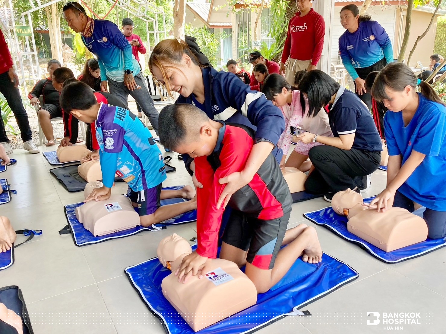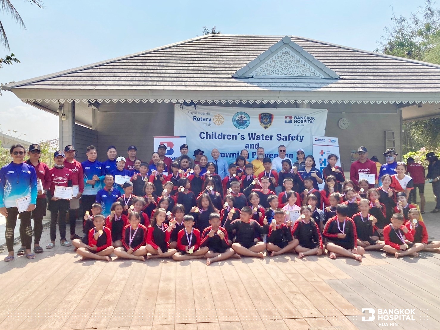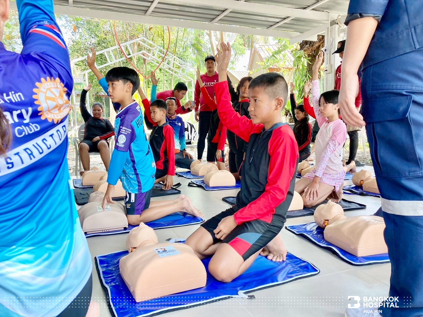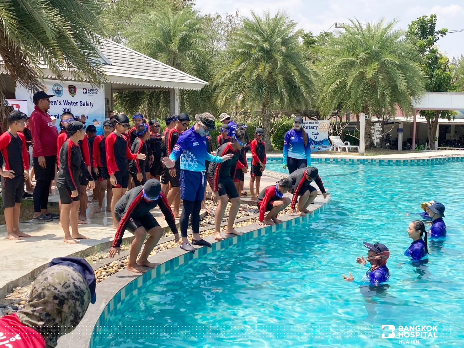 โครงการนี้จัดขึ้นด้วยความร่วมมือจากภาคีเครือข่ายในการสนับสนุนทีมวิทยากรผู้เชี่ยวชาญ ได้แก่ สโมสรโรตารีรอยัลหัวหิน เทศบาลเมืองหัวหิน สถานีตำรวจน้ำปราณบุรี และโรงพยาบาลกรุงเทพหัวหิน ถ่ายทอดความรู้สร้างทักษะให้เด็กและเยาวชนในการช่วยเหลือตนเองสามารถเอาชีวิตรอดจากการจมน้ำได้ด้วยการลอยตัวอยู่ในน้ำและให้ความรู้การช่วยเหลือผู้ประสบภัยทางน้ำ ทักษะการเอาชีวิตรอด ตะโกน โยน ยื่น และการช่วยชีวิตด้วยการปั๊มหัวใจ CPR การใช้เครื่อง AED กระตุกหัวใจด้วยไฟฟ้า ให้แก่นักเรียนชั้นประถมศึกษาปีที่ 5 โรงเรียนสาธิตเทศบาลบ้านหัวหิน เข้าร่วมการฝึกอบรม จำนวน 63 คน ในวันที่ 12 – 14 มีนาคม 2567 ณ สระว่ายน้ำ Greenway Hua Hin Resort ต.หินเหล็กไฟ อ.หัวหิน จ.ประจวบคีรีขันธ์