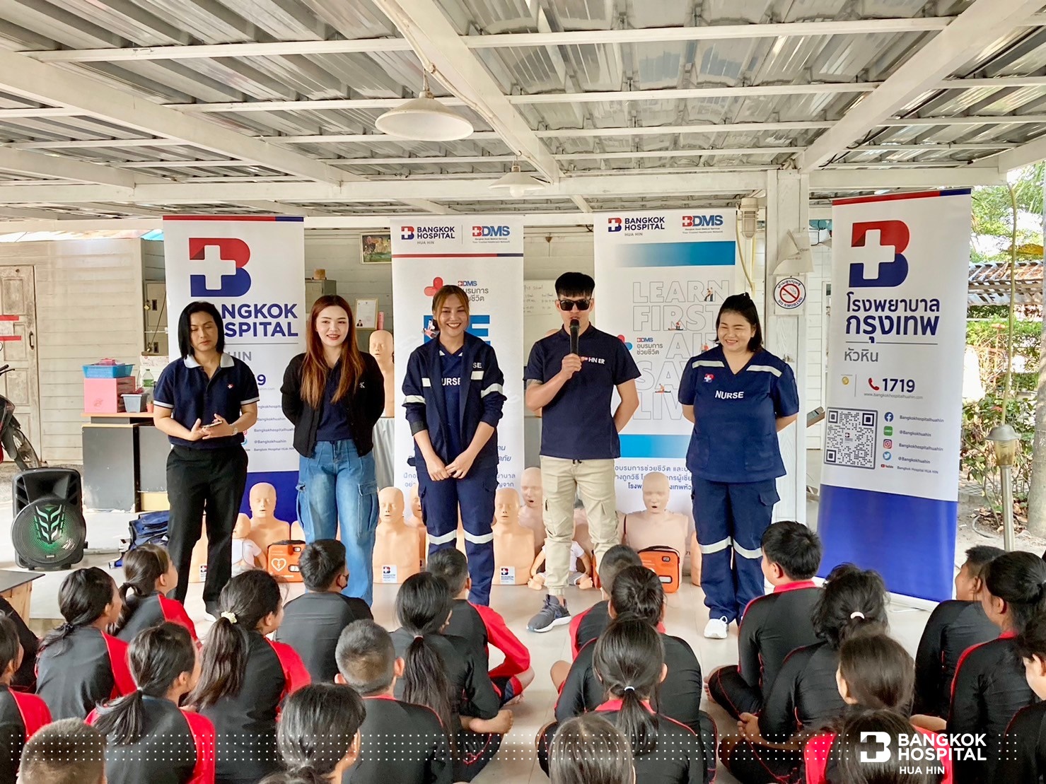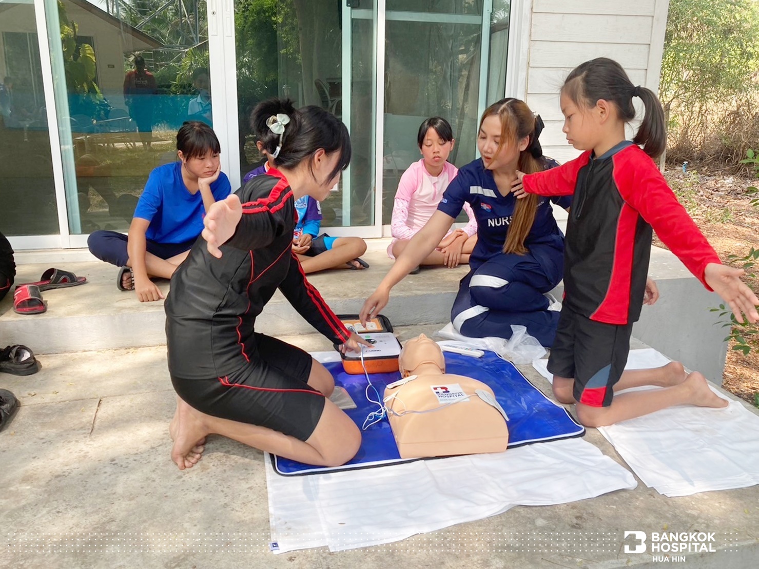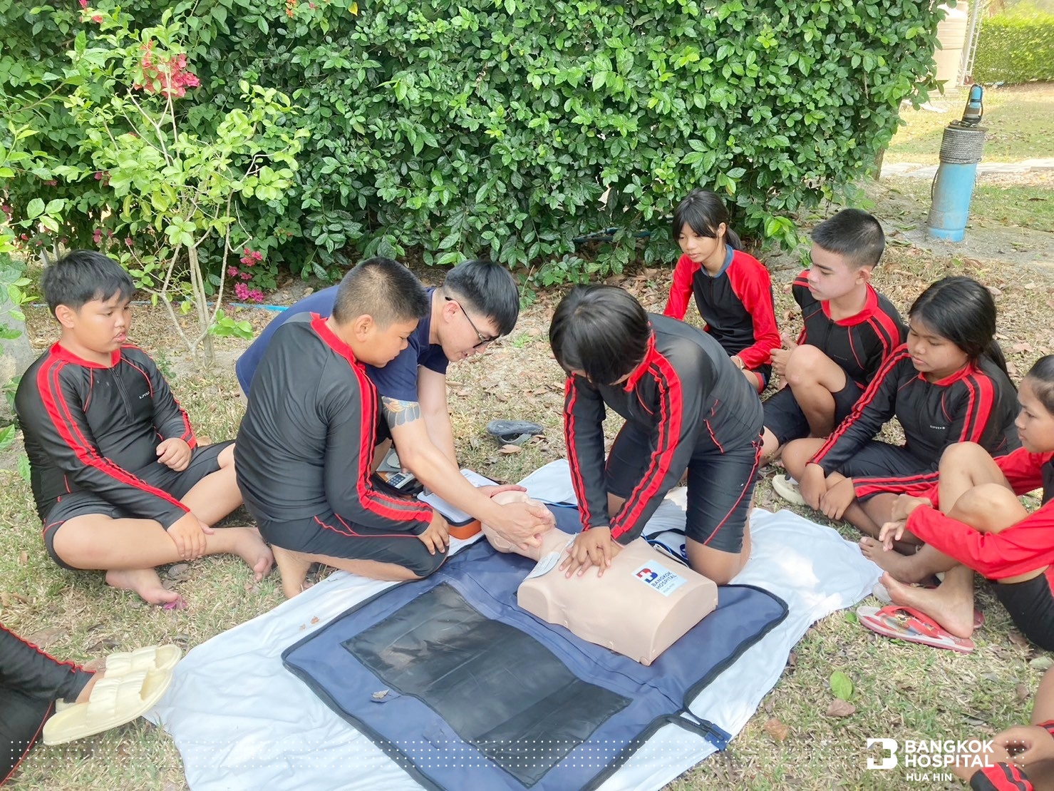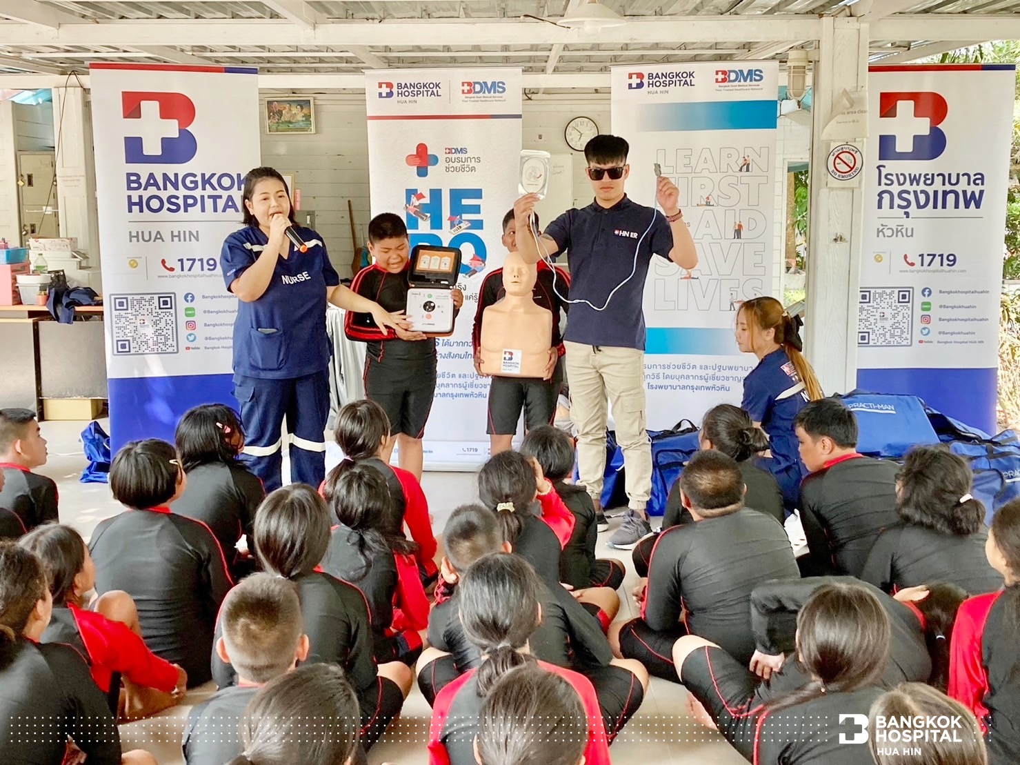 โครงการนี้จัดขึ้นด้วยความร่วมมือจากภาคีเครือข่ายในการสนับสนุนทีมวิทยากรผู้เชี่ยวชาญ ได้แก่ สโมสรโรตารีรอยัลหัวหิน เทศบาลเมืองหัวหิน สถานีตำรวจน้ำปราณบุรี และโรงพยาบาลกรุงเทพหัวหิน ถ่ายทอดความรู้สร้างทักษะให้เด็กและเยาวชนในการช่วยเหลือตนเองสามารถเอาชีวิตรอดจากการจมน้ำได้ด้วยการลอยตัวอยู่ในน้ำและให้ความรู้การช่วยเหลือผู้ประสบภัยทางน้ำ ทักษะการเอาชีวิตรอด ตะโกน โยน ยื่น และการช่วยชีวิตด้วยการปั๊มหัวใจ CPR การใช้เครื่อง AED กระตุกหัวใจด้วยไฟฟ้า ให้แก่นักเรียนชั้นประถมศึกษาปีที่ 5 โรงเรียนสาธิตเทศบาลบ้านหัวหิน เข้าร่วมการฝึกอบรม จำนวน 63 คน ในวันที่ 12 – 14 มีนาคม 2567 ณ สระว่ายน้ำ Greenway Hua Hin Resort ต.หินเหล็กไฟ อ.หัวหิน จ.ประจวบคีรีขันธ์