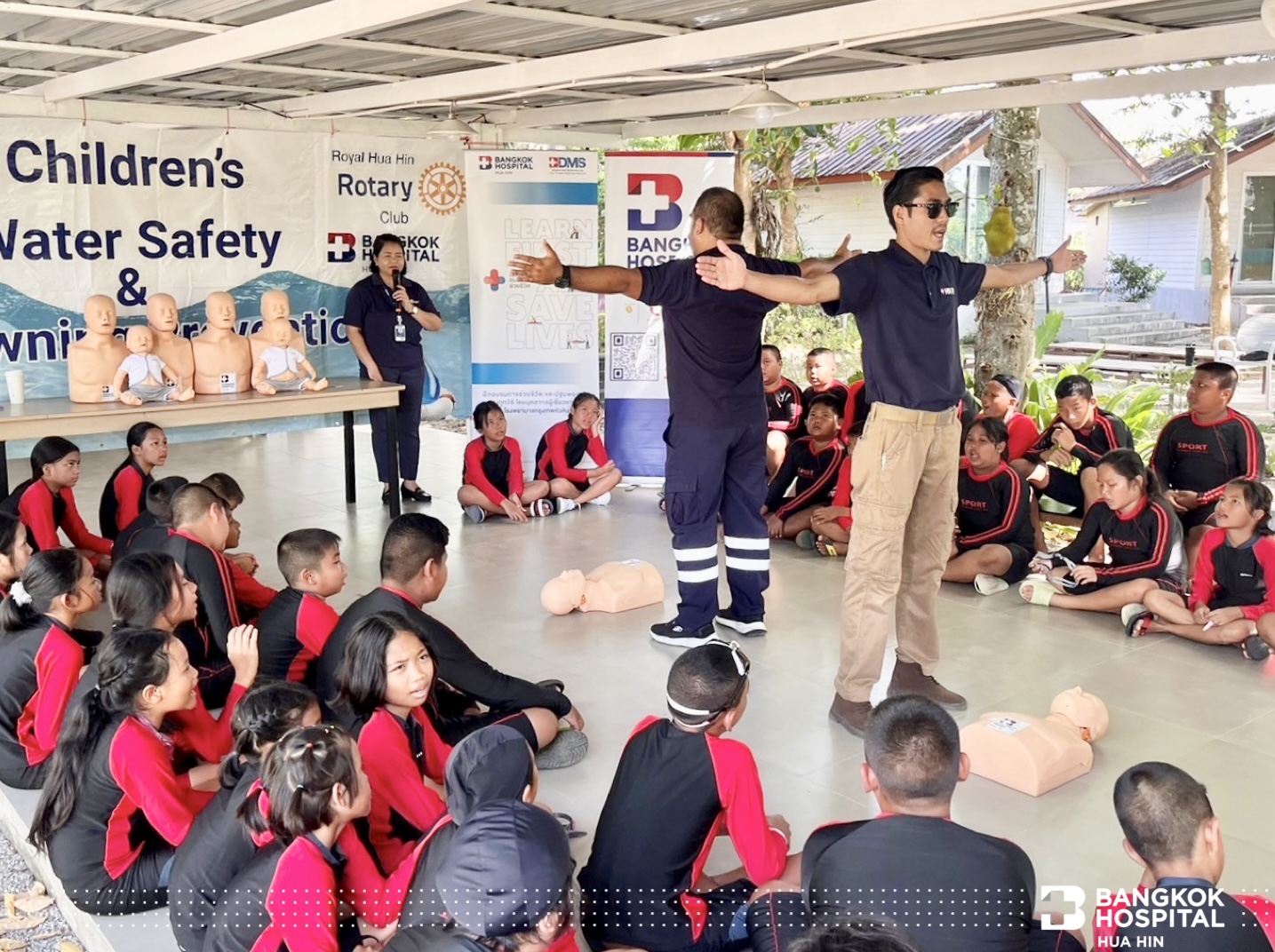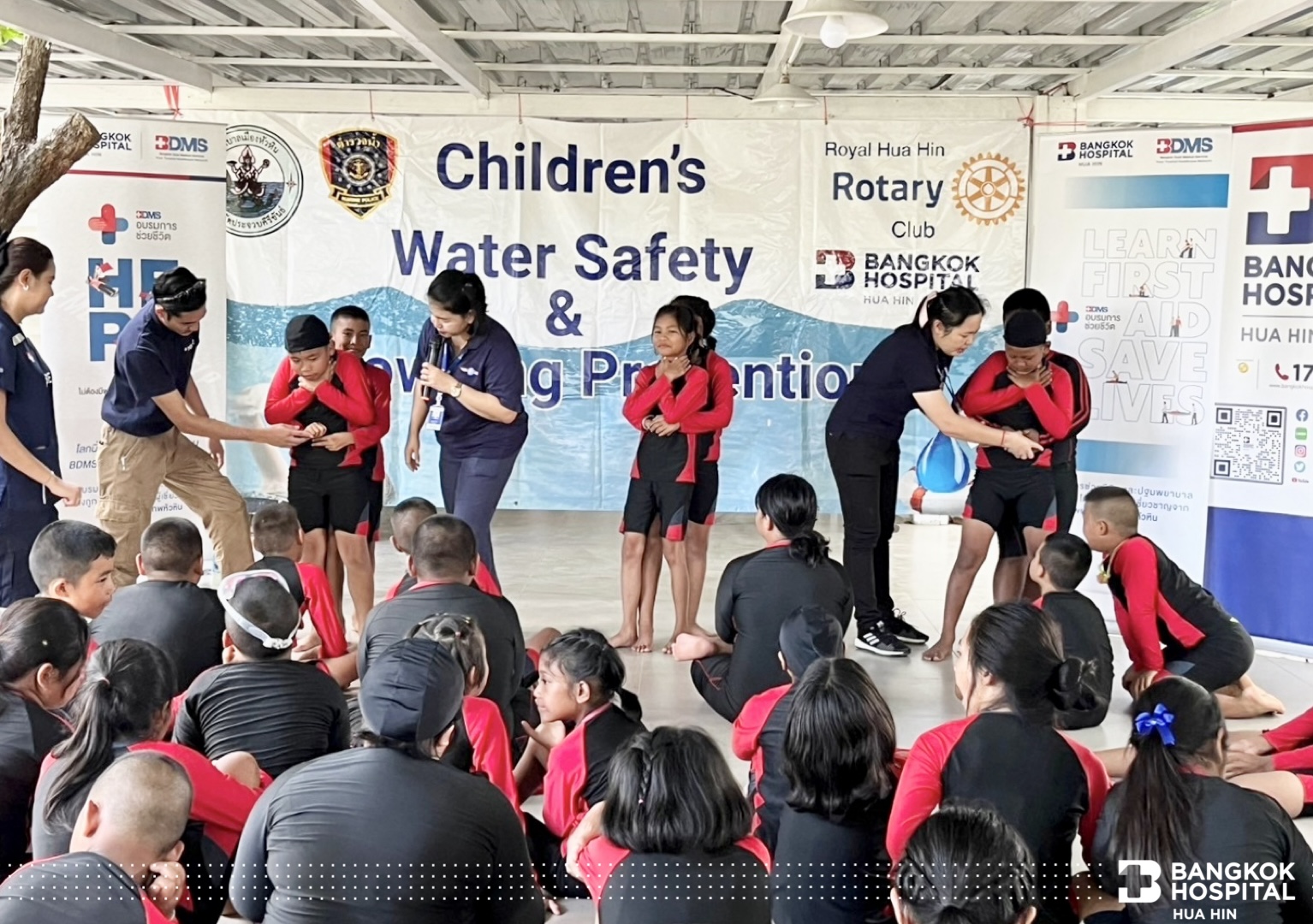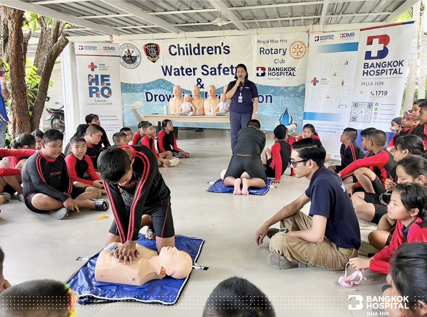 โรงพยาบาลกรุงเทพหัวหิน ร่วมเป็นวิทยากรในโครงการสอนน้องว่ายน้ำเพื่อเอาชีวิตรอด (Children’s Water Safety & Drowning Prevention) จัดโดยสโมสรโรตารีรอยัลหัวหิน ร่วมกับภาคีเครือข่าย เทศบาลเมืองหัวหิน สถานีตำรวจน้ำปราณบุรี โดยโรงพยาบาลกรุงเทพหัวหินให้การอบรมการช่วยชีวิตขั้นพื้นฐาน ด้วยการปั๊มหัวใจ (CPR) กับหุ่นฝึกกู้ชีพ การใช้เครื่องกระตุกหัวใจด้วยไฟฟ้าชนิดอัตโนมัติ (AED) และการช่วยเหลือผู้ป่วยสำลักอุดกั้นทางเดินหายใจ (Choking) ให้แก่นักเรียนโรงเรียนเทศบาลวัดหนองแก และโรงเรียนเทศบาลบ้านเขาเต่า ในวันที่ 14 มิถุนายน 2567 ณ Greenway Hua Hin Resort ต.หินเหล็กไฟ อ.หัวหิน จ.ประจวบคีรีขันธ์
