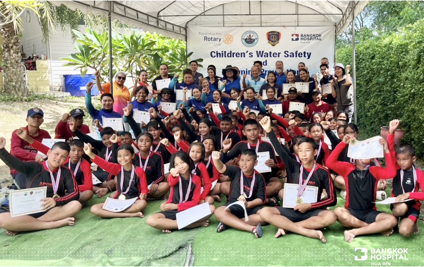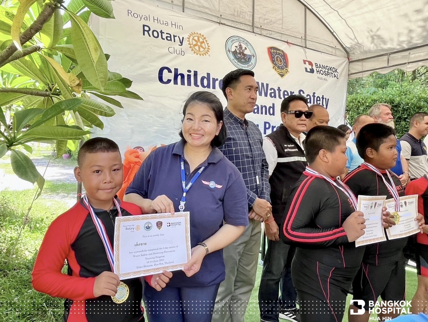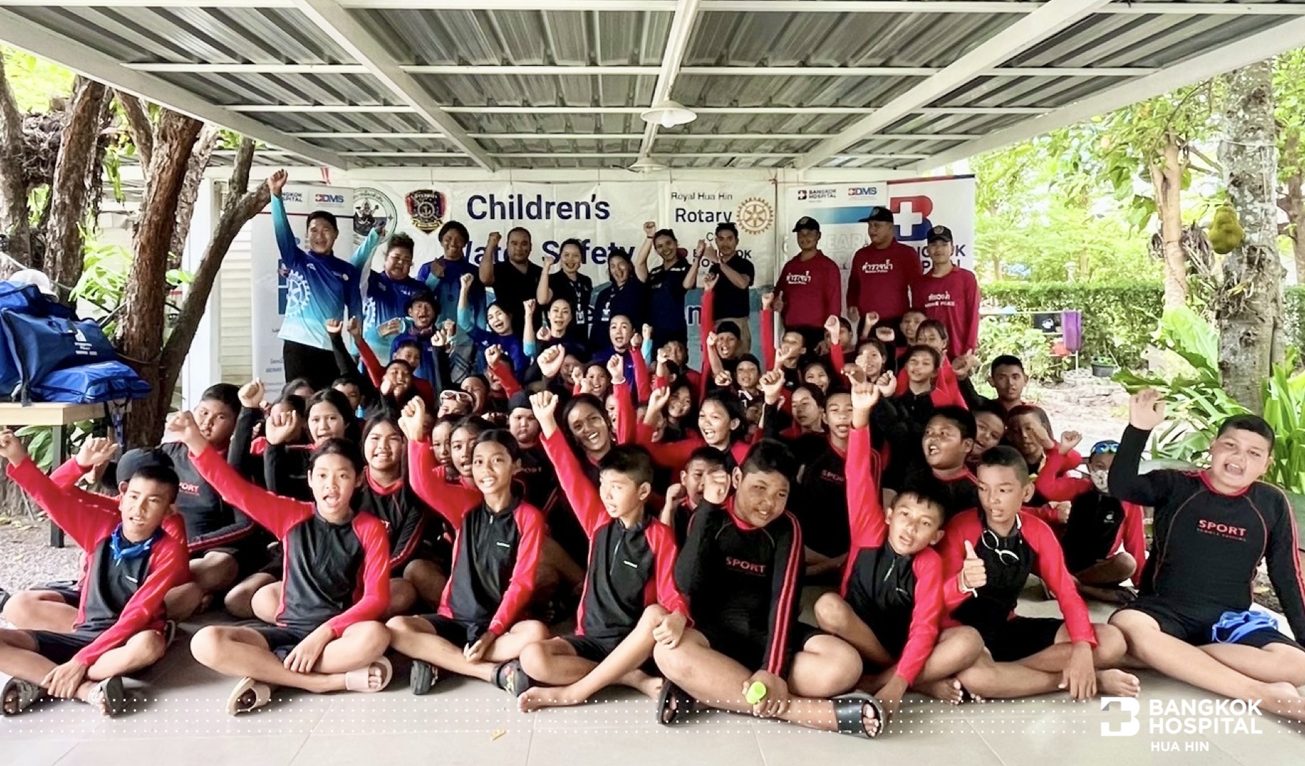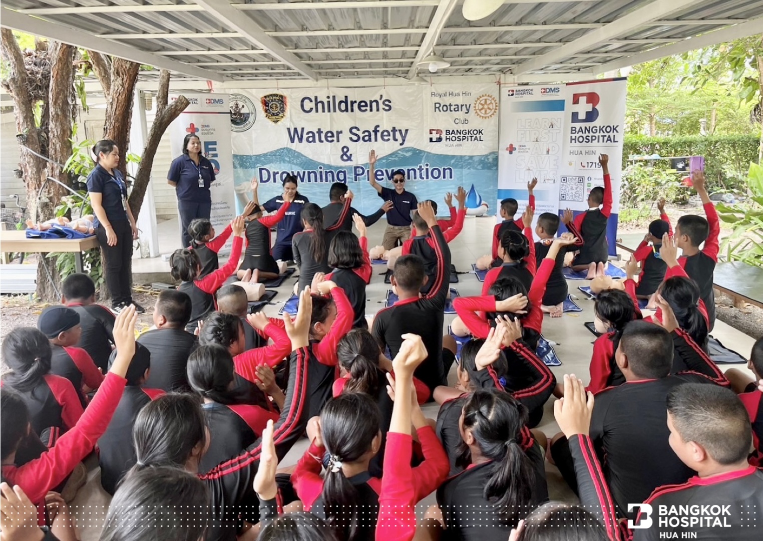โรงพยาบาลกรุงเทพหัวหิน ร่วมเป็นวิทยากรในโครงการสอนน้องว่ายน้ำเพื่อเอาชีวิตรอด (Children’s Water Safety & Drowning Prevention) จัดโดยสโมสรโรตารีรอยัลหัวหิน ร่วมกับภาคีเครือข่าย เทศบาลเมืองหัวหิน สถานีตำรวจน้ำปราณบุรี โดยโรงพยาบาลกรุงเทพหัวหินให้การอบรมการช่วยชีวิตขั้นพื้นฐาน ด้วยการปั๊มหัวใจ (CPR) กับหุ่นฝึกกู้ชีพ การใช้เครื่องกระตุกหัวใจด้วยไฟฟ้าชนิดอัตโนมัติ (AED) และการช่วยเหลือผู้ป่วยสำลักอุดกั้นทางเดินหายใจ (Choking) ให้แก่นักเรียนโรงเรียนเทศบาลวัดหนองแก และโรงเรียนเทศบาลบ้านเขาเต่า ในวันที่ 14 มิถุนายน 2567 ณ Greenway Hua Hin Resort ต.หินเหล็กไฟ อ.หัวหิน จ.ประจวบคีรีขันธ์