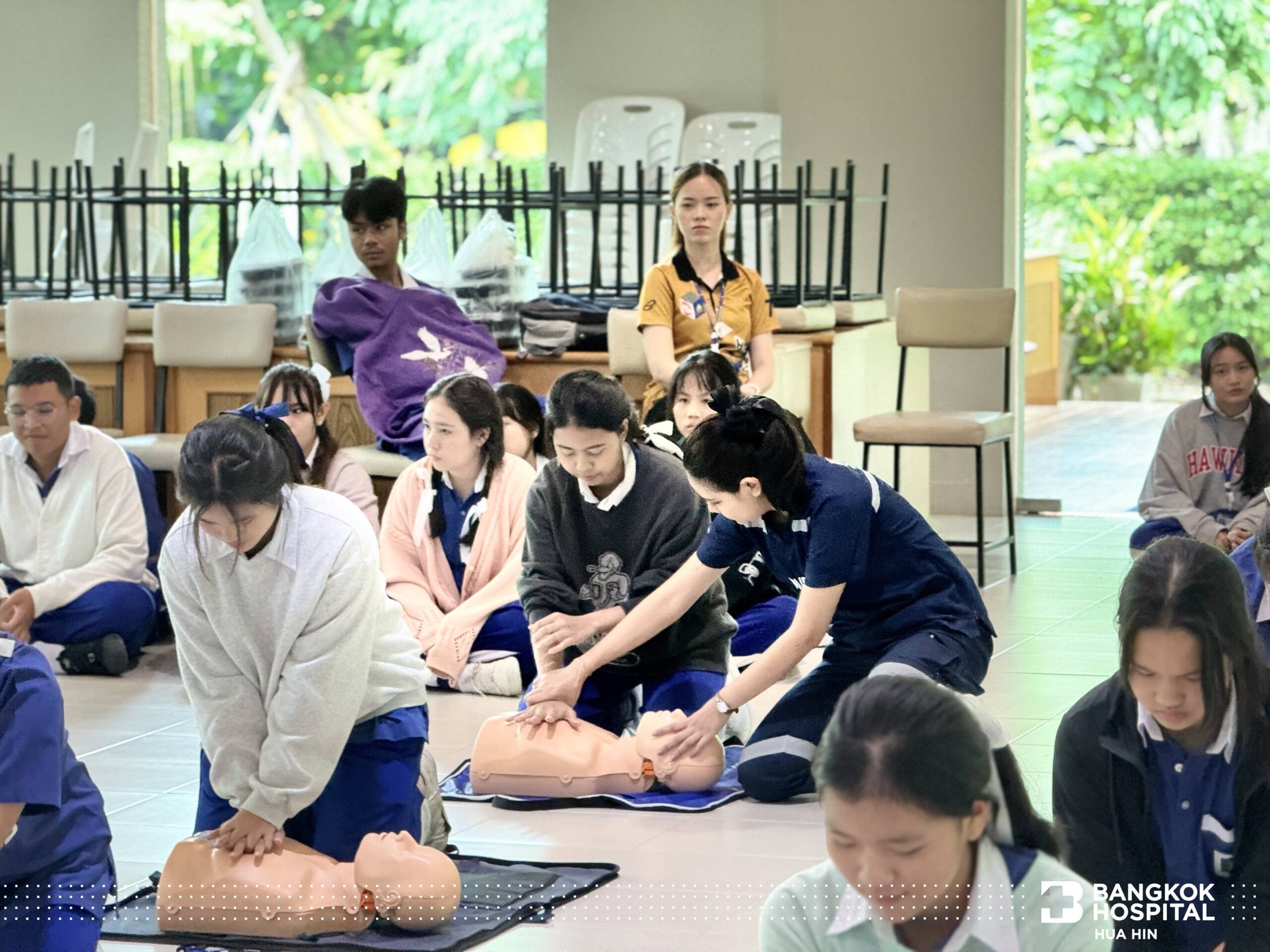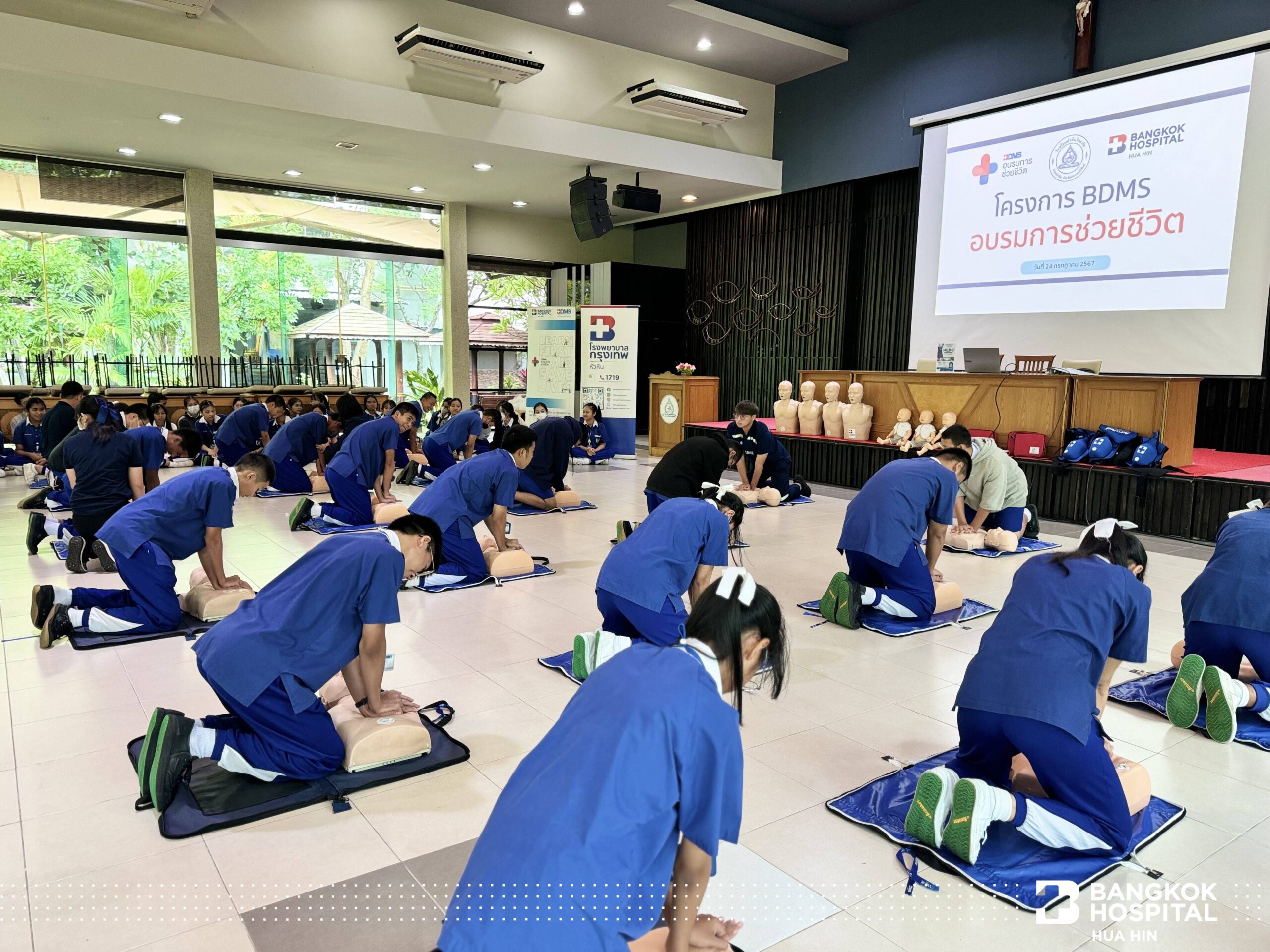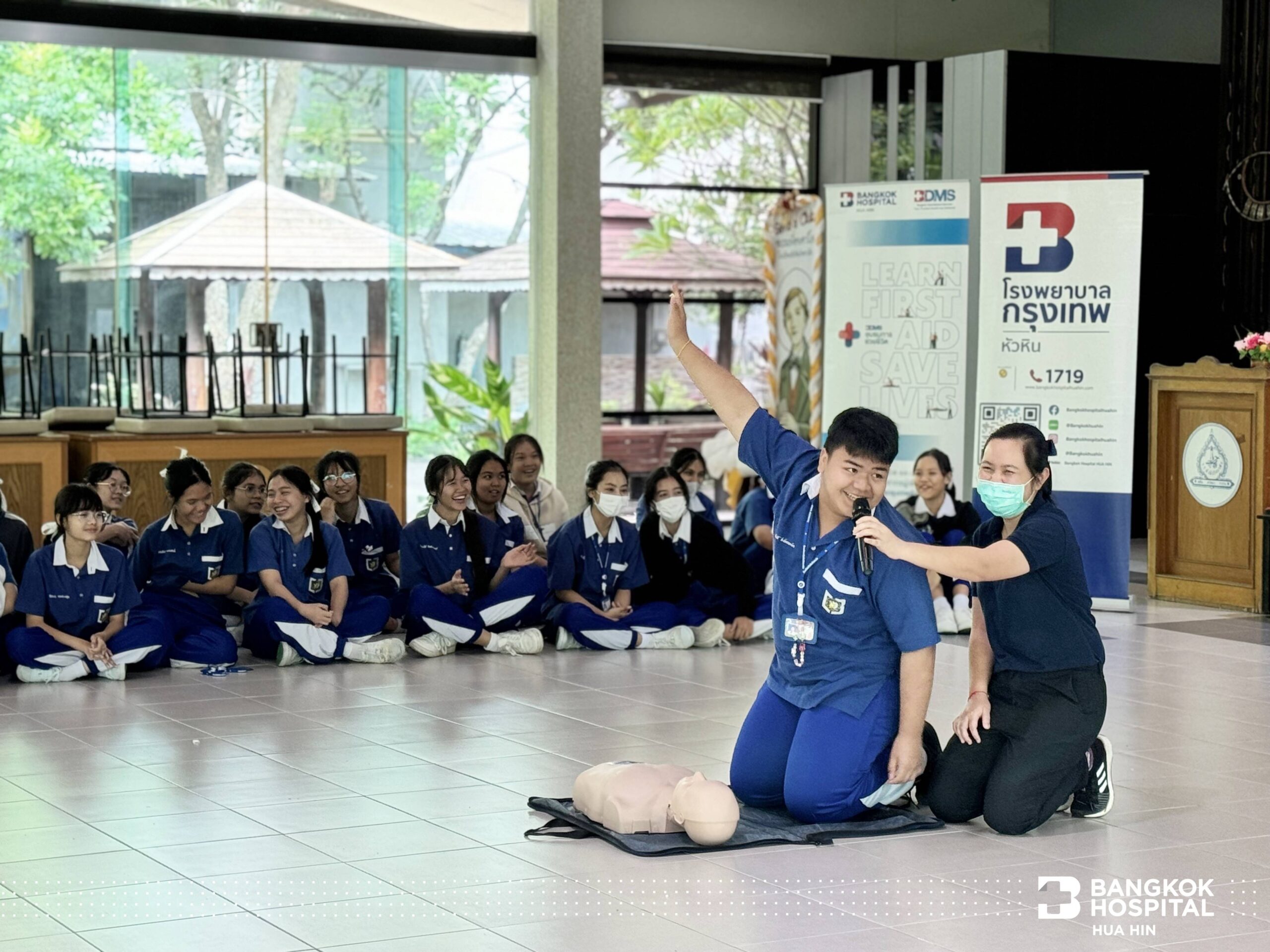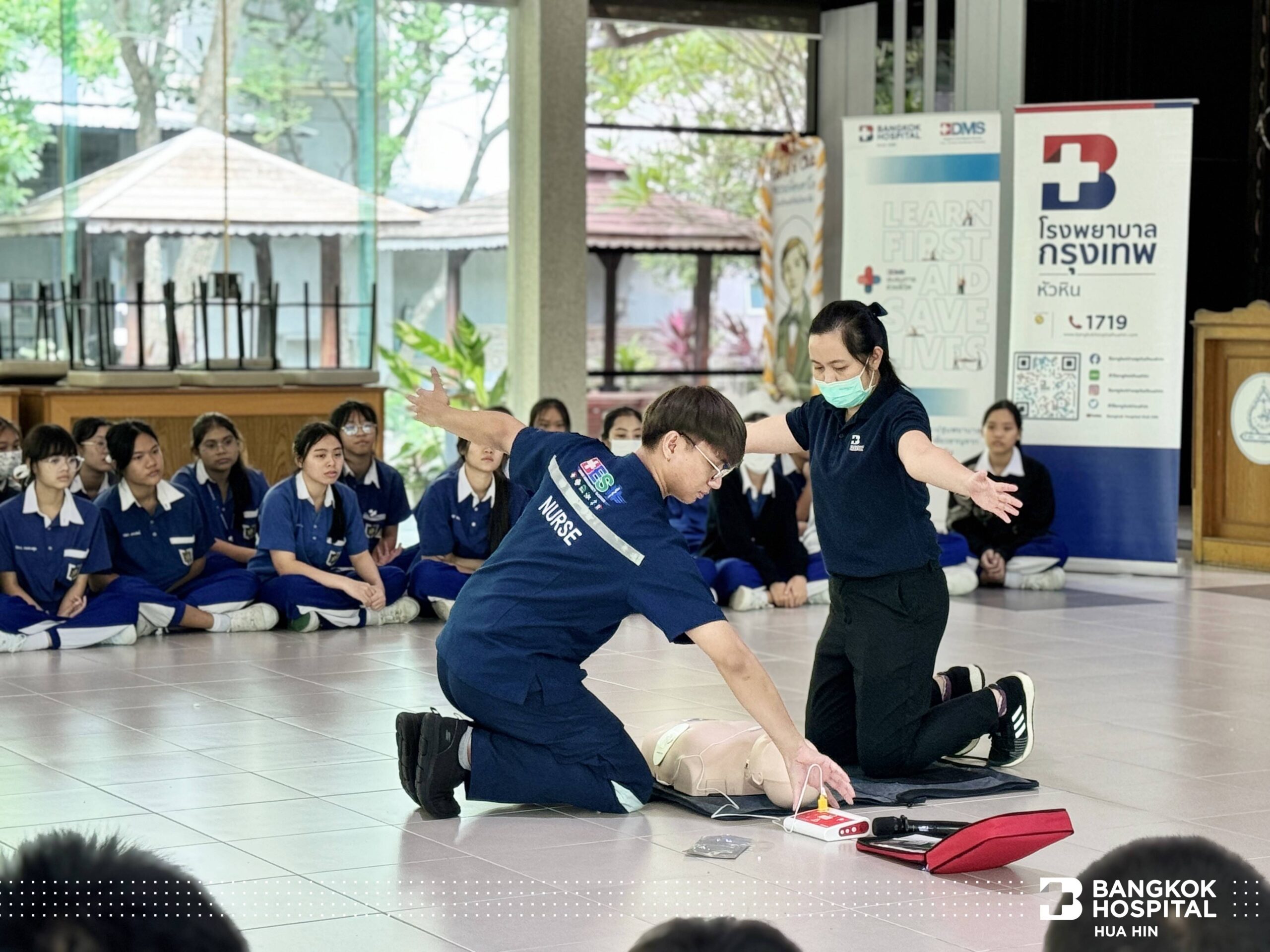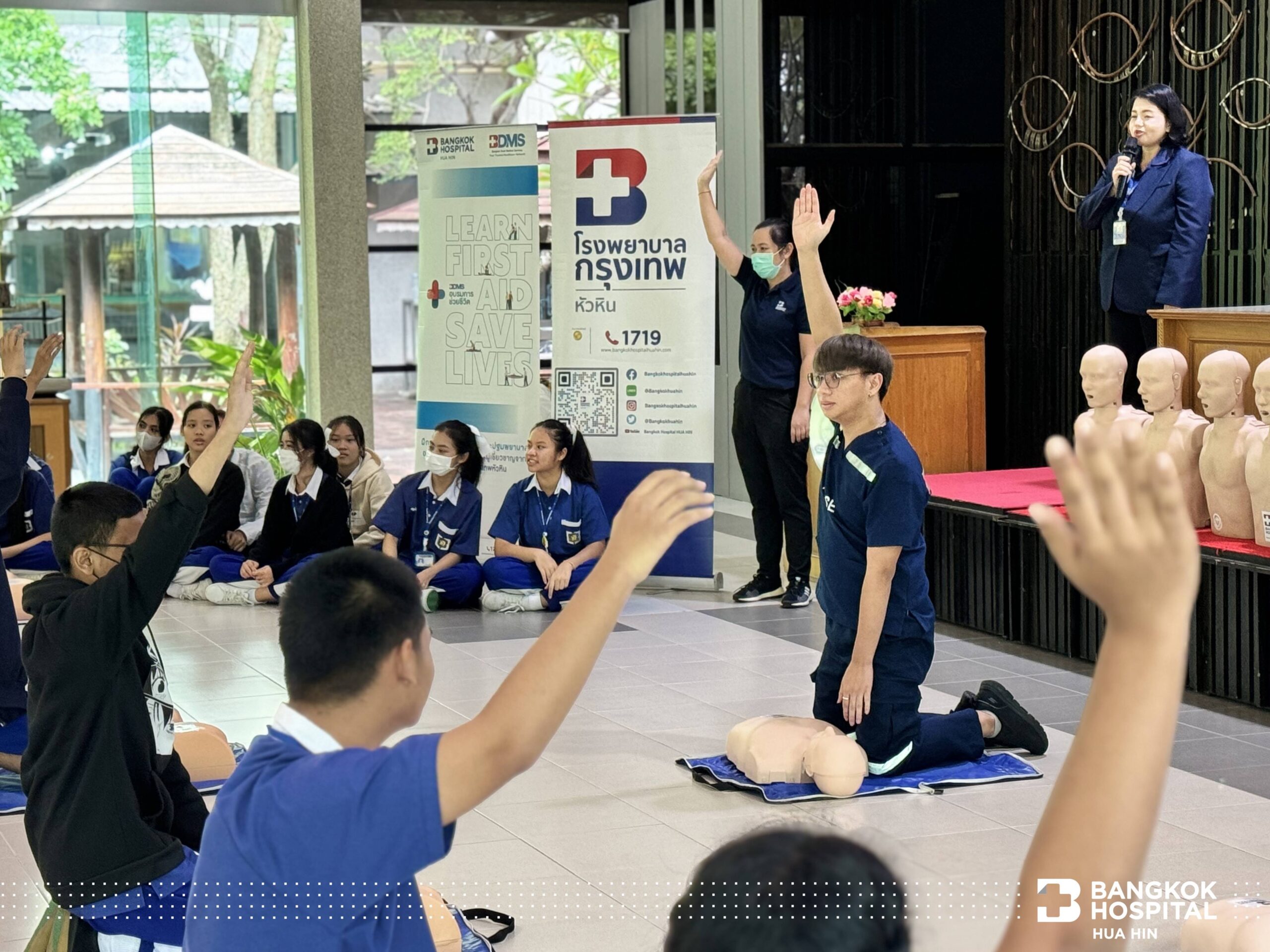 โดยทีมวิทยากรผู้เชี่ยวชาญจากโรงพยาบาลกรุงเทพหัวหิน พร้อมด้วยเจ้าหน้าที่กองสาธารณสุข เทศบาลเมืองหัวหิน และอุปกรณ์หุ่นฝึกส่วนหนึ่งร่วมสนับสนุนจากมูลนิธิสว่างหัวหินธรรมสถาน เพื่อถ่ายทอดความรู้ทั้งภาคทฤษฎีและการฝึกปฏิบัติจริงในการช่วยเหลือผู้ที่หัวใจหยุดเต้นด้วยการปั๊มหัวใจ CPR และการใช้เครื่องกระตุกหัวใจด้วยไฟฟ้า AED ให้แก่นักเรียนโรงเรียนหัวหินวิทยาลัย ในวันที่ 24 กรกฎาคม 2567 จำนวน 120 คน เพื่อให้น้องๆ นักเรียนเยาวชน มีความรู้พื้นฐานในการกู้ชีพและมีความมั่นใจในการช่วยชีวิตหรือการขอความช่วยเหลือได้อย่างถูกต้อง เป็นการเพิ่มโอกาสในการรอดชีวิตก่อนส่งถึงมือแพทย์