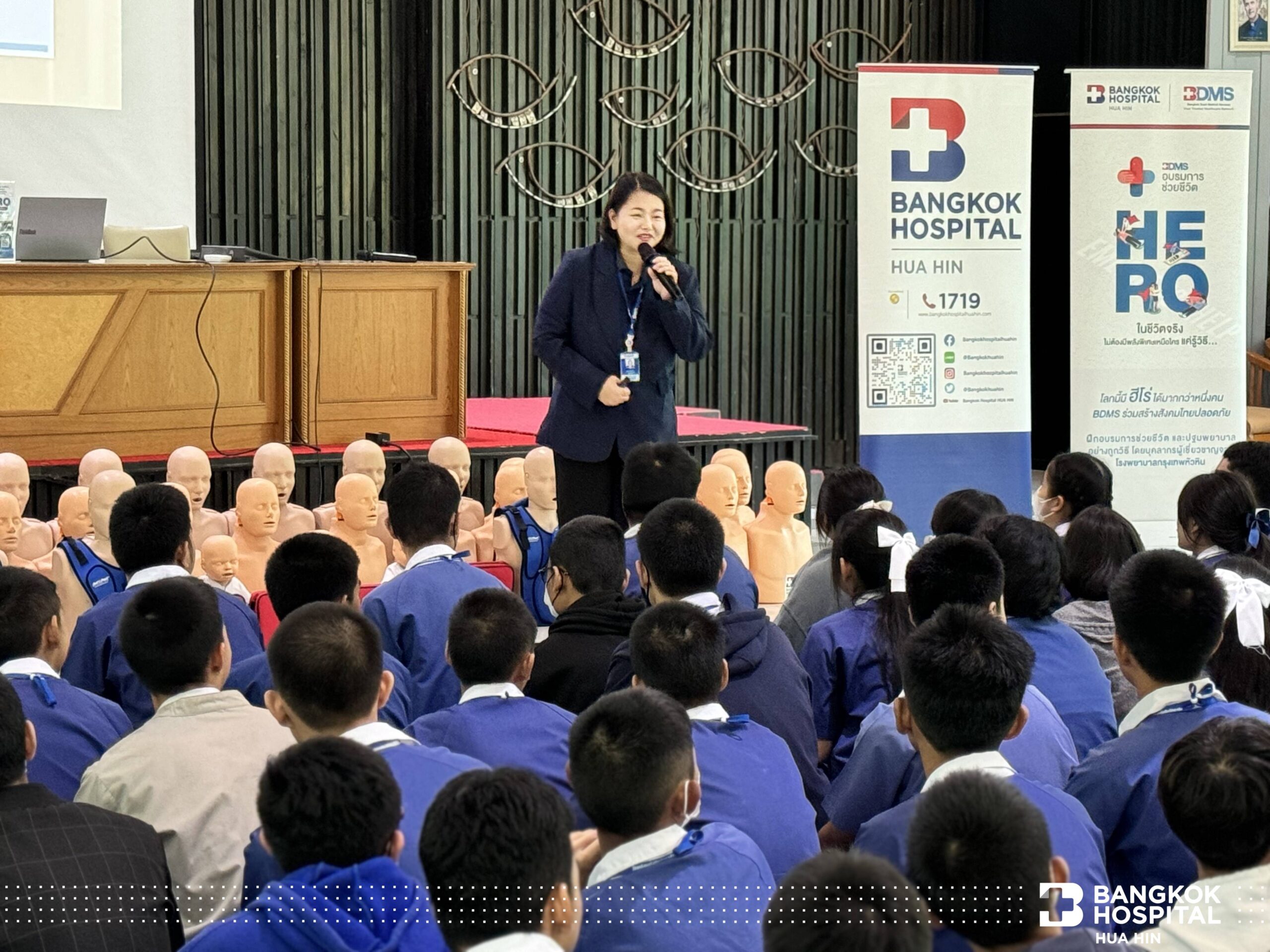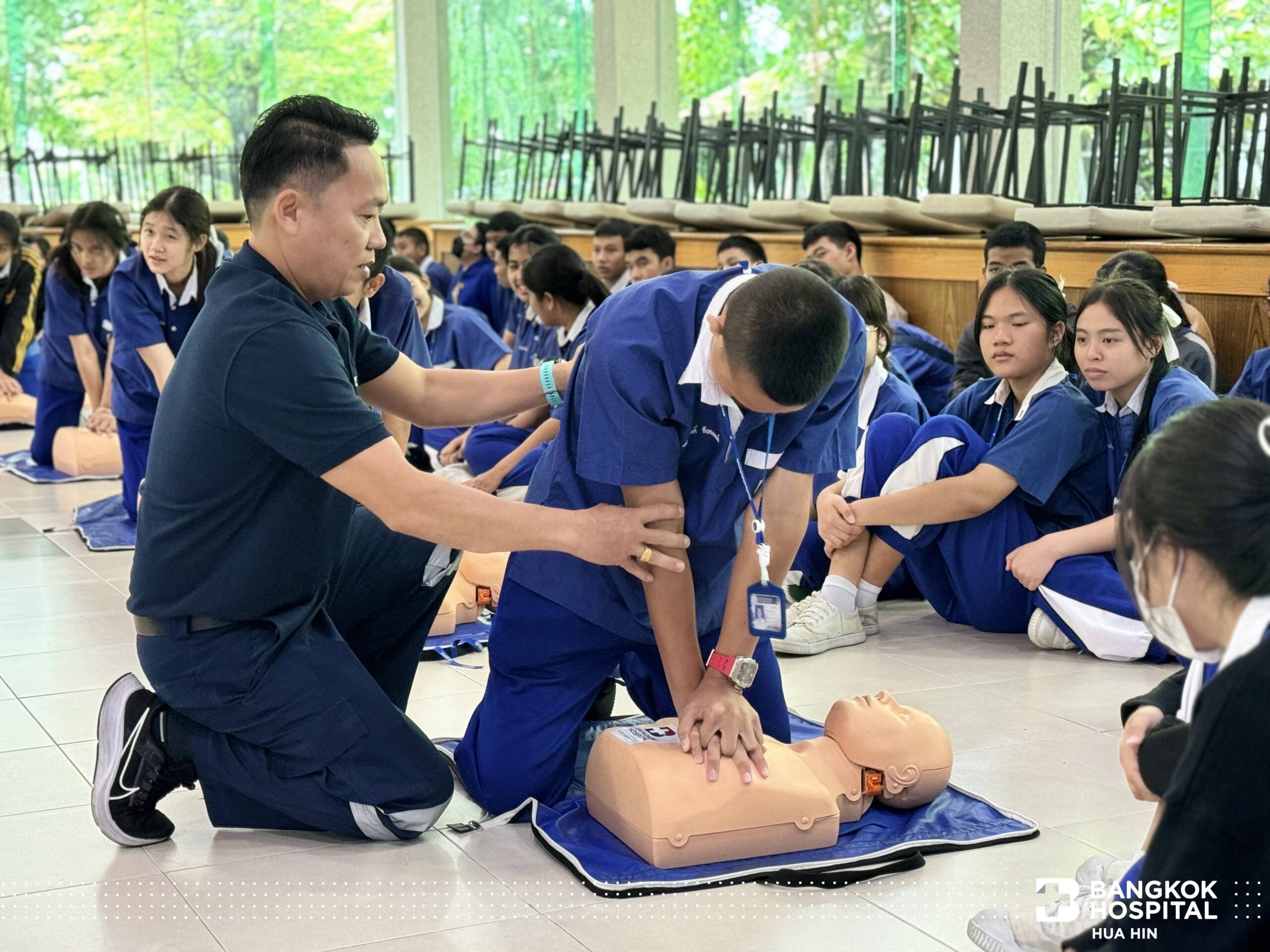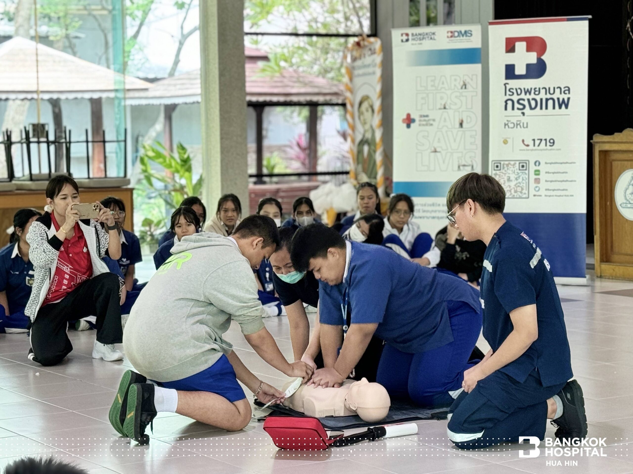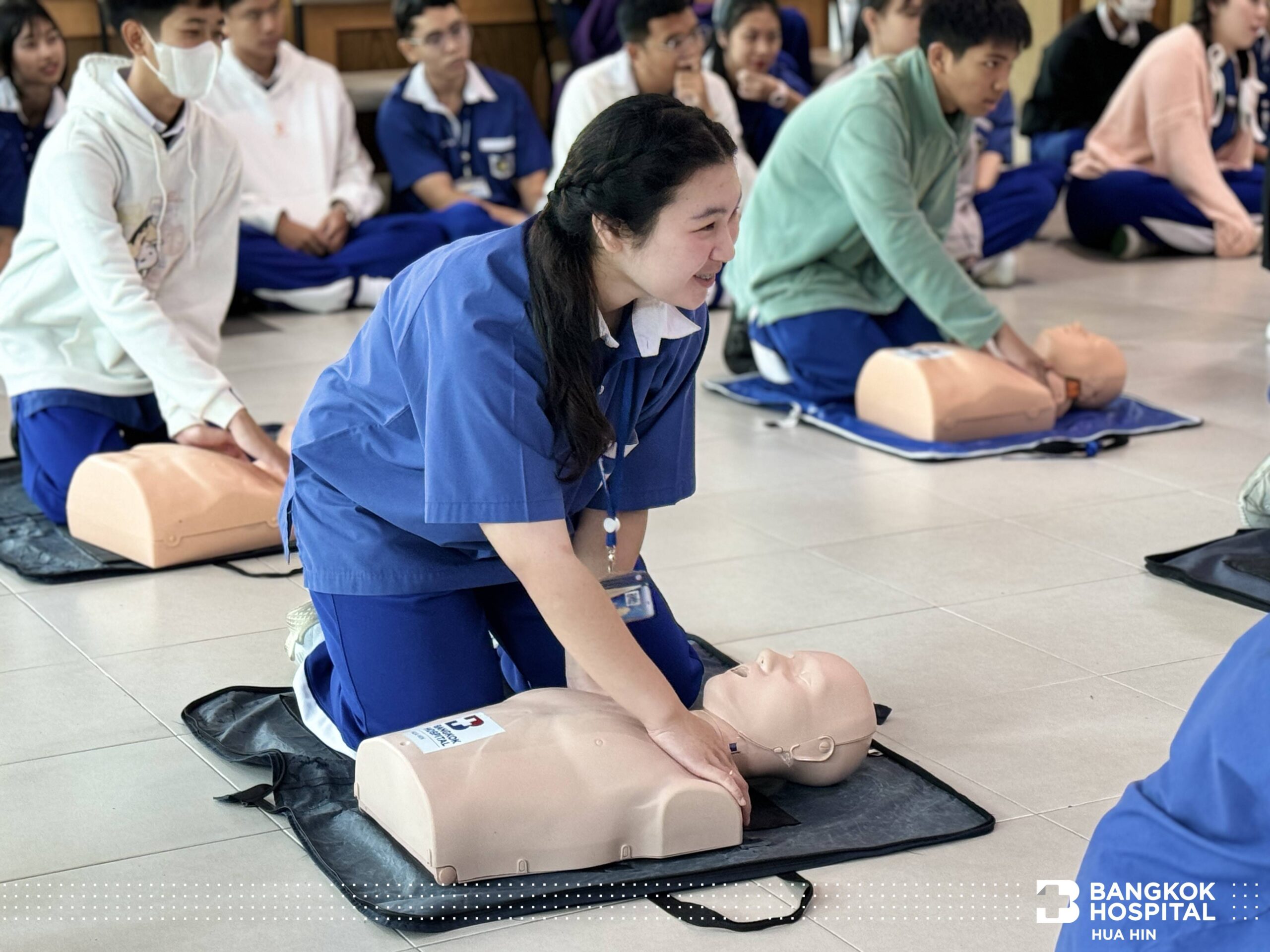 โดยทีมวิทยากรผู้เชี่ยวชาญจากโรงพยาบาลกรุงเทพหัวหิน พร้อมด้วยเจ้าหน้าที่กองสาธารณสุข เทศบาลเมืองหัวหิน และอุปกรณ์หุ่นฝึกส่วนหนึ่งร่วมสนับสนุนจากมูลนิธิสว่างหัวหินธรรมสถาน เพื่อถ่ายทอดความรู้ทั้งภาคทฤษฎีและการฝึกปฏิบัติจริงในการช่วยเหลือผู้ที่หัวใจหยุดเต้นด้วยการปั๊มหัวใจ CPR และการใช้เครื่องกระตุกหัวใจด้วยไฟฟ้า AED ให้แก่นักเรียนโรงเรียนหัวหินวิทยาลัย ในวันที่ 24 กรกฎาคม 2567 จำนวน 120 คน เพื่อให้น้องๆ นักเรียนเยาวชน มีความรู้พื้นฐานในการกู้ชีพและมีความมั่นใจในการช่วยชีวิตหรือการขอความช่วยเหลือได้อย่างถูกต้อง เป็นการเพิ่มโอกาสในการรอดชีวิตก่อนส่งถึงมือแพทย์