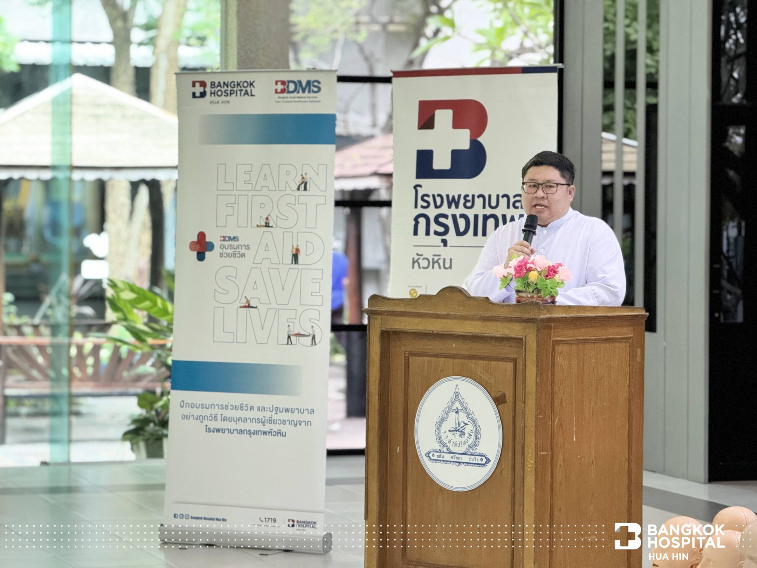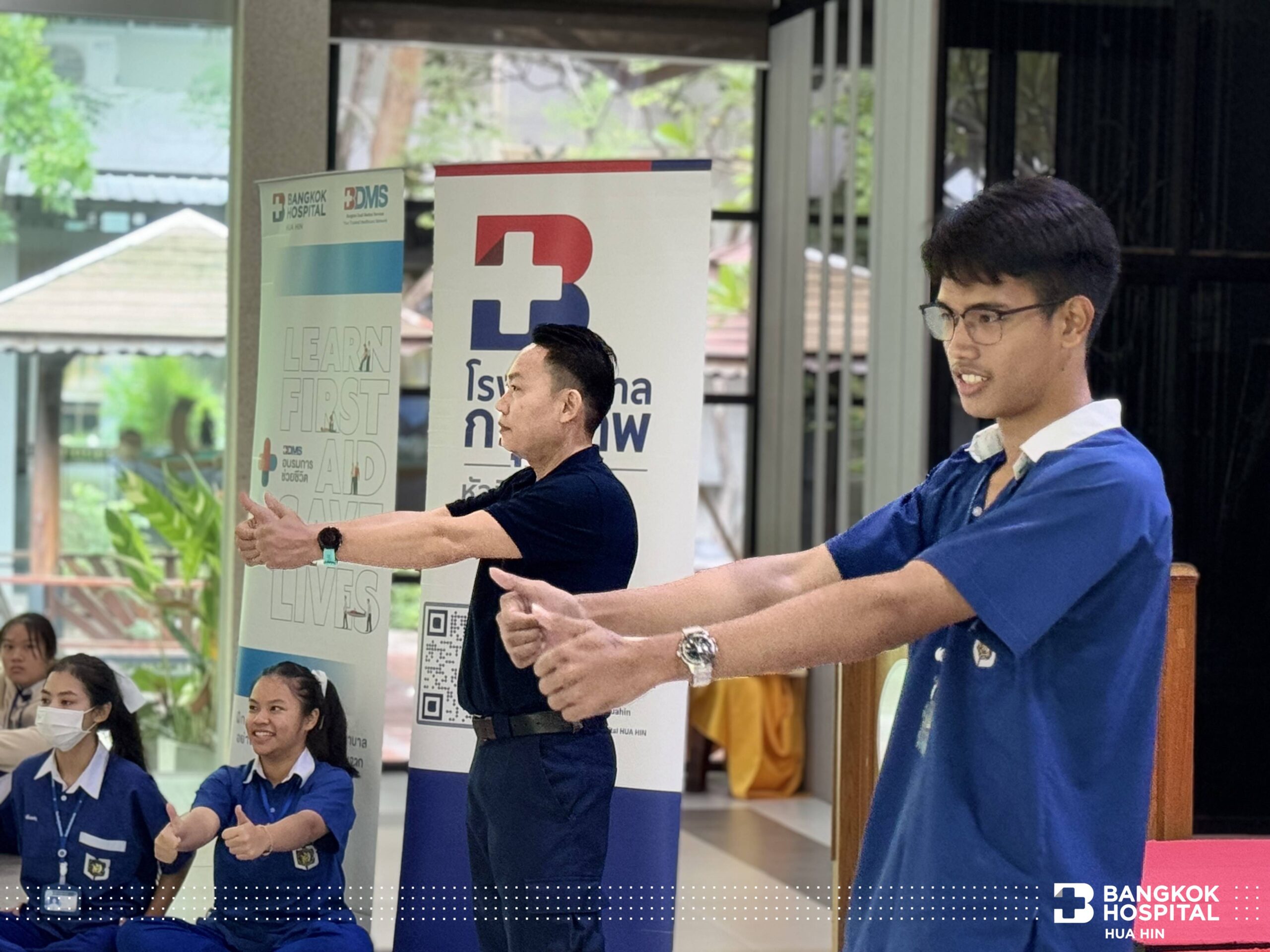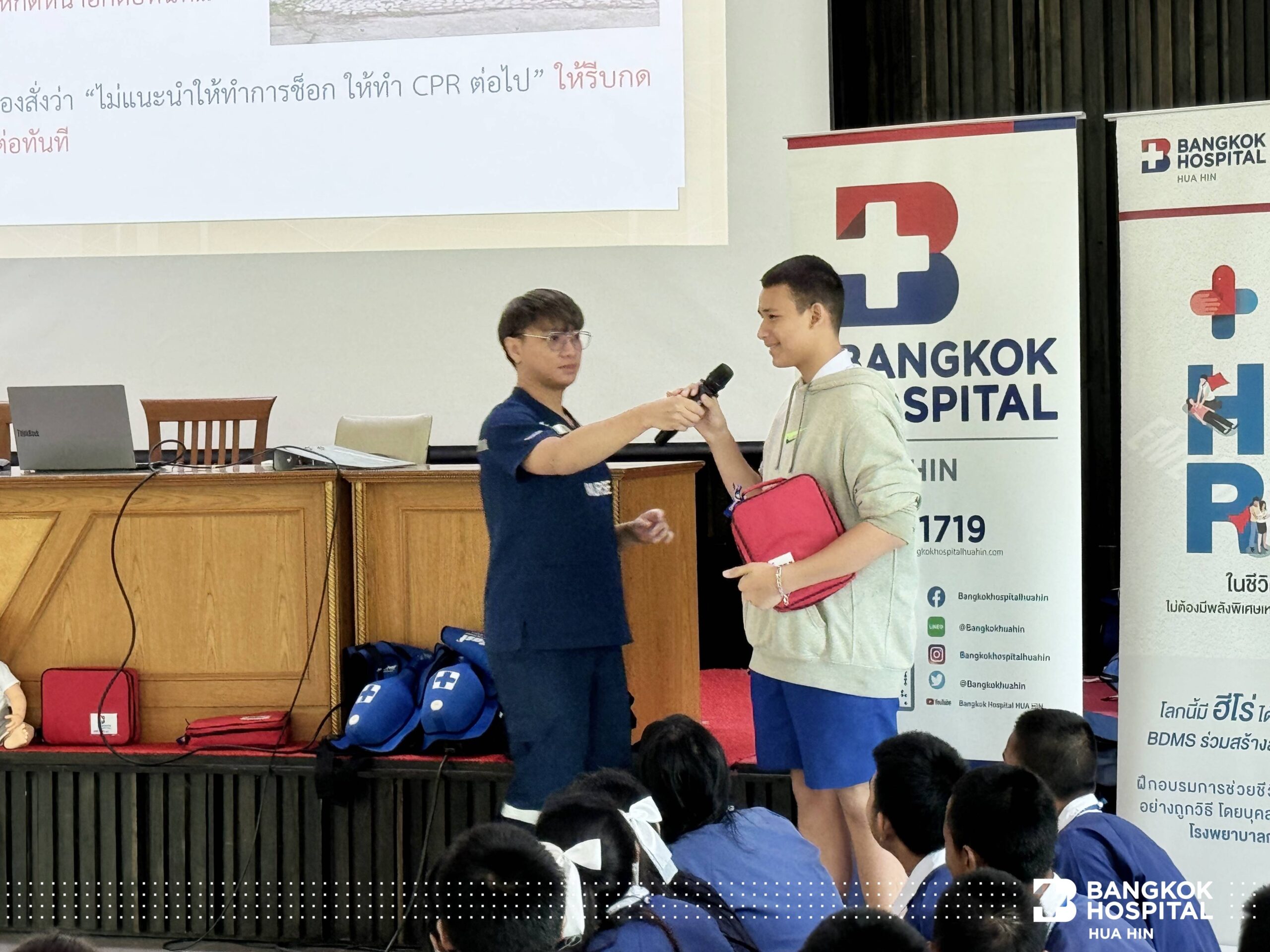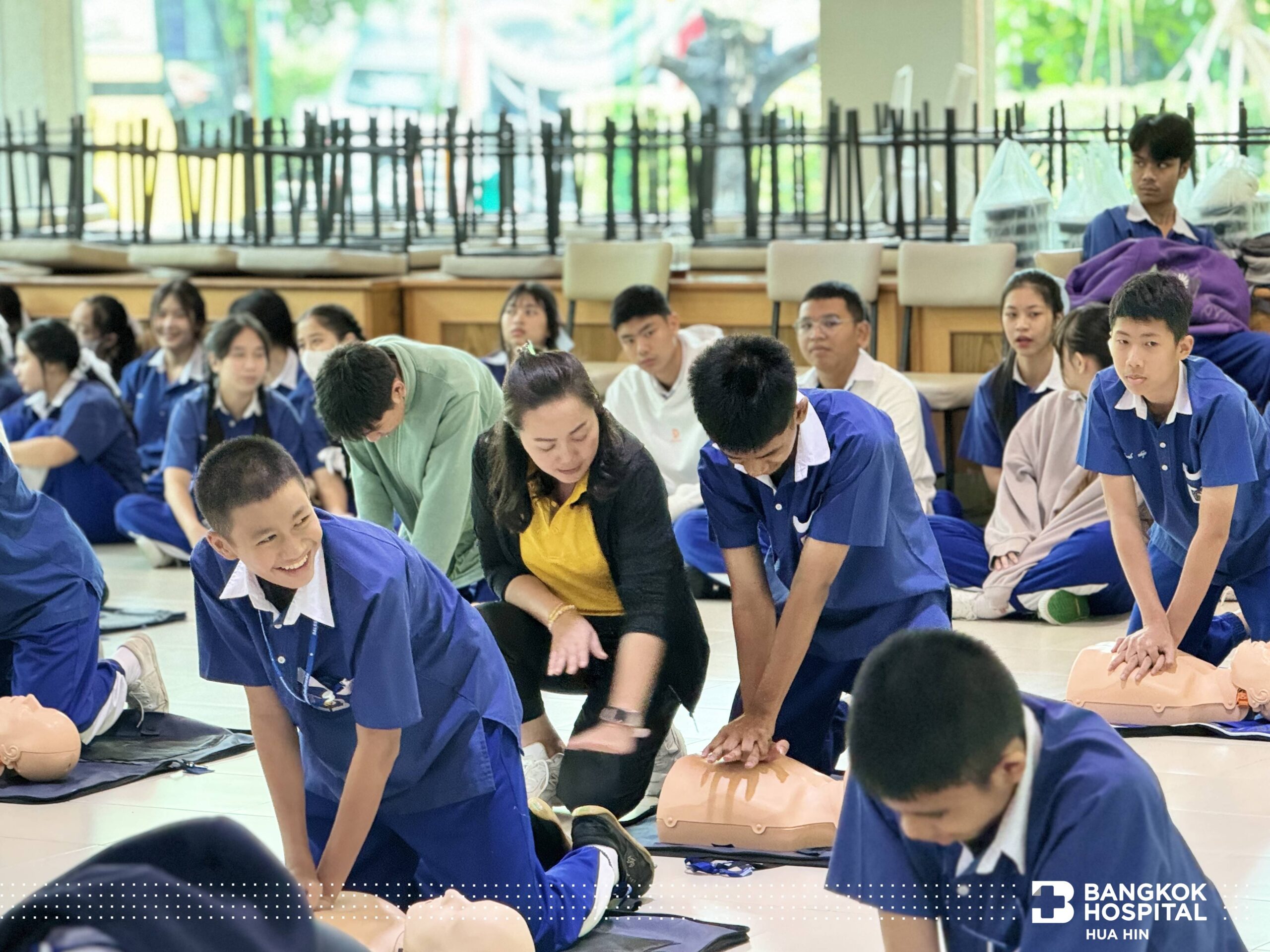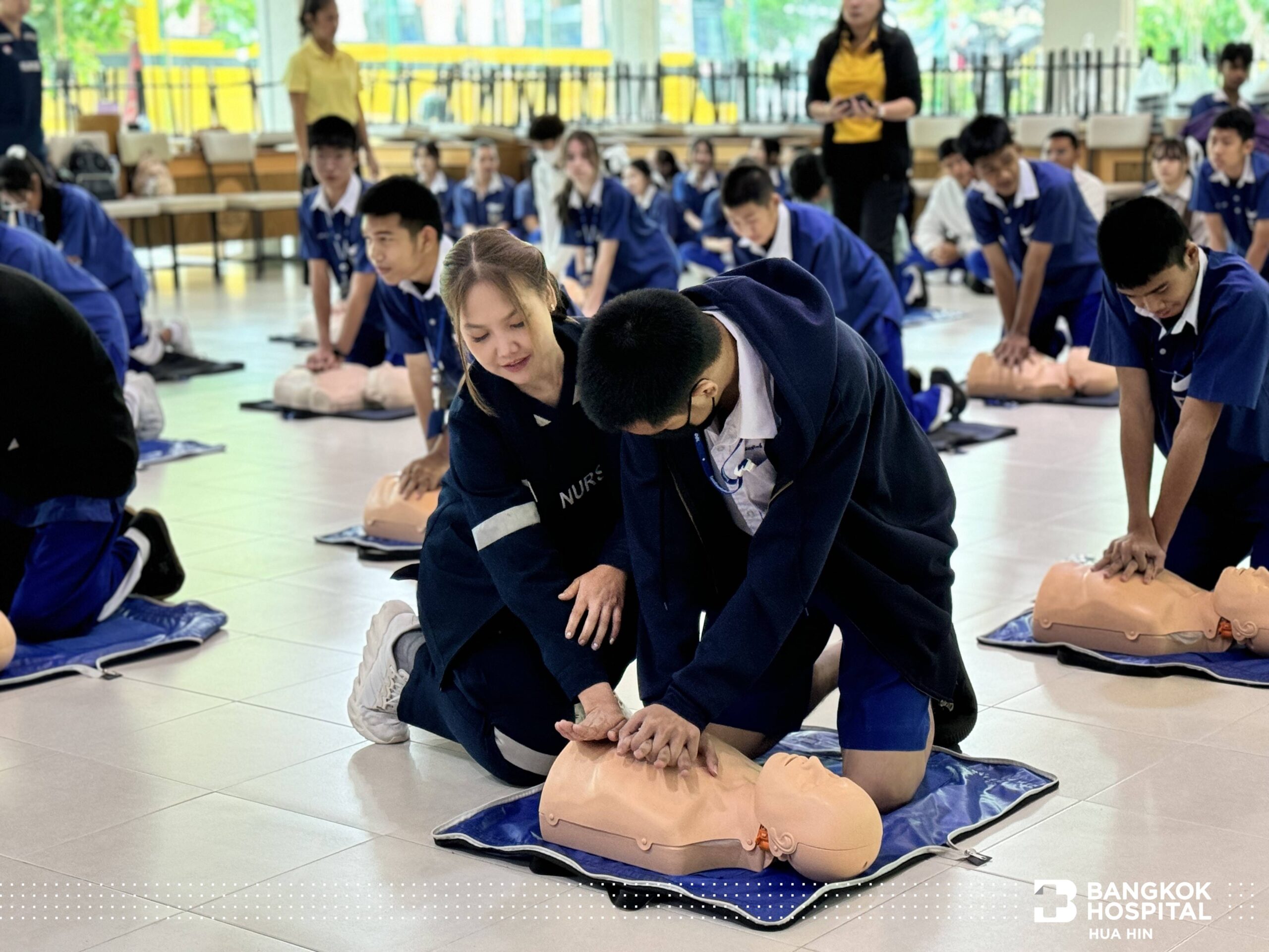 โดยทีมวิทยากรผู้เชี่ยวชาญจากโรงพยาบาลกรุงเทพหัวหิน พร้อมด้วยเจ้าหน้าที่กองสาธารณสุข เทศบาลเมืองหัวหิน และอุปกรณ์หุ่นฝึกส่วนหนึ่งร่วมสนับสนุนจากมูลนิธิสว่างหัวหินธรรมสถาน เพื่อถ่ายทอดความรู้ทั้งภาคทฤษฎีและการฝึกปฏิบัติจริงในการช่วยเหลือผู้ที่หัวใจหยุดเต้นด้วยการปั๊มหัวใจ CPR และการใช้เครื่องกระตุกหัวใจด้วยไฟฟ้า AED ให้แก่นักเรียนโรงเรียนหัวหินวิทยาลัย ในวันที่ 24 กรกฎาคม 2567 จำนวน 120 คน เพื่อให้น้องๆ นักเรียนเยาวชน มีความรู้พื้นฐานในการกู้ชีพและมีความมั่นใจในการช่วยชีวิตหรือการขอความช่วยเหลือได้อย่างถูกต้อง เป็นการเพิ่มโอกาสในการรอดชีวิตก่อนส่งถึงมือแพทย์