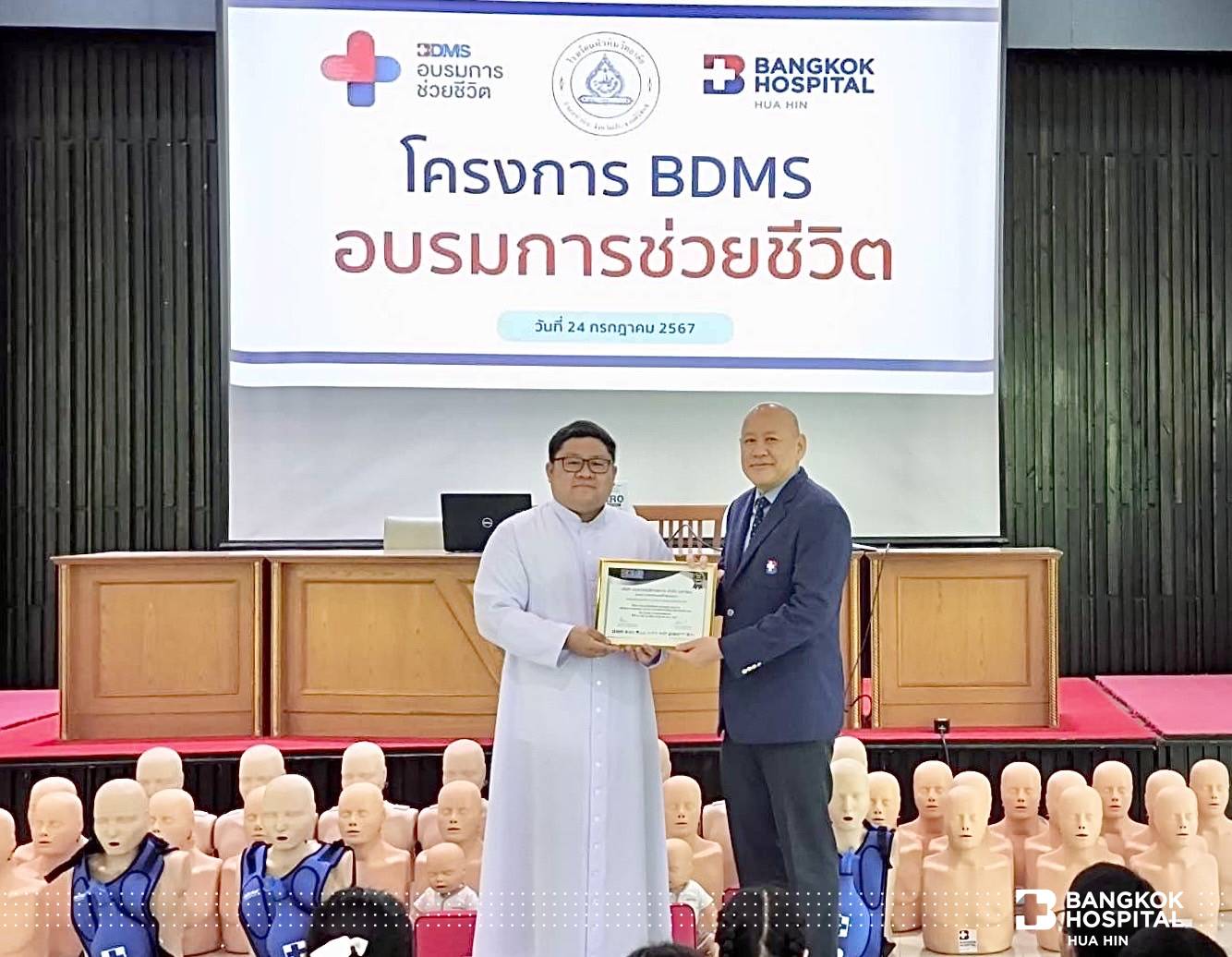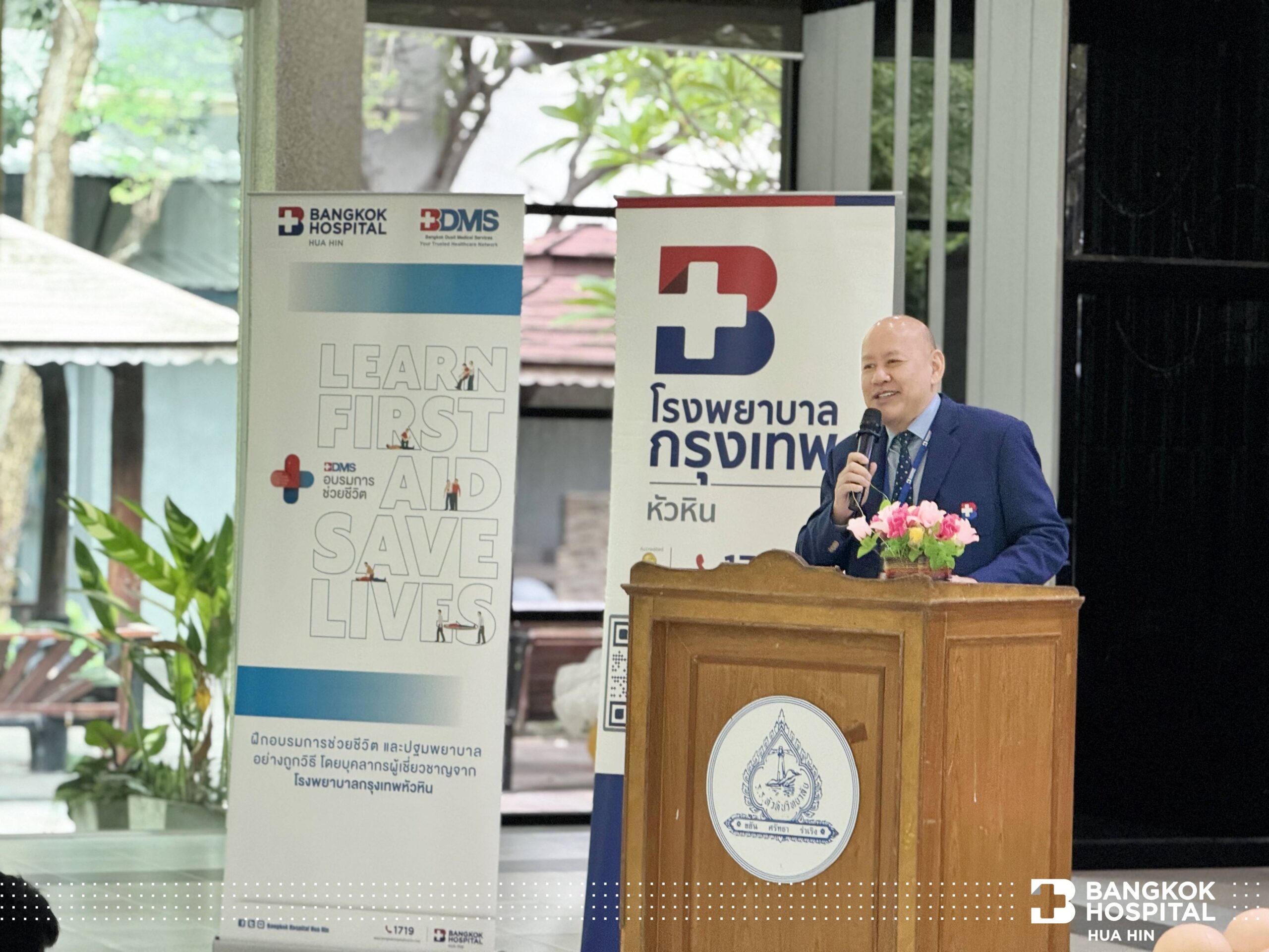 นพ. พงษ์ศักดิ์ บุญยะลีพรรณ ผู้ช่วยผู้อำนวยการโรงพยาบาลกรุงเทพหัวหิน เป็นประธานในพิธีเปิด “โครงการ BDMS อบรมการช่วยชีวิต” แก่นักเรียนชั้นมัธยมศึกษาตอนปลายโรงเรียนหัวหินวิทยาลัย โดยมี บาทหลวงณัฐวุฒิ กิจสวัสดิ์ รองอธิการโรงเรียนหัวหินวิทยาลัย ร่วมพิธีเปิด