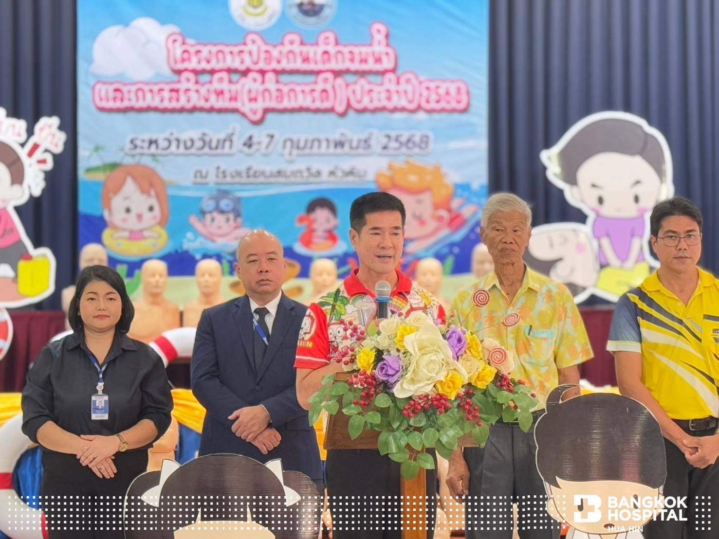 โดยโครงการนี้จัดขึ้นด้วยความร่วมมือของ งานส่งเสริมสุขภาพ ฝ่ายบริการสาธารณสุข กองสาธารณสุขและสิ่งแวดล้อม เทศบาลเมืองหัวหิน ร่วมกับ โรงพยาบาลกรุงเทพหัวหิน และภาคีเครือข่ายในการสนับสนุนทีมวิทยากรผู้เชี่ยวชาญ ถ่ายทอดความรู้สร้างทักษะให้เด็กและเยาวชน ในการช่วยเหลือตนเองให้สามารถเอาชีวิตรอดจากการจมน้ำ และเรียนรู้การช่วยชีวิตด้วยการปั๊มหัวใจ CPR การใช้เครื่อง AED กระตุกหัวใจด้วยไฟฟ้า ให้แก่นักเรียนชั้นประถมศึกษาปีที่ 5 – 6 โรงเรียนสมถวิล หัวหิน จำนวน 4 รุ่น เข้าร่วมการฝึกอบรม ในวันที่ 4 – 7 กุมภาพันธ์ 2568 ณ โรงเรียนสมถวิล หัวหิน อ.หัวหิน จ.ประจวบคีรีขันธ์