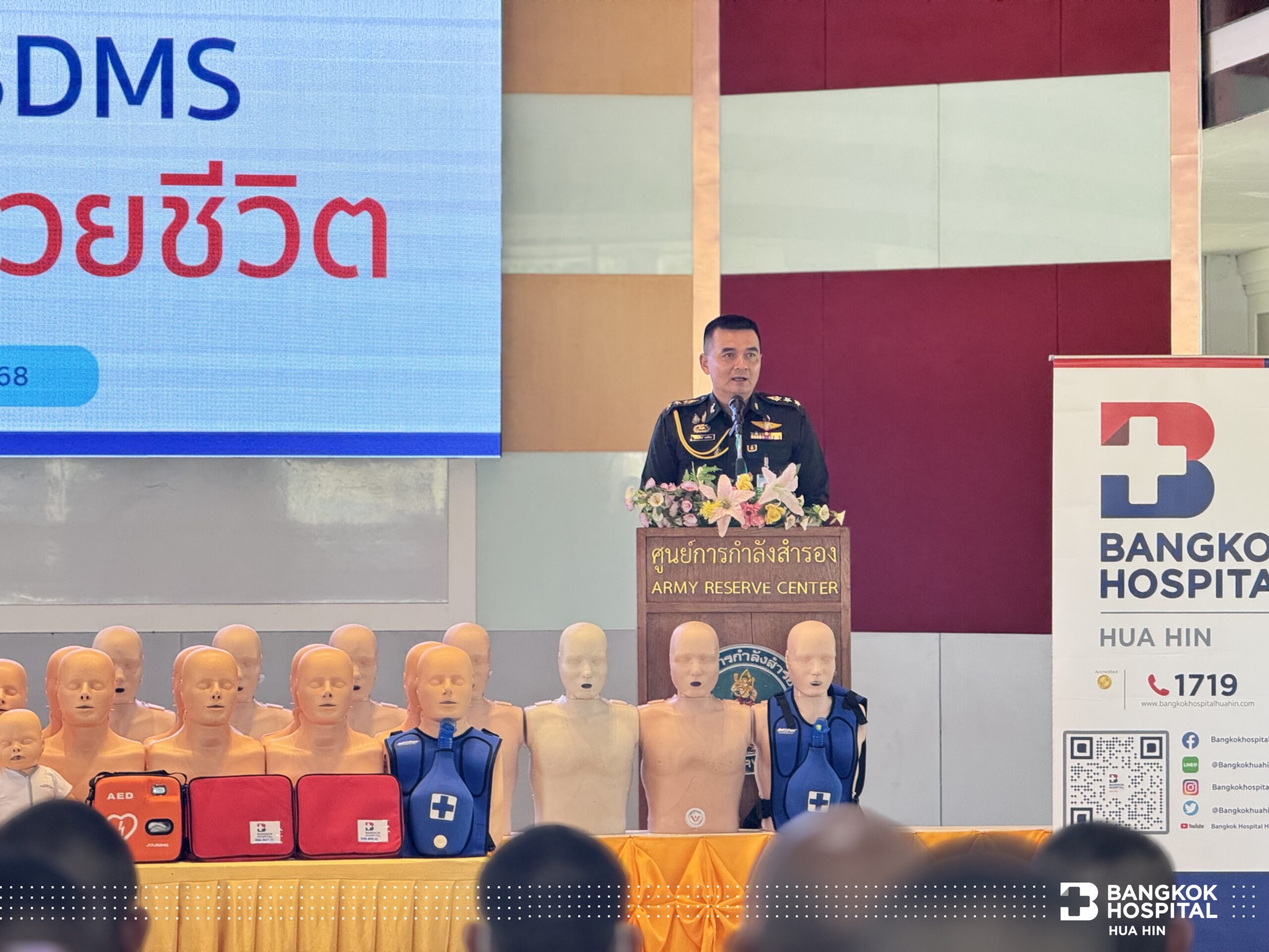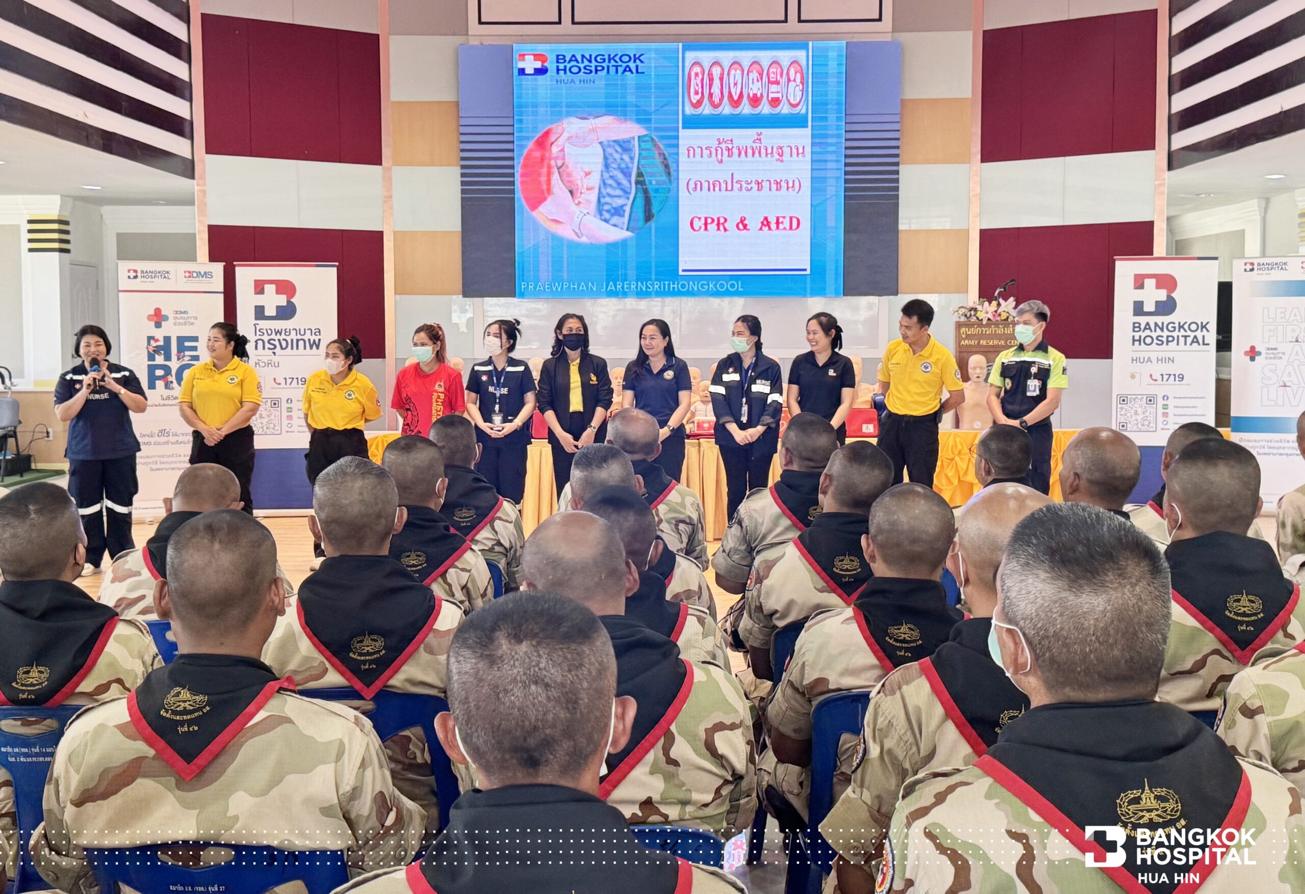 ทางด้าน นพ.วีระศักดิ์ พงษ์พัฒนพันธุ์ กล่าวถึงวัตถุประสงค์โครงการนี้ว่า โรงพยาบาลกรุงเทพหัวหิน ได้จัดการอบรมนี้ให้กับทางศูนย์การกำลังสำรอง อย่างต่อเนื่องเป็นปีที่ 3 เพื่อให้กำลังพล ศสร. มีความรู้ในการช่วยชีวิตผู้ป่วยเมื่อเกิดเหตุฉุกเฉินเร่งด่วนได้อย่างถูกวิธี การอบรมจะมีทั้งภาคทฤษฎีและฝึกปฏิบัติ โดยวิทยากรผู้เชี่ยวชาญจากโรงพยาบาลกรุงเทพหัวหิน และภาคีเครือข่าย ในการช่วยเหลือผู้ที่หัวใจหยุดเต้น ด้วยการปั๊มหัวใจ (CPR) การใช้เครื่องกระตุกหัวใจด้วยไฟฟ้าชนิดอัตโนมัติ (AED) และการช่วยเหลือผู้ป่วยสำลักอุดกั้นทางเดินหายใจ (Choking) ซึ่งผู้ที่ผ่านการฝึกอบรมจะได้รับมอบประกาศนียบัตรจาก BDMS ตามแนวคิดที่ว่า แม้ไม่ได้เป็นบุคลากรทางการแพทย์ หากเรามีองค์ความรู้และมีความมั่นใจ ผ่านการอบรมและฝึกปฏิบัติจริง