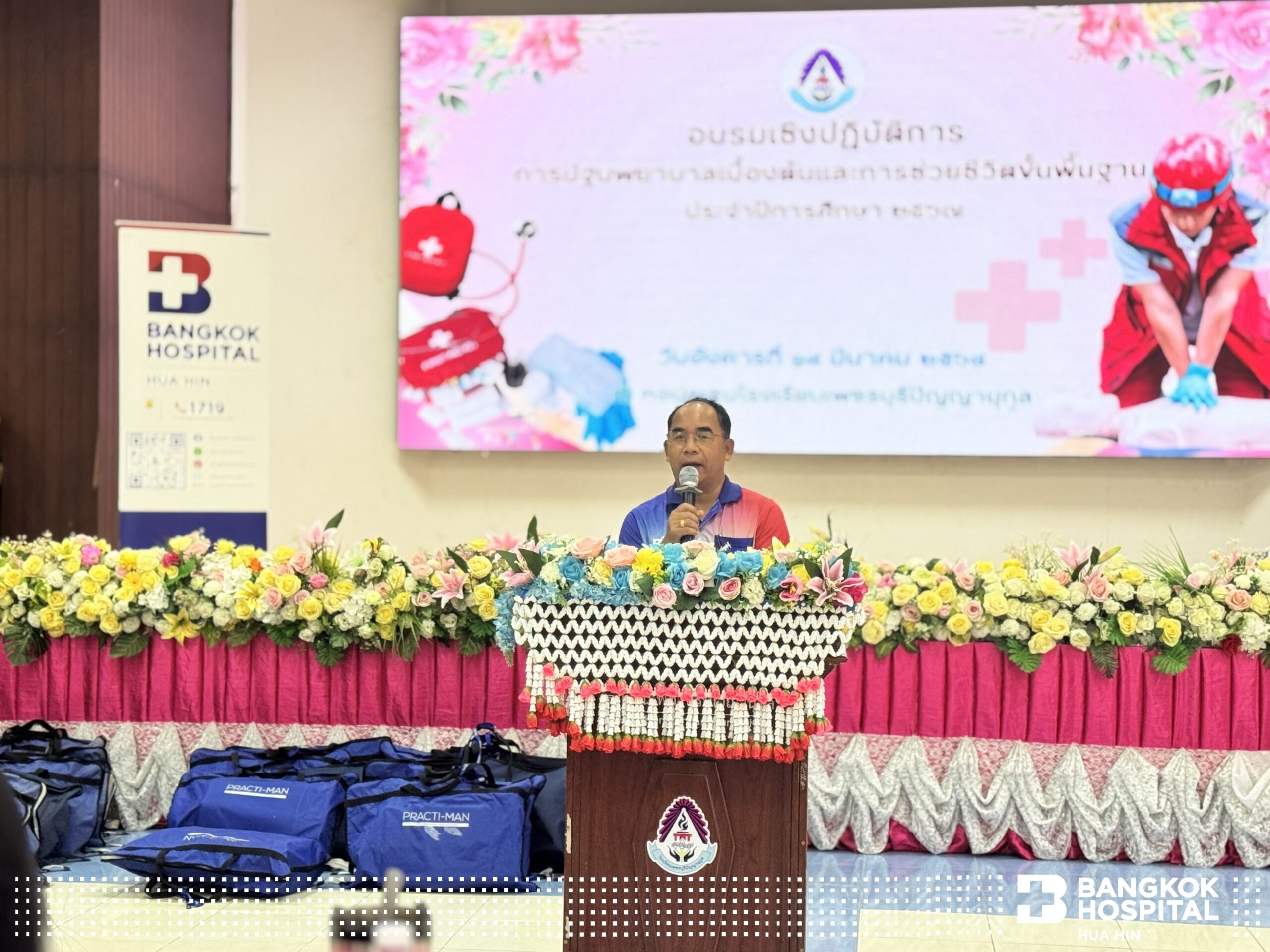 วันที่ 18 มีนาคม 2568 โรงพยาบาลกรุงเทพหัวหิน ร่วมเป็นวิทยากรในโครงการอบรมเชิงปฏิบัติการ “การปฐมพยาบาลเบื้องต้นและการช่วยชีวิตขั้นพื้นฐาน” โดย มูลนิธิเพชรเกษม จัดอบรมให้แก่คุณครูและบุคลากรโรงเรียนเพชรบุรีปัญญานุกูล ต.สามพระยา อ.ชะอำ จ.เพชรบุรี จำนวน 116 คน ณ หอประชุมโรงเรียนเพชรบุรีปัญญานุกูล โดยมี คุณพิทักษ์ สุระชาติ ผู้อำนวยการโรงเรียนเพชรบุรีปัญญานุกูล เป็นประธานในพิธี