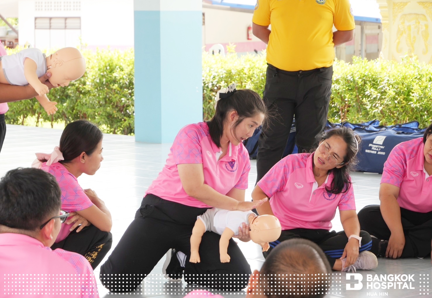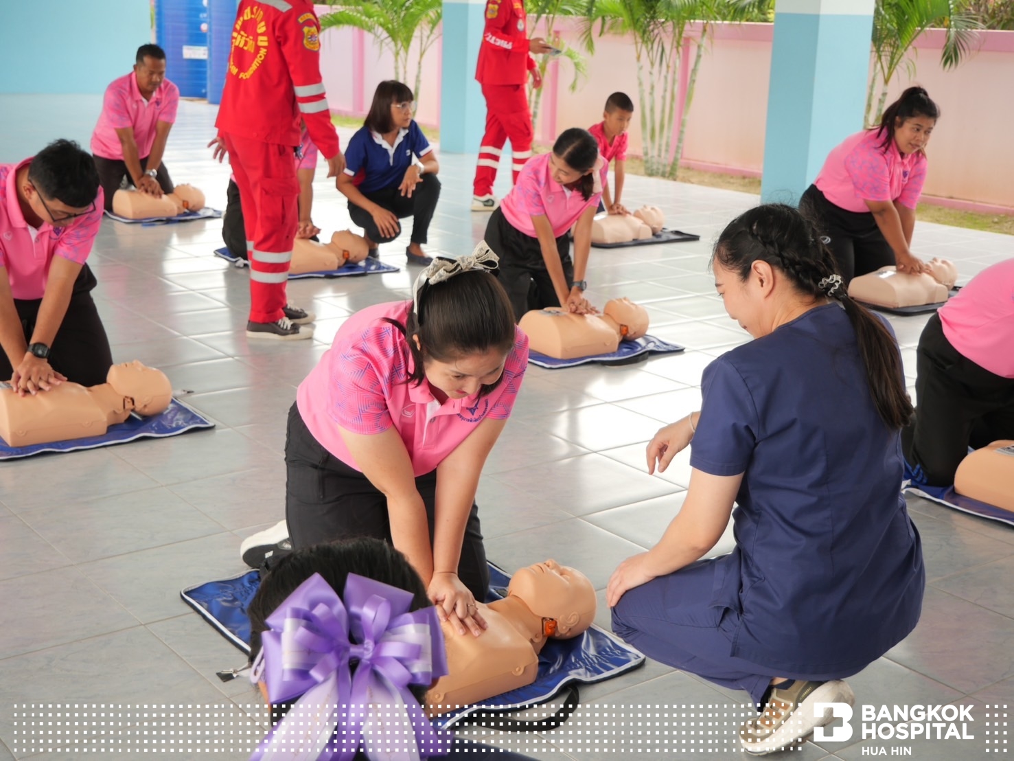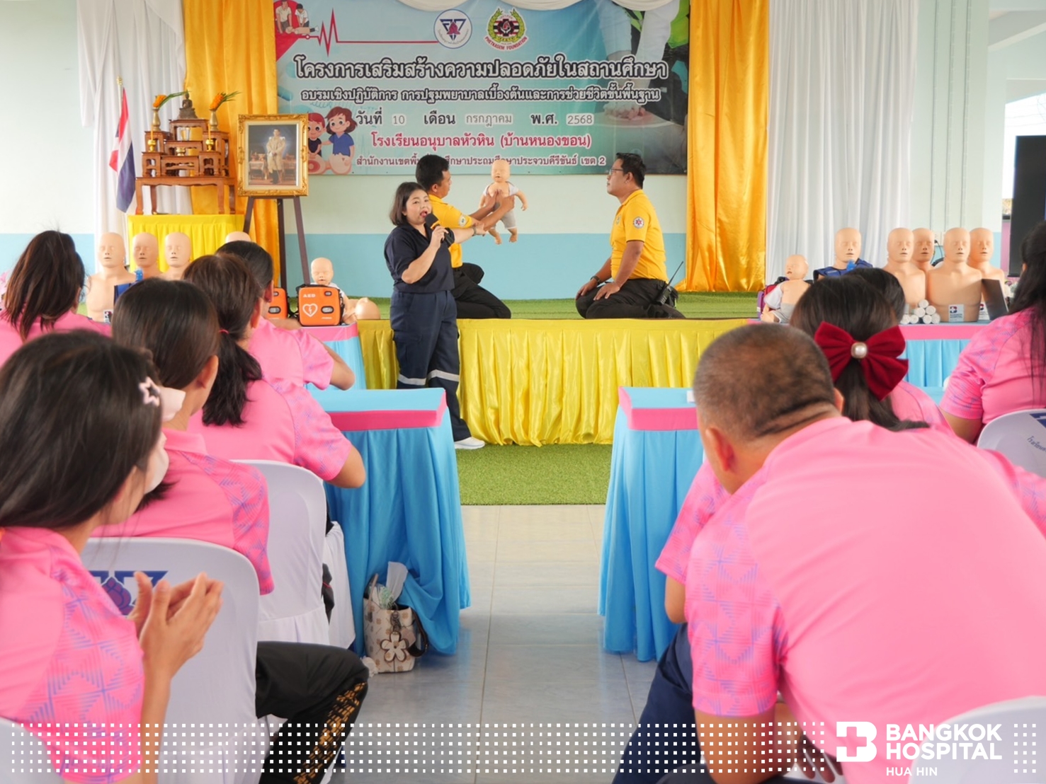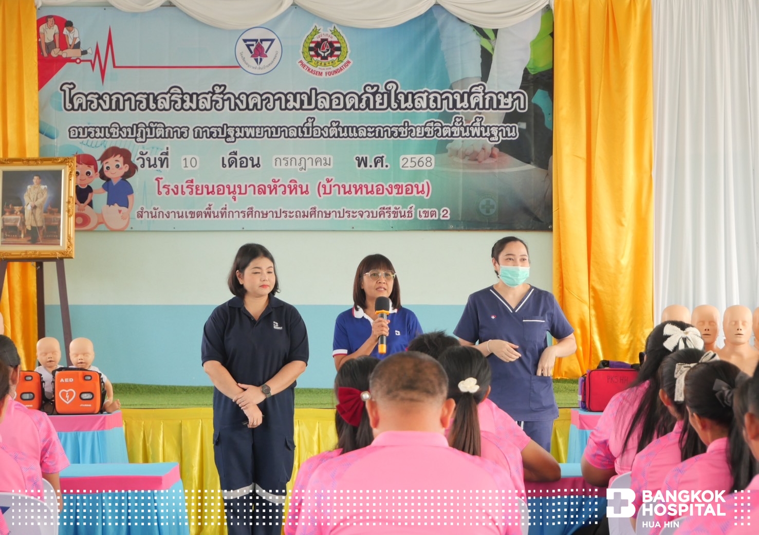 โดยทีมวิทยากรผู้เชี่ยวชาญจากมูลนิธิเพชรเกษมและโรงพยาบาลกรุงเทพหัวหิน ร่วมกันการถ่ายทอดความรู้ในการช่วยชีวิตด้วยการปั๊มหัวใจ CPR การใช้เครื่อง AED กระตุกหัวใจด้วยไฟฟ้า การช่วยเหลือผู้ป่วยสำลักอุดกั้นทางเดินหายใจ และการปฐมพยาบาลเบื้องต้น ให้แก่คุณครูและบุคลากรในโรงเรียน เพื่อให้มีความมั่นใจในการช่วยเหลือนักเรียน ตลอดจนบุคคลรอบข้าง หากเกิดเหตุการณ์ฉุกเฉิน