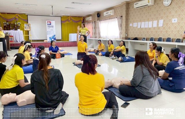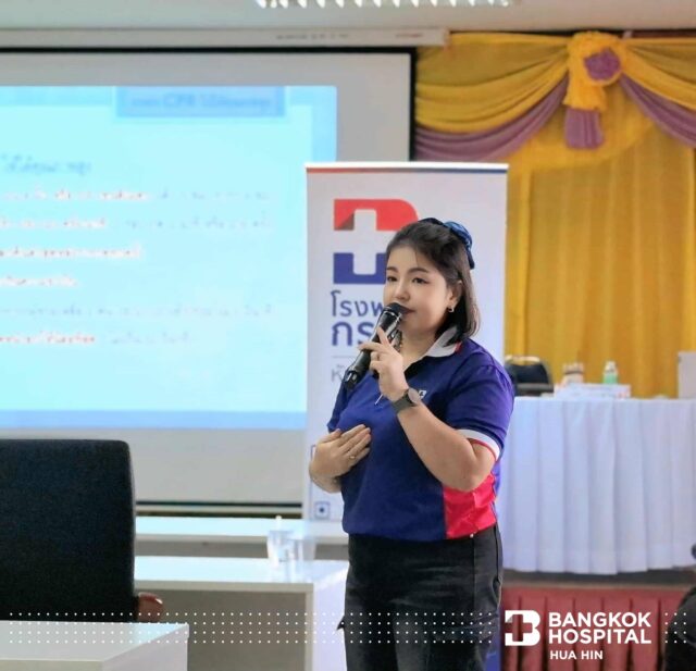 วันที่ 1 กันยายน 2568 โรงพยาบาลกรุงเทพหัวหิน ร่วมเป็นวิทยากรในโครงการอบรมเชิงปฏิบัติการ “การปฐมพยาบาลเบื้องต้นและการช่วยชีวิตขั้นพื้นฐาน” โดย มูลนิธิเพชรเกษม จัดอบรมให้แก่คณะผู้บริหารสมาชิกสภาองค์การบริหารส่วนตำบลหนองตาแต้ม พนักงานส่วนตำบล พนักงานครูอบต. และพนักงานจ้าง จำนวน 65 คน ณ ห้องประชุมองค์การบริหารส่วนตำบลหนองตาแต้ม อำเภอปราณบุรี จังหวัดประจวบคีรีขันธ์