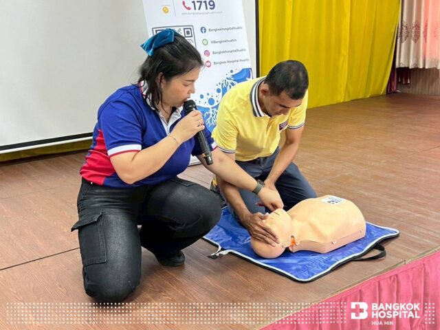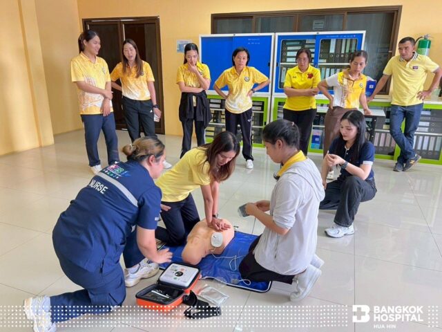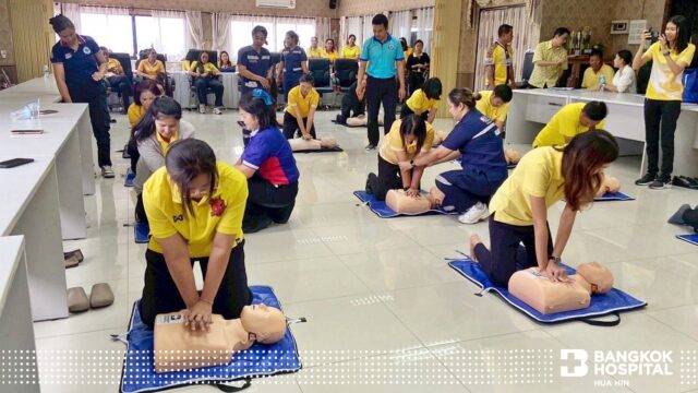 โดยทีมวิทยากรผู้เชี่ยวชาญจากมูลนิธิเพชรเกษมและโรงพยาบาลกรุงเทพหัวหิน ร่วมกันการถ่ายทอดความรู้ในการช่วยชีวิตด้วยการปั๊มหัวใจ CPR การใช้เครื่อง AED กระตุกหัวใจด้วยไฟฟ้า การช่วยเหลือผู้ป่วยสำลักอุดกั้นทางเดินหายใจ และการปฐมพยาบาลเบื้องต้น เพื่อให้บุคลากรมีความมั่นใจในการช่วยเหลือ หากเกิดเหตุการณ์ฉุกเฉิน