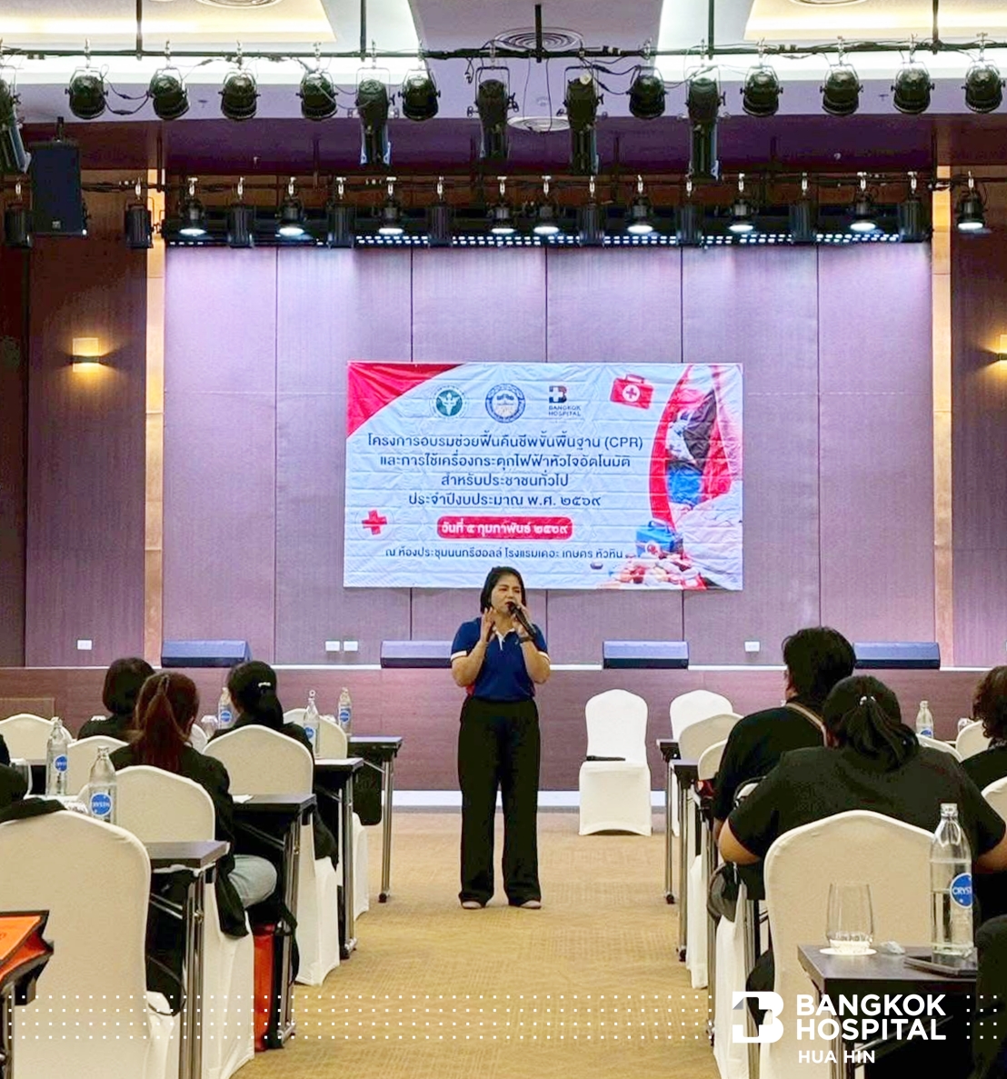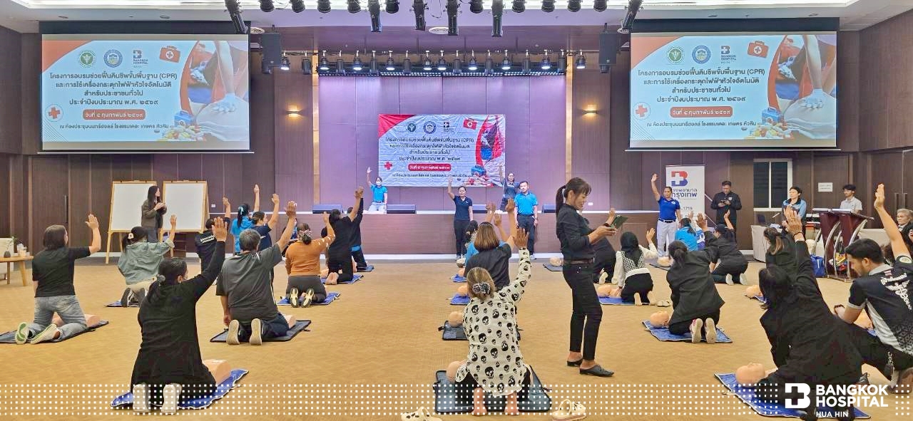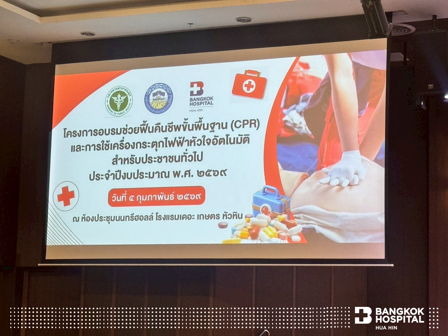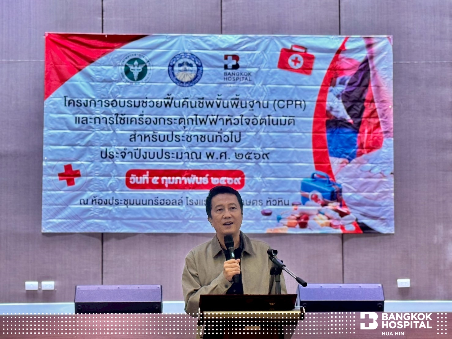 โรงพยาบาลกรุงเทพหัวหิน ร่วมเป็นวิทยากรในโครงการอบรมช่วยฟื้นคืนชีพขั้นพื้นฐาน (CPR) และการใช้เครื่องกระตุกไฟฟ้าหัวใจอัตโนมัติ สำหรับประชาชนทั่วไป ประจำปีงบประมาณ 2569 ซึ่งจัดโดยองค์การบริหารส่วนจังหวัดประจวบคีรีขันธ์ โดยมี นายสราวุธ ลิ้มอรุณรักษ์ นายกองค์การบริหารส่วนจังหวัดประจวบคีรีขันธ์ เป็นประธานในพิธีเปิด ณ ห้องประชุมโรงแรมเดอะเกษตร อำเภอหัวหิน จังหวัดประจวบคีรีขันธ์ เมื่อวันที่ 5 กุมภาพันธ์ 2569