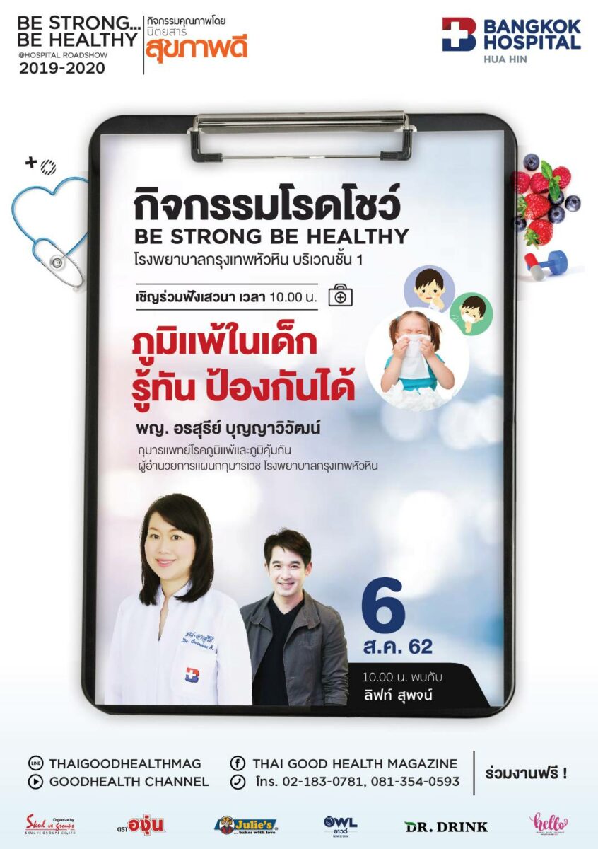 วันที่ 6 สิงหาคม 2562 โรงพยาบาลกรุงเทพหัวหิน ร่วมกับนิตยสารสุขภาพดี Be Strong Be Healthy จัดงานเสวนาหัวข้อ “ภูมิแพ้ในเด็ก รู้ทัน ป้องกันได้” โดยพญ. อรสุรีย์ บุญญาวิวัฒน์ กุมารแพทย์โรคภูมิแพ้และภูมิคุ้มกัน ผอ.แผนกกุมารเวช ให้ความรู้เกี่ยวกับโรคภูมิแพ้ในเด็ก และแขกรับเชิญพิเศษ คุณลิฟต์ สุพจน์ ร่วมเสวนา