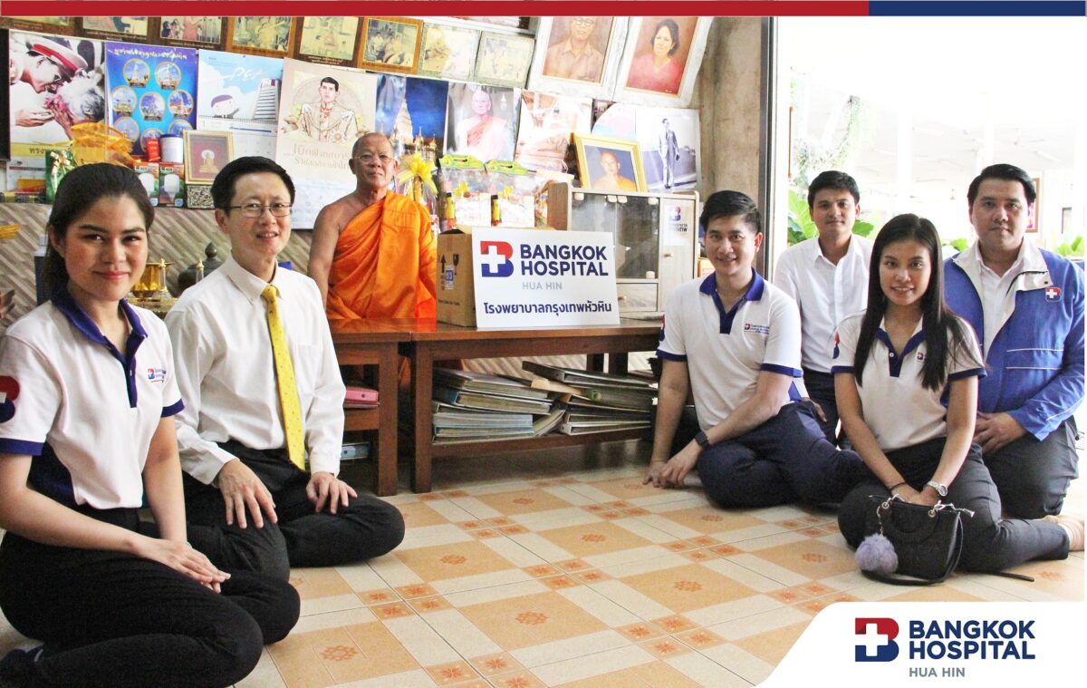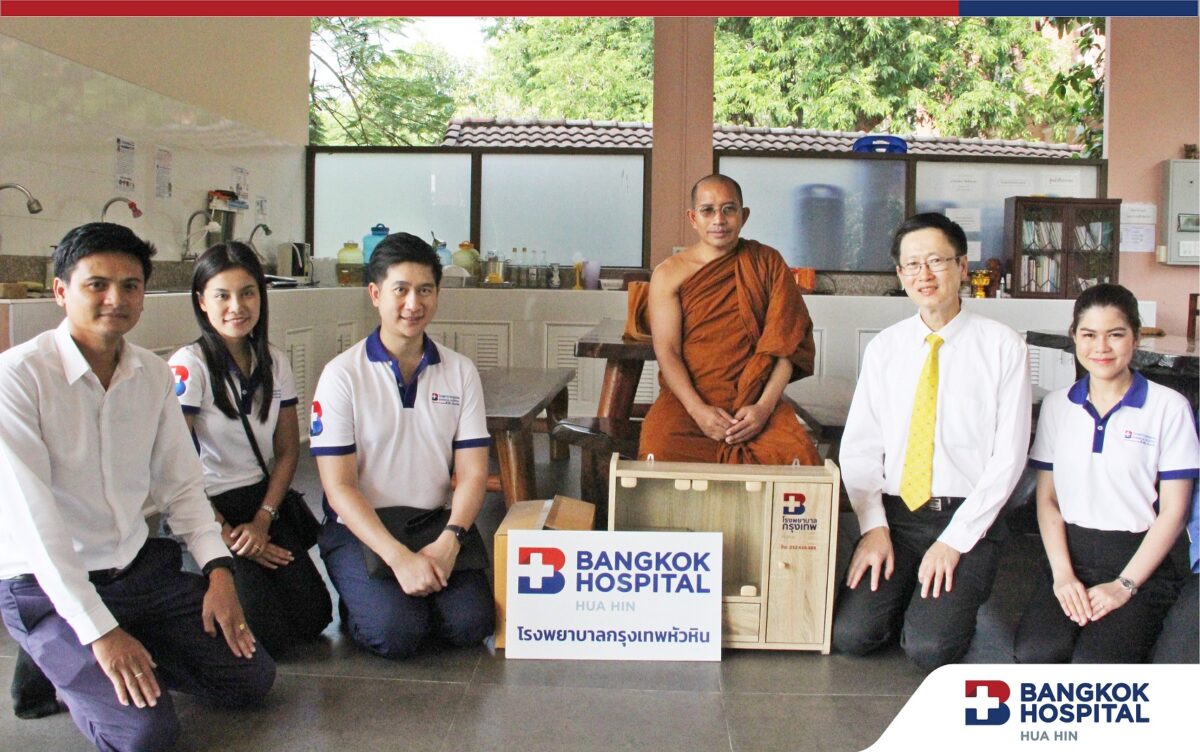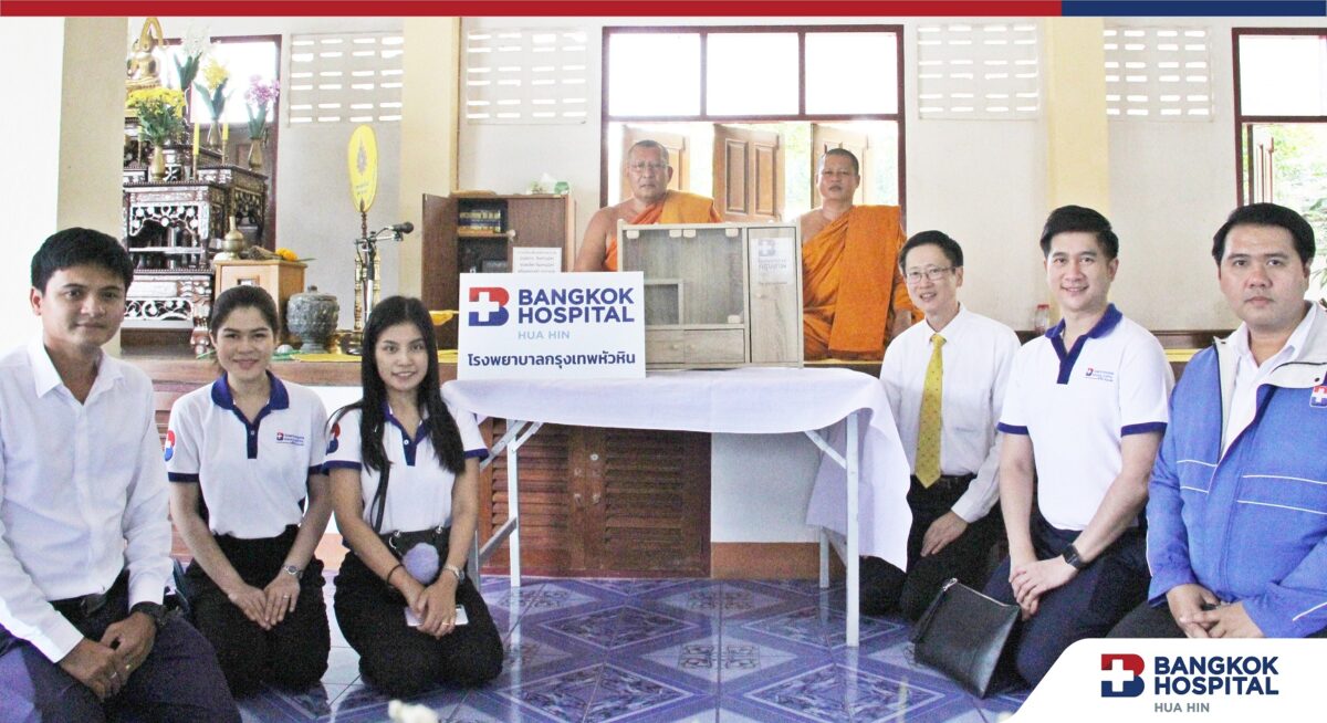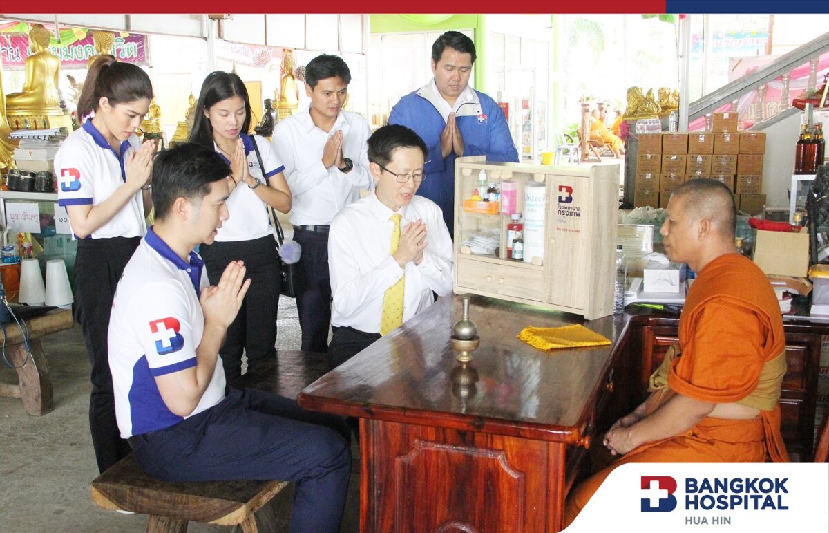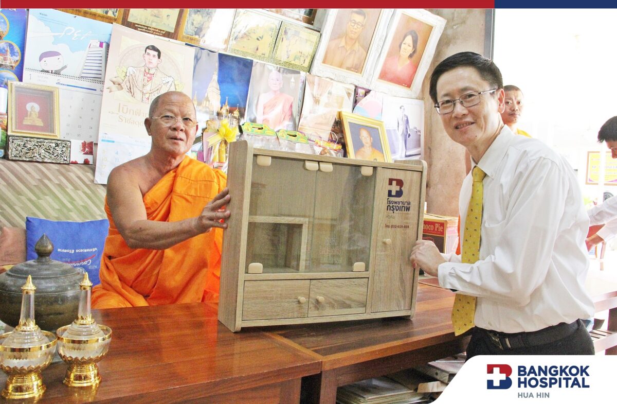 วันที่ 19 พฤศจิกายน 2562 นายแพทย์วีระศักดิ์ พงษ์พัฒนพันธุ์ ผู้อำนวยการโรงพยาบาลกรุงเทพหัวหิน พร้อมด้วยตัวแทนเจ้าหน้าที่โรงพยาบาล เข้าถวายตู้ยาพร้อมยาและเวชภัณฑ์ ถวายแด่วัดในจังหวัดประจวบคีรีขันธ์ ได้แก่ วัดกุยบุรี วัดหุบตาโคตร วัดศาลาลัย วัดหนองตาแต้ม และวัดเขาสนามชัย เพื่อใช้ในการปฐมพยาบาลเบื้องต้นให้แก่พระสงฆ์ สามเณร แม่ชี ตลอดจนประชาชนที่มาทำบุญที่วัด