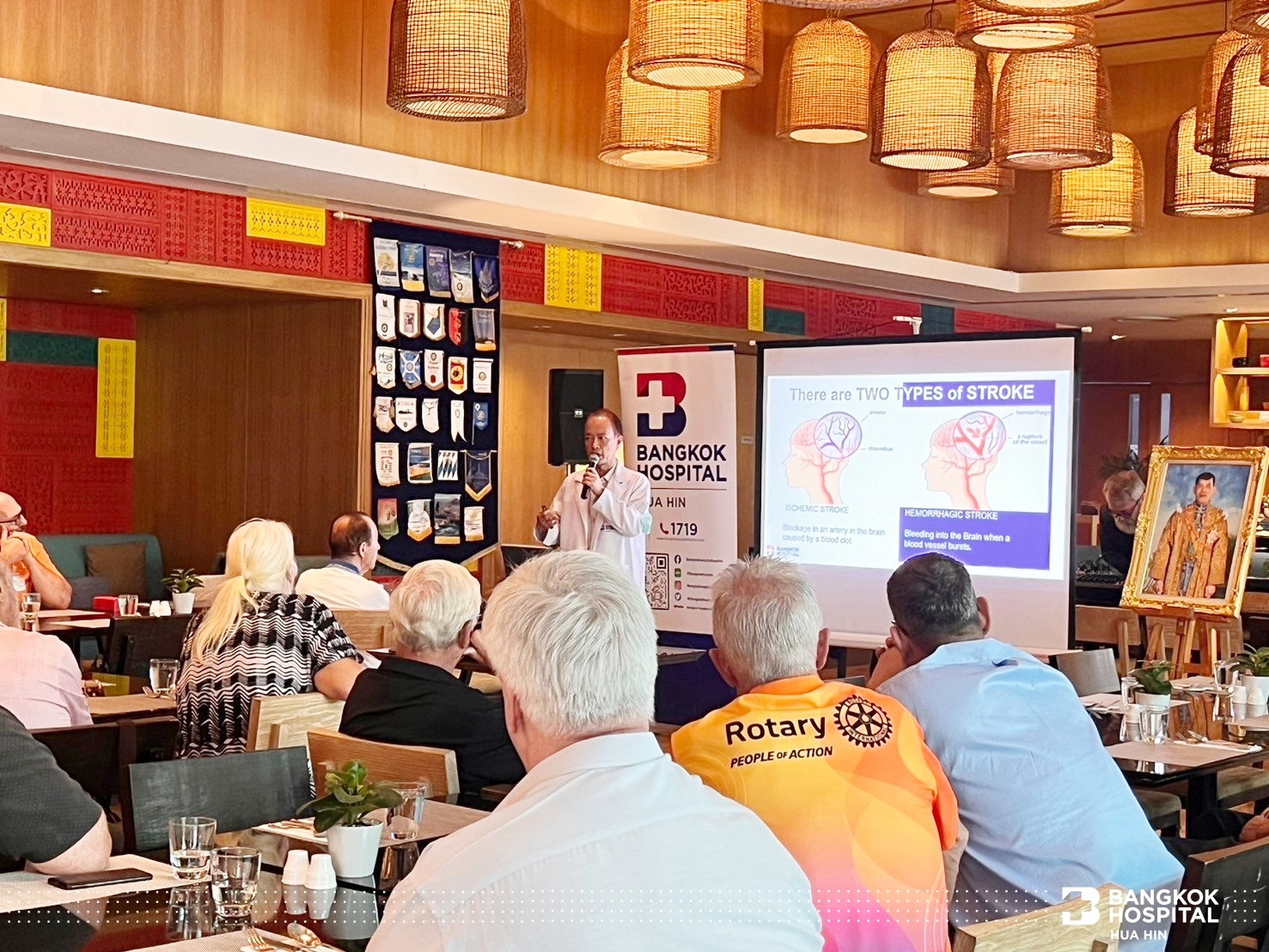 นพ. เรืองวุฒิ ตันติแพทยางกูร แพทย์เฉพาะทางระบบประสาทและสมอง โรงพยาบาลกรุงเทพหัวหิน บรรยายให้ความรู้ในหัวข้อ Introduction to Stroke แก่สโมสรโรตารีรอยัลหัวหิน โดยมี นพ.พงษ์ศักดิ์ บุญยะลีพรรณ ผู้ช่วยผู้อำนวยการโรงพยาบาลกรุงเทพหัวหิน เข้าร่วมงาน และมีคุณ Brian Anderson นายกสโมสรฯ ให้การต้อนรับ ณ โรงแรมอมารีหัวหิน เมื่อวันที่ 12 มีนาคม 2567