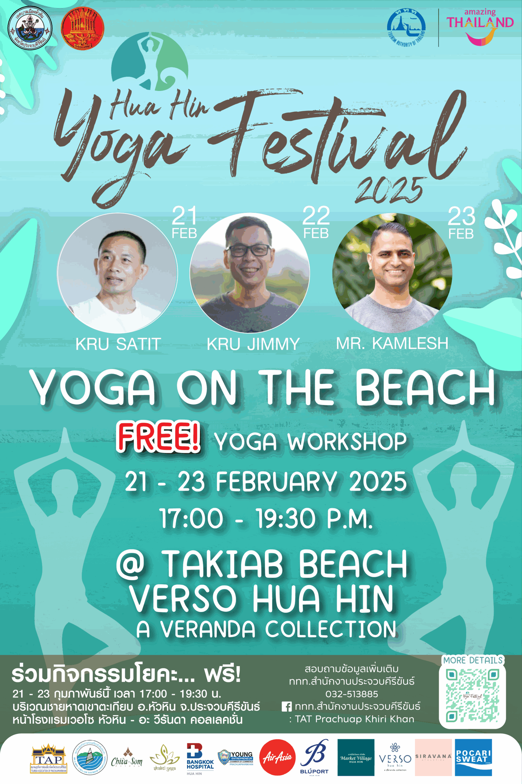 🌊🧘🏻♀️ กิจกรรมสอนโยคะฟรี Yoga on the beach จัดในวันที่ 21 – 23 กุมภาพันธ์ 2568 เวลา 17.00 – 19.30 น. ที่บริเวณหาดเขาตะเกียบหน้าโรงแรมเวอร์โซ หัวหิน – อะ วีรันดา คอลเลคชั่น