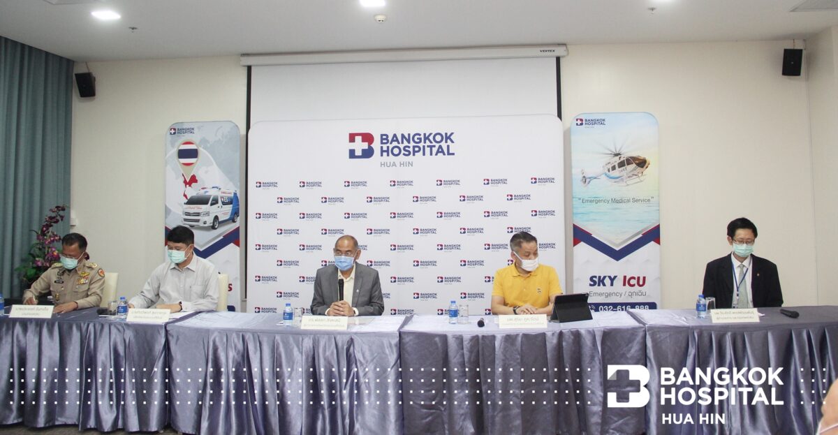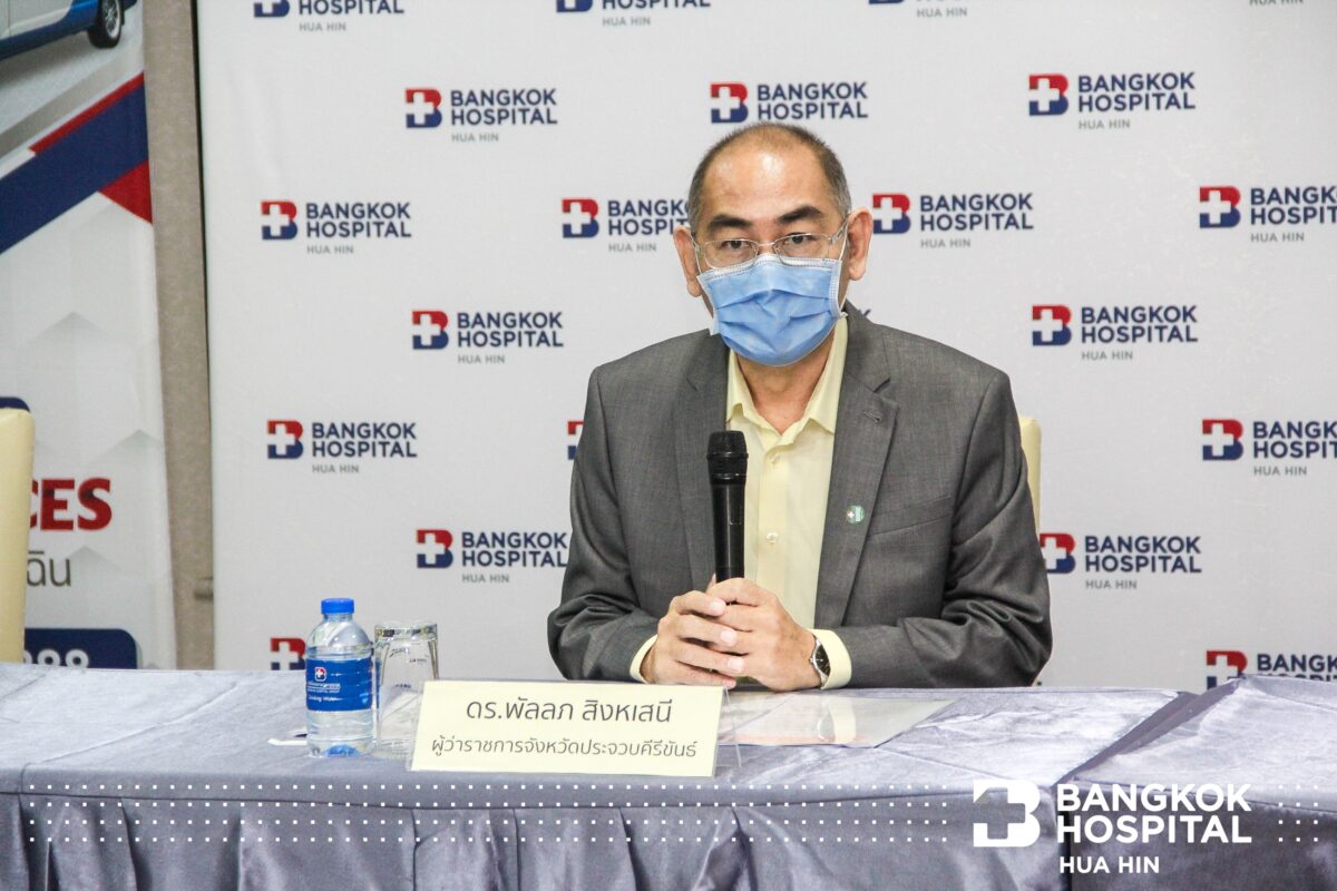 ดร.พัลลภ สิงหเสนี ผู้ว่าราชการจังหวัดประจวบคีรีขันธ์ พร้อมด้วย นพ.สุริยะ คูหะรัตน์ นายแพทย์สาธารณสุขจังหวัดประจวบคีรีขันธ์ นพ.วีระศักดิ์ พงษ์พัฒนพันธุ์ ผู้อำนวยการ รพ.กรุงเทพหัวหิน นายกิตติพงศ์ สุขภาคกุล ปลัดจังหวัดประจวบคีรีขันธ์ และ นายประยงค์ จันทเต็ง นายอำเภอหัวหิน ร่วมกันแถลงข่าวความสำเร็จในการรักษาชาวต่างชาติผู้ติดเชื้อไวรัสโควิด-19 รายสุดท้ายหายแล้วที่โรงพยาบาลกรุงเทพหัวหิน และแถลงสรุปจังหวัดประจวบคีรีขันธ์ ไม่พบผู้ติดเชื้อต่อเนื่องมาแล้ว 19 วัน ณ ห้องประชุม 1 ชั้น 3 โรงพยาบาลกรุงเทพหัวหิน เมื่อวันที่ 22 เมษายน 2563