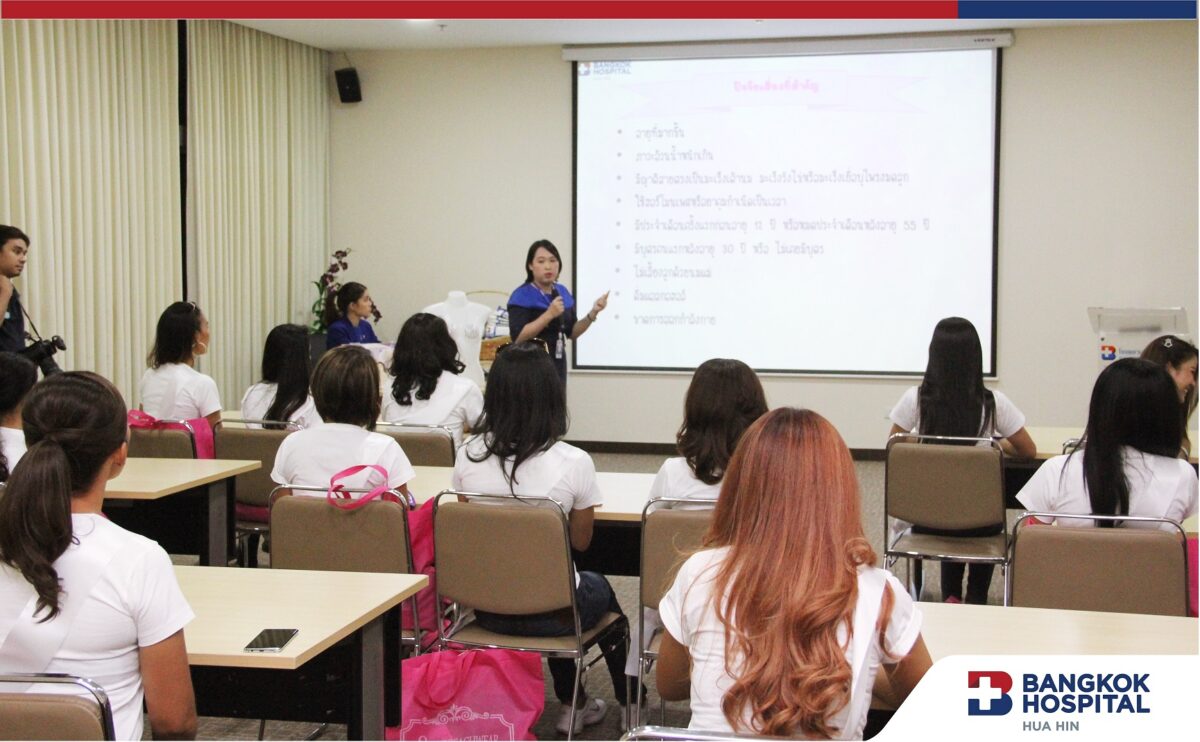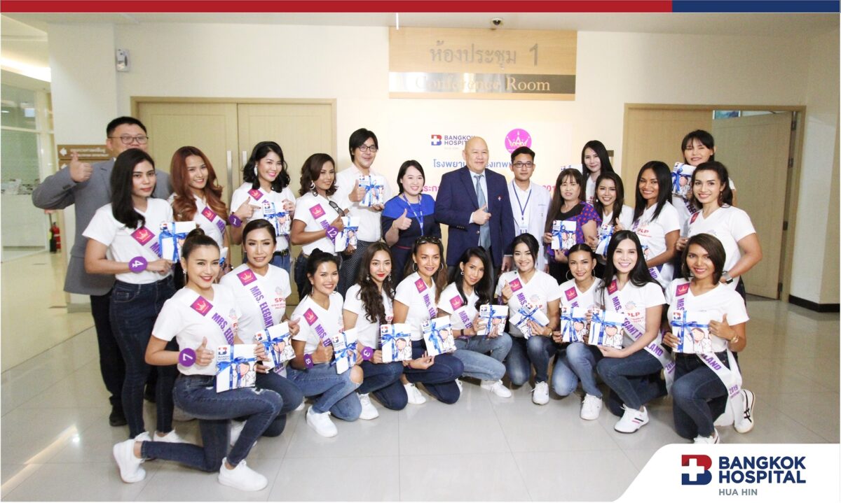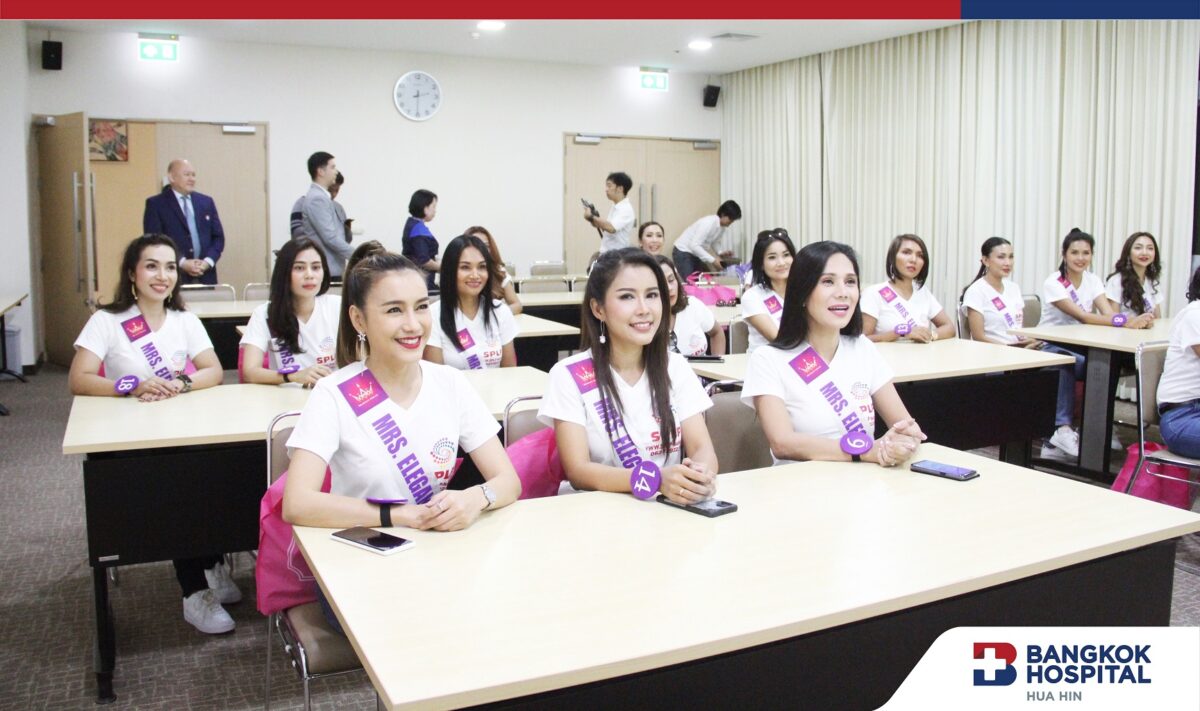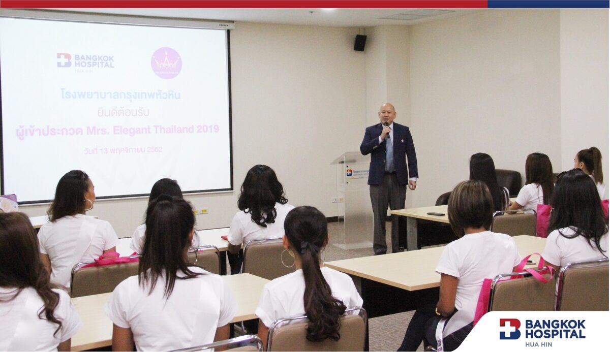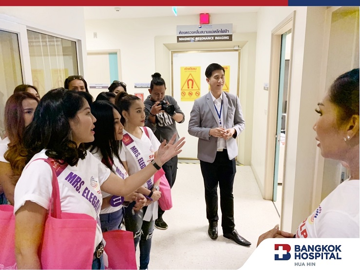 วันที่ 13 พฤศจิกายน 2562 โรงพยาบาลกรุงเทพหัวหินให้การต้อนรับคณะผู้เข้าประกวด Mrs. Elegant Thailand 2019 โดย นพ.พงษ์ศักดิ์ บุญยะลีพรรณ ผู้ช่วยผู้อำนวยการโรงพยาบาล และ คุณเชษฐพล มณีฉาย ผู้จัดการฝ่ายการตลาดและการสื่อสารองค์กร ให้การต้อนรับ โดยคณะสาวงามผู้เข้าประกวด ได้รับฟังบรรยายเรื่อง “รู้เท่าทันมะเร็งเต้านม” พร้อมสาธิตวิธีการตรวจเต้านมด้วยตัวเอง” โดย คุณศุจิกา สำราญใจ หัวหน้าพยาบาลแผนกผู้ป่วยนอก และ “Smart High Hell and Safety Management” โดยคุณกานต์ หงษ์เพ็ชร นักกายภาพบำบัด พร้อมกันนี้ยังได้เข้าเยี่ยมชมห้องตรวจมะเร็งเต้านมด้วยเครื่องดิจิตอลแมมโมแกรม เพื่อให้ความรู้และรณรงค์ให้ผู้หญิงยุคปัจจุบันตื่นตัวกับการดูแลสุขภาพของตนเองอย่างถูกต้อง โดยในงานนี้ได้รับความสนใจจากผู้เข้าประกวดทุกท่านเป็นอย่างมาก