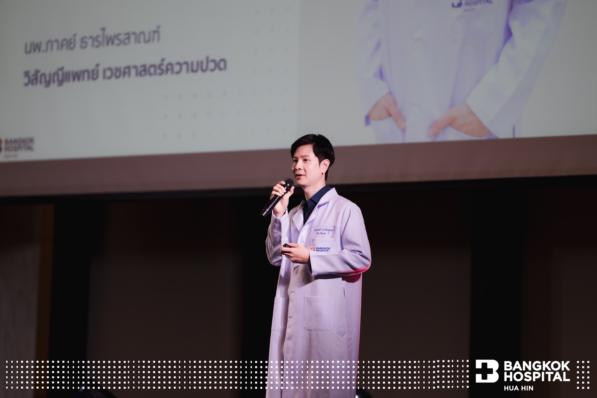 และ นพ.ภาคย์ ธารไพรสาณฑ์ วิสัญญีแพทย์ เวชศาสตร์ความปวด โรงพยาบาลกรุงเทพหัวหิน บรรยายในหัวข้อ “นวัตกรรมการรักษาปวดหลัง ปวดคอ ปวดมะเร็ง ที่ทันสมัย ไม่ต้องผ่าตัด”