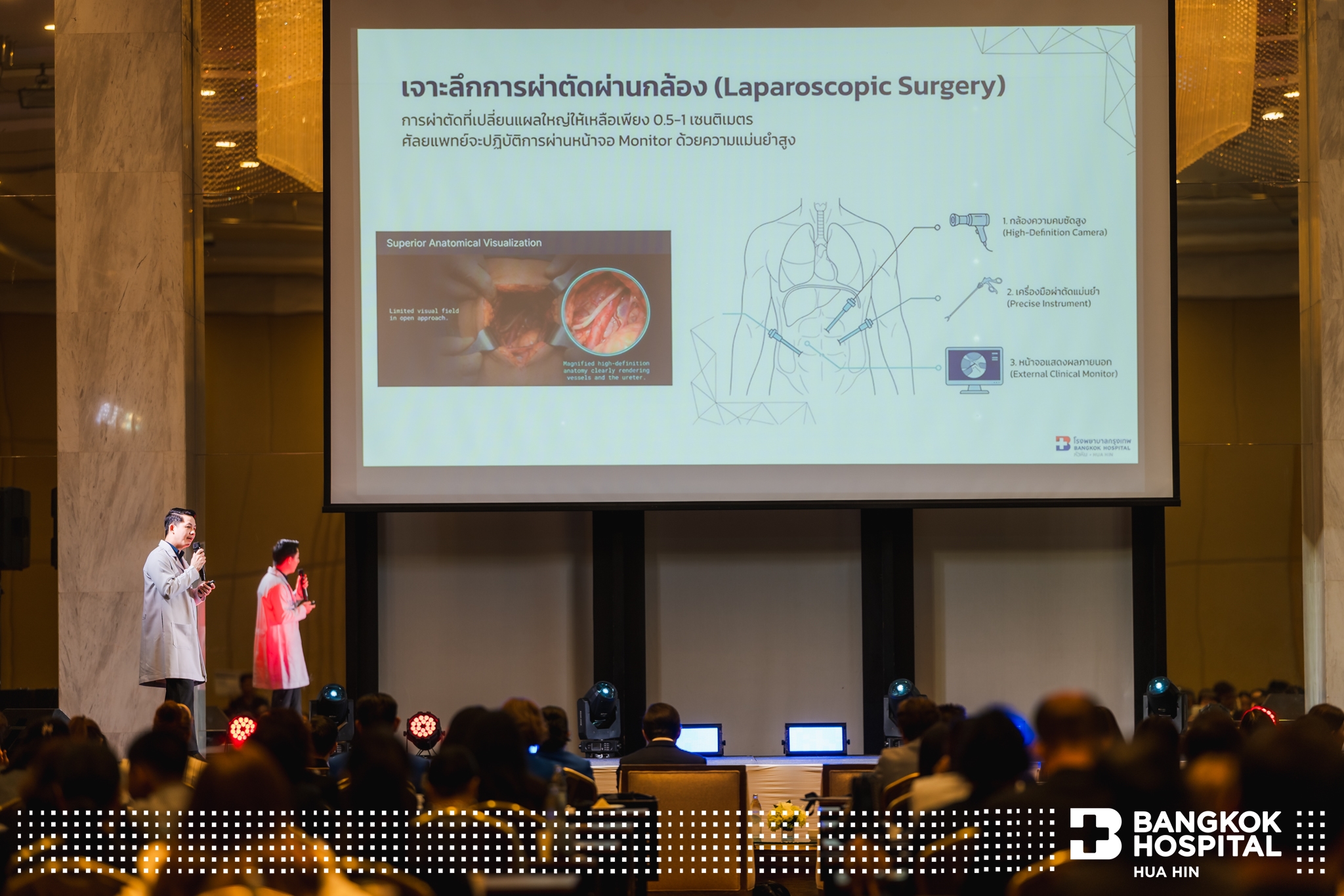 นพ.ณัฐพร นวลอุทัย ผู้อำนวยการแผนกศัลยกรรม โรงพยาบาลกรุงเทพหัวหิน บรรยายในหัวข้อ “แผลเล็ก ผลลัพธ์ใหญ่: ทำไมการผ่าตัดส่องกล้องจึงเป็นทางเลือกหลักในปัจจุบัน”