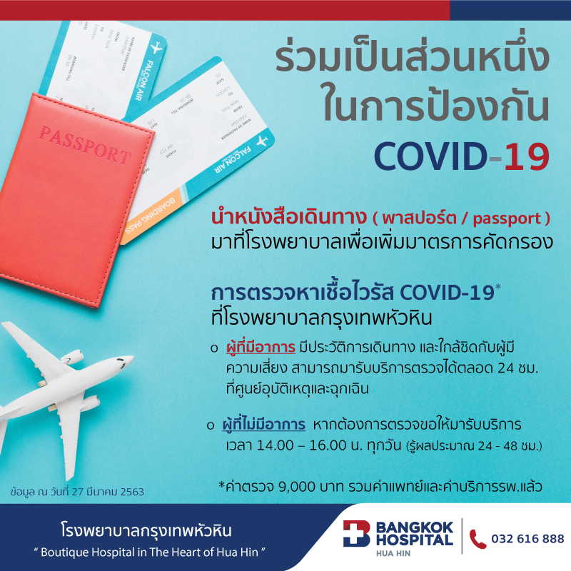 เนื่องด้วยสถานการณ์ปัจจุบัน ทางโรงพยาบาลกรุงเทพหัวหิน ขอความร่วมมือท่านผู้รับบริการนำหนังสือเดินทาง (passport) มาที่โรงพยาบาลเพื่อเพิ่มมาตรการคัดกรอง