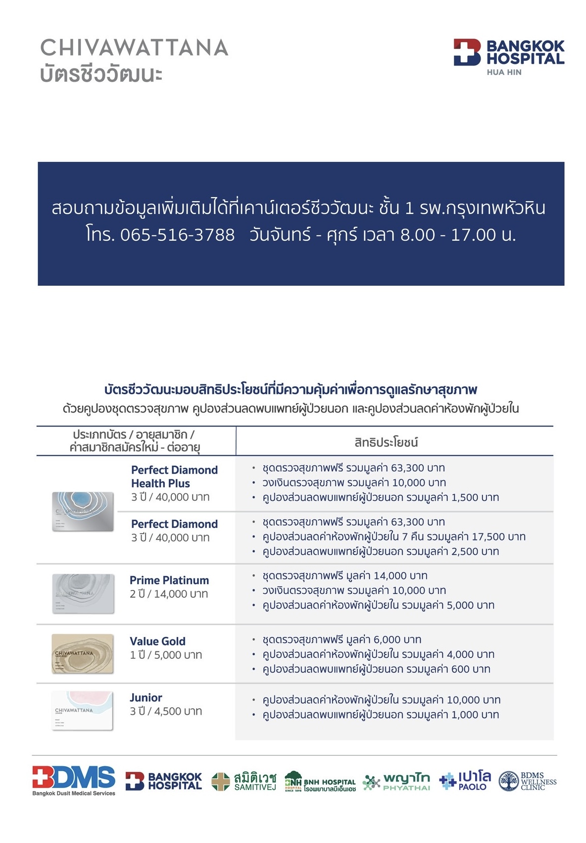 สมัครสมาชิก หรือสอบถามข้อมูลสิทธิประโยชน์เพิ่มเติม ☎ เจ้าหน้าที่ชีววัฒนะ รพ.กรุงเทพหัวหิน โทร./LINE: 065-516-3788