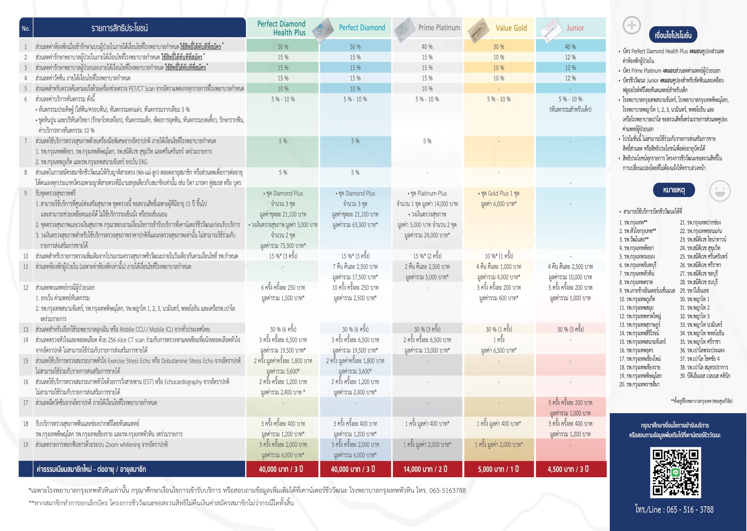 * รายละเอียดส่วนลดและชุดตรวจสุขภาพต่าง ๆ เป็นไปตามเงื่อนไขที่โรงพยาบาลกำหนด