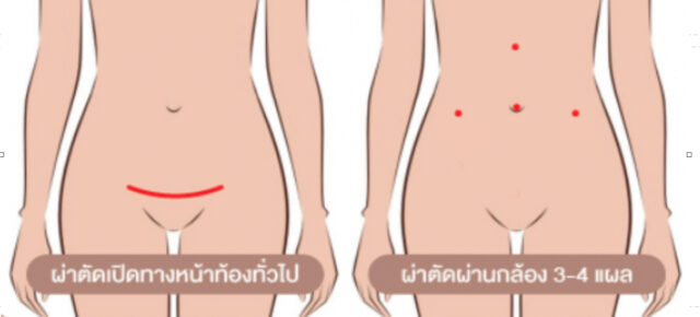 แบบเปิดทางหน้าท้อง และ แผลจากการผ่าตัดมดลูกแบบส่องกล้อง 4 จุดกรณีมดลูกมีขนาดใหญ่