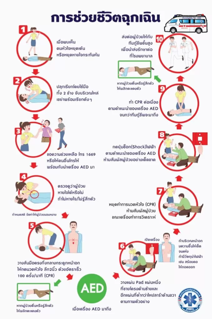 สถาบันการแพทย์ฉุกเฉินแห่งชาติ (สพฉ.) รณรงค์อย่างต่อเนื่องถึงการเรียนรู้ขั้นตอนของห่วงโซ่การรอดชีวิต เพื่อเป็นการเพิ่มโอกาสการกู้ชีพให้ผู้ป่วยฉุกเฉิน หัวใจ หยุดเต้นฉียบพลันนอกโรงพยาบาล โดยสิ่งที่สำคัญของกระบวนการกู้ชีพ คือ การใช้เครื่องฟื้นคืนคลื่นหัวใจด้วยไฟฟ้าชนิดอัตโนมัติ หรือ AED ซึ่ง ขณะนี้ในประเทศไทยยังไม่มีการใช้อย่างแพร่หลาย ด้วยเพราะข้อจำกัดหลายประการ อาทิ อุปกรณ์ดังกล่าวมีราคาสูง แต่ถือเป็นโอกาสอันดีที่ สพฉ. ได้รับความร่วมมือจากหน่วยงานเอกชนจากหลายองค์กร บริจาคเครื่องฟื้นคืนคลื่นหัวใจด้วยไฟฟ้าชนิดอัตโนมัติ จำนวนหนึ่ง ซึ่งขั้นตอนต่อไป สพฉ. จะนำเครื่องดังกล่าวไปติดตั้งให้กับหน่วยงานและพื้นที่สาธารณะต่างๆ ทั้งในกรุงเทพมหานครและต่างจังหวัด เพื่อรณรงค์ให้มีการติดตั้งเครื่องAED ในที่สาธารณะ ที่มีความเสี่ยงต่อภาวะหัวใจหยุดเต้นเฉียบพลันของผู้มาใช้บริการ