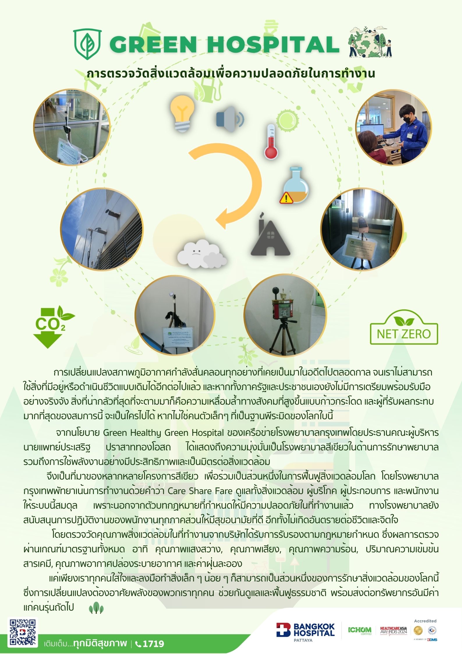 จึงเป็นที่มาของหลากหลายโครงการสีเขียว เพื่อร่วมเป็นส่วนหนึ่งในการฟื้นฟูสิ่งแวดล้อมโลก โดยโรงพยาบาลกรุงเทพพัทยาเน้นการทำงานด้วยคำว่า Care Share Fare ดูแลทั้งสิ่งแวดล้อม ผู้บริโภค ผู้ประกอบการ และพนักงาน ให้ระบบนี้สมดุล เพราะนอกจากตัวบทกฏหมายที่กำหนดให้มีความปลอดภัยในที่ทำงานแล้ว ทางโรงพยาบาลยังสนับสนุนการปฏิบัติงานของพนักงานทุกภาคส่วนให้มีสุขอนามัยที่ดี อีกทั้งไม่เกิดอันตรายต่อชีวิตและจิตใจ