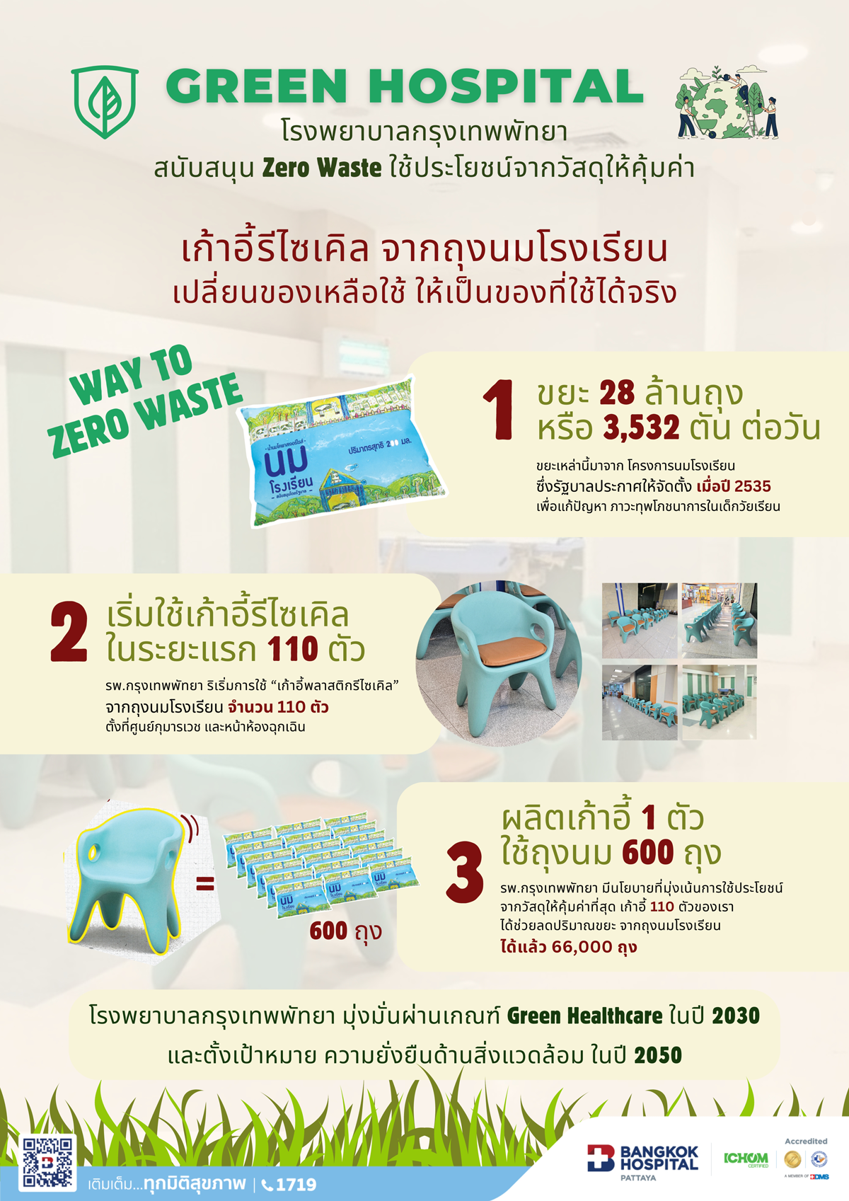 โรงพยาบาลกรุงเทพพัทยา มีนโยบายที่มุ่งเน้นการใช้ประโยชน์จากวัสดุให้คุ้มค่าที่สุด และช่วยหาทางออกที่ยั่งยืนให้กับขยะจากถุงนมโรงเรียนได้อย่างเป็นรูปธรรม โดยริเริ่มการใช้ “เก้าอี้พลาสติกรีไซเคิล” ซึ่งเป็นผลิตภัณฑ์พลาสติกรีไซเคิลจากถุงนมโรงเรียน โดยกระบวนการผลิตเก้าอี้ 1 ตัว จะใช้ถุงนมที่แห้งและสะอาดประมาณ 600 ถุงในการผลิต และถูกนำไปใช้ในพื้นที่บริการของโรงพยาบาล โดยในระยะแรกได้สั่งเข้ามา จำนวน 110 ตัว ตั้งอยู่ที่ศูนย์กุมารเวช และหน้าห้องฉุกเฉิน จึงเท่ากับว่าตอนนี้ โรงพยาบาลกรุงเทพพัทยา ช่วยลดปริมาณขยะจากถุงนมโรงเรียนไปได้ถึง 66,000 ถุง