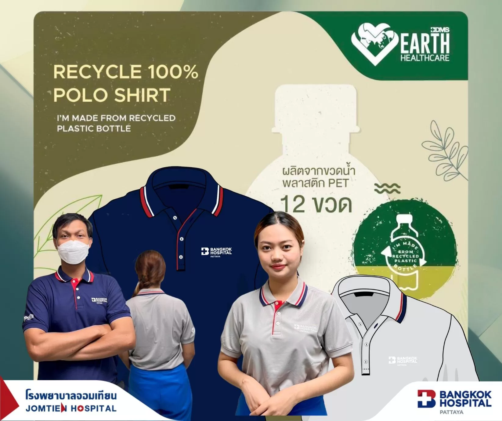 ในรอบปีที่ผ่านมา มีไอเทมหนึ่งที่น่าสนใจอย่างมาก ก็คือ การนำขวดพลาสติกมารีไซเคิล พร้อมกับทำเสื้อยืดที่มีความใส่ใจเรื่องของสิ่งแวดล้อม ซึ่งเราได้เริ่มผลิตใช้เป็นเสื้อโปโลยูนิฟอร์มของพนักงานโรงพยาบาล ทั้งผู้บริหาร แพทย์ พยาบาล ตลอดจนพนักงานทุกคนภูมิใจและยินดีที่จะร่วมเป็นจิ๊กซอว์ชิ้นเล็กๆ ในการเติมเต็มภาพใหญ่ของการอนุรักษ์สิ่งแวดล้อมโลก