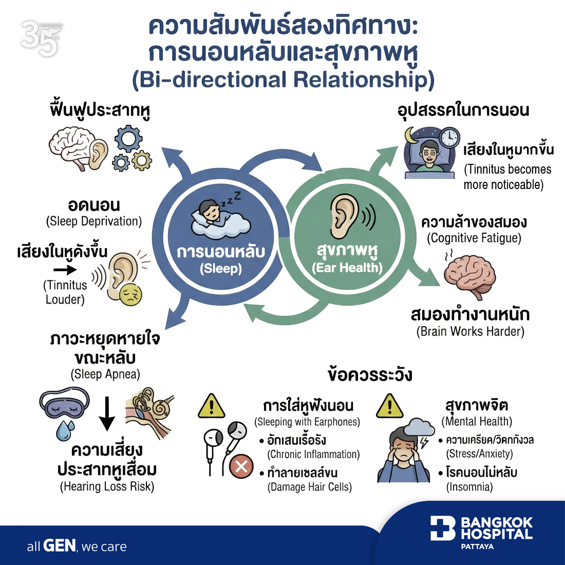 การนอนหลับส่งผลต่อสุขภาพหูอย่างมีนัยสำคัญ โดยทั้งสองส่วนมีความสัมพันธ์กันแบบสองทิศทาง (Bi-directional) ดังนี้