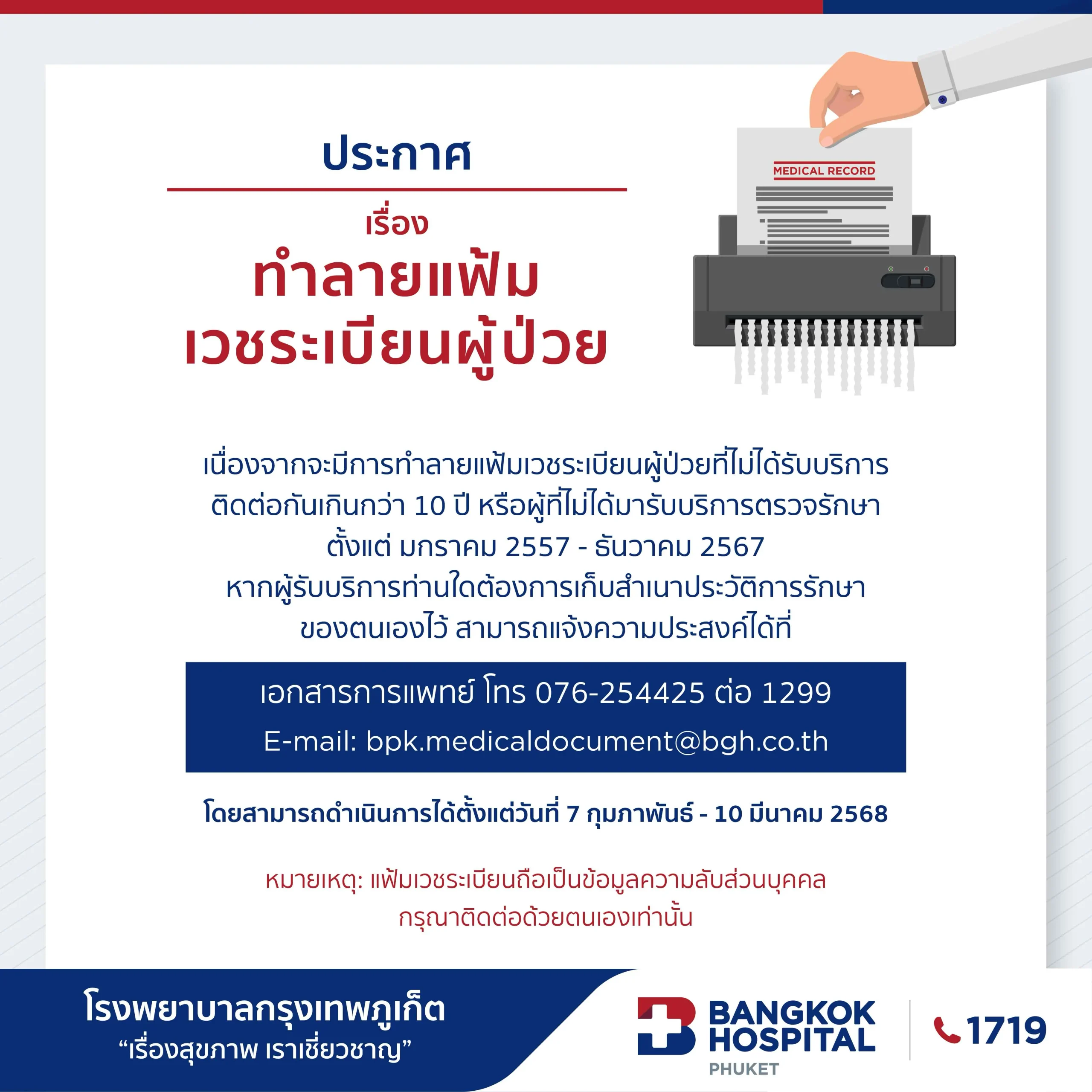 ประกาศ เรื่องทำลายแฟ้มเวชระเบียนผู้ป่วย< 1 นาทีในการอ่านข้อมูลโดยโรงพยาบาลกรุงเทพภูเก็ตอัปเดตเมื่อ: 03 ต.ค. 2568แพ็กเกจแนะนำเช็กอัพ เช็กชัวร์ ส่งท้ายปี มั่นใจ! สุขภาพดีแพ็กเกจดูแลสุขภาพผู้ป่วย NCDSWellness Retreat Programโรงพยาบาลกรุงเทพภูเก็ตอัปเดตเมื่อ: 03 ต.ค. 2568 แพ็กเกจและโปรโมชั่นเช็กอัพ เช็กชัวร์ ส่งท้ายปี มั่นใจ! สุขภาพดี450 บาทรายละเอียดแพ็กเกจดูแลสุขภาพผู้ป่วย NCDS5,790 บาทรายละเอียดWellness Retreat Program64,074 บาทรายละเอียดดูแพ็กเกจอื่น ๆข่าวสารและกิจกรรมดูทั้งหมดข่าวสารและกิจกรรมHeart To Heart ประจำปี 2569BDMS จังหวัดภูเก็ต ผนึกกำลังสถานศึกษา เดินหน้าโครงการ “Health Buddy @ School” เสริมสร้างสุขภาพนักเรียนแบบองค์รวมRussian – Thai Investment Forum 2025ดูทั้งหมด