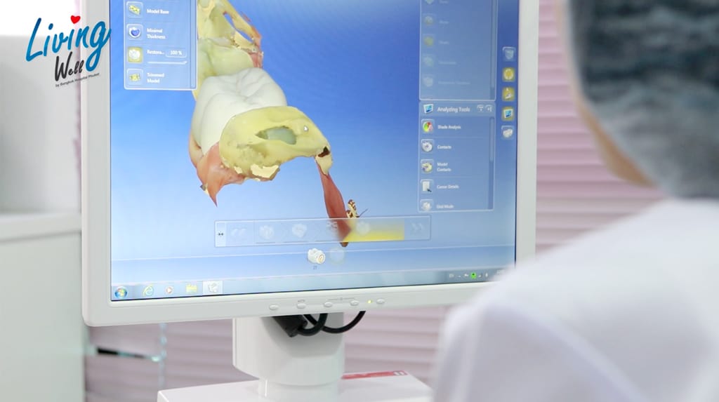 - ทันตแพทย์จะทำการออกแบบชิ้นงานโดยใช้ซอฟท์แวร์ CEREC ซึ่งเป็นโปรแกรมเฉพาะที่จะทำการแปลงภาพที่ได้จากการสแกนเป็นโมเดล 3 มิติ ให้เห็นภาพฟันข้างเคียงและฟันคู่สบ คำนวณขนาด ความกว้าง ความสูงและออกแบบชิ้นงานให้เข้ากับฟันข้างเคียงได้พอดี มีขนาดและรูปร่างที่เหมาะสมสวยงาม