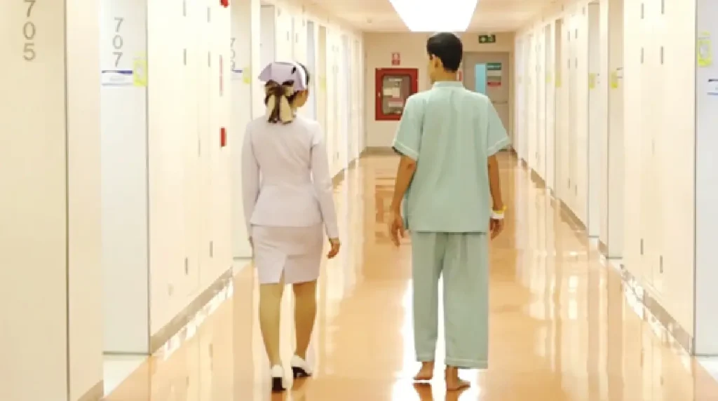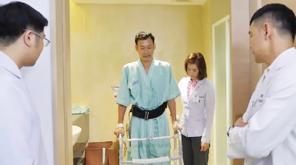 วันถัดไปหลังผ่าตัด (Day 1) แพทย์จะเข้ามาเยี่ยมผู้ป่วย ประเมินอาการโดยรวม แสดงภาพถ่ายรังสีหลังการผ่าตัด และนำผู้ป่วยลุกนั่ง ยืน และเดิน โดยมีอุปกรณ์ช่วยเดิน พยาบาล และทีมกายภาพช่วยดูแล