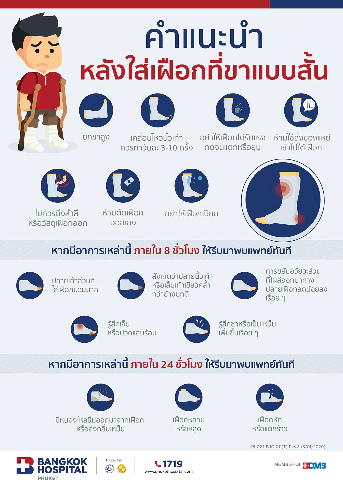 คำแนะนำหลังใส่เฝือกที่ขาแบบสั้น< 1 นาทีในการอ่านข้อมูลโดยโรงพยาบาลกรุงเทพภูเก็ตอัปเดตเมื่อ: 15 ธ.ค. 2568แพ็กเกจแนะนำไม่มีส่วนเกินค่าห้อง สำหรับลูกค้าประกันไทยVitamin Therapy LoungeVitamin Therapy Loungeโรงพยาบาลกรุงเทพภูเก็ตอัปเดตเมื่อ: 15 ธ.ค. 2568 คำแนะนำหลังใส่เฝือกที่ขาแบบสั้น ยกขาสูง เคลื่อนไหวนิ้วเท้า ควรทำวันละ 3-10 ครั้ง อย่าให้เฝือกได้รับแรง กดจนแตกหรือยุบ ห้ามใช้สิ่งของแหย่ เข้าไปใต้เฝือก ไม่ควรดึงสำลี หรือวัสดุเฝือกออก ห้ามตัดเฝือกออกเอง อย่าให้เฝือกเปียก แพ็กเกจและโปรโมชั่นไม่มีส่วนเกินค่าห้อง สำหรับลูกค้าประกันไทยรายละเอียดVitamin Therapy Lounge3,400 - 61,000 บาทรายละเอียดVitamin Therapy Lounge3,400 - 61,000 บาทรายละเอียดดูแพ็กเกจอื่น ๆข้อมูลสุขภาพดูข้อมูลสุขภาพอื่น ๆข้อมูลสุขภาพรพ.กรุงเทพภูเก็ต ปรับแนวทางการจ่ายยาผู้ป่วยนอก (OPD) เพื่อเตรียมความพร้อมรับสถานการณ์ความไม่สงบในตะวันออกกลางเครือโรงพยาบาลกรุงเทพ จังหวัดภูเก็ตร่วมปลูกป่าโกงกาง สร้างพื้นที่สีเขียวชายฝั่งคุณณปภัช โชติบุญฐิสา รับเข็มเชิดชูเกียรติ สพฉ. ในเวที National EMS Forum 2026ดูข้อมูลสุขภาพอื่น ๆ