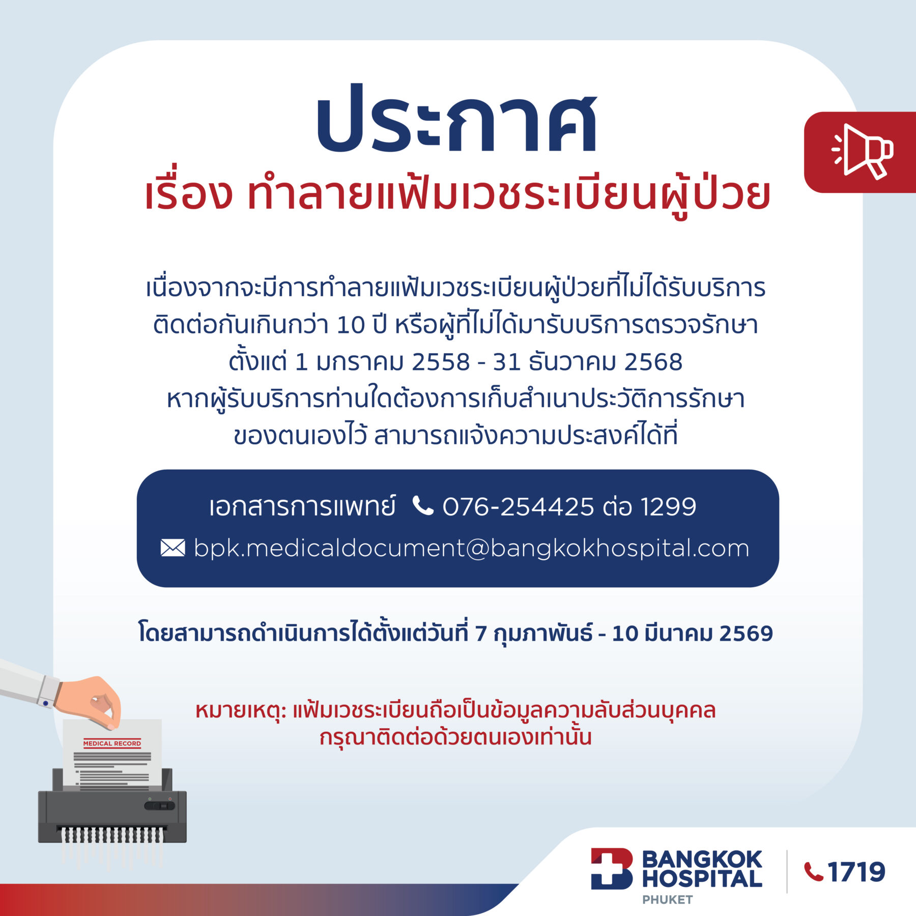 ประกาศทำลายแฟ้ม เวชระเบียนผู้ป่วย ประจำปี 2569< 1 นาทีในการอ่านข้อมูลโดยโรงพยาบาลกรุงเทพภูเก็ตอัปเดตเมื่อ: 06 ก.พ. 2569แพ็กเกจแนะนำแพ็กเกจรักษาโรคไข้หวัดใหญ่ รับบริการที่คลินิกกรุงเทพภูเก็ต ทั้ง 6 สาขา (ไม้ขาว, สนามบิน, ลากูน่า, ราไวย์, กมลา, เขาหลัก)แพ็กเกจรักษาท้องเสีย รับบริการที่คลินิกกรุงเทพภูเก็ต ทั้ง 6 สาขา (ไม้ขาว, สนามบิน, ลากูน่า, ราไวย์, กมลา, เขาหลัก)แพ็กเกจตรวจสุขภาพ รับบริการที่คลินิกกรุงเทพภูเก็ต ทั้ง 6 สาขา (ไม้ขาว, สนามบิน, ลากูน่า, ราไวย์, กมลา, เขาหลัก)โรงพยาบาลกรุงเทพภูเก็ตอัปเดตเมื่อ: 06 ก.พ. 2569แพ็กเกจและโปรโมชั่นแพ็กเกจรักษาโรคไข้หวัดใหญ่ รับบริการที่คลินิกกรุงเทพภูเก็ต ทั้ง 6 สาขา (ไม้ขาว, สนามบิน, ลากูน่า, ราไวย์, กมลา, เขาหลัก)1,500 บาทรายละเอียดแพ็กเกจรักษาท้องเสีย รับบริการที่คลินิกกรุงเทพภูเก็ต ทั้ง 6 สาขา (ไม้ขาว, สนามบิน, ลากูน่า, ราไวย์, กมลา, เขาหลัก)1,500 - 2,900 บาทรายละเอียดแพ็กเกจตรวจสุขภาพ รับบริการที่คลินิกกรุงเทพภูเก็ต ทั้ง 6 สาขา (ไม้ขาว, สนามบิน, ลากูน่า, ราไวย์, กมลา, เขาหลัก)1,499 บาทรายละเอียดดูแพ็กเกจอื่น ๆข่าวสารและกิจกรรมดูทั้งหมดข่าวสารและกิจกรรมเปิดตัว “เครือข่ายคลินิกกรุงเทพภูเก็ต” อย่างเป็นทางการ ภายใต้แนวคิด ‘1719 Everywhere with you’MOTHER CLASS "คุณแม่คุณภาพ" ประจำปี 2569เครือโรงพยาบาลกรุงเทพจังหวัดภูเก็ต หารือ สปสช. เขต 11 และโรงพยาบาลมะเร็งสุราษฎร์ธานี เดินหน้าพัฒนาความร่วมมือด้านบริการสุขภาพประชาชนดูทั้งหมด