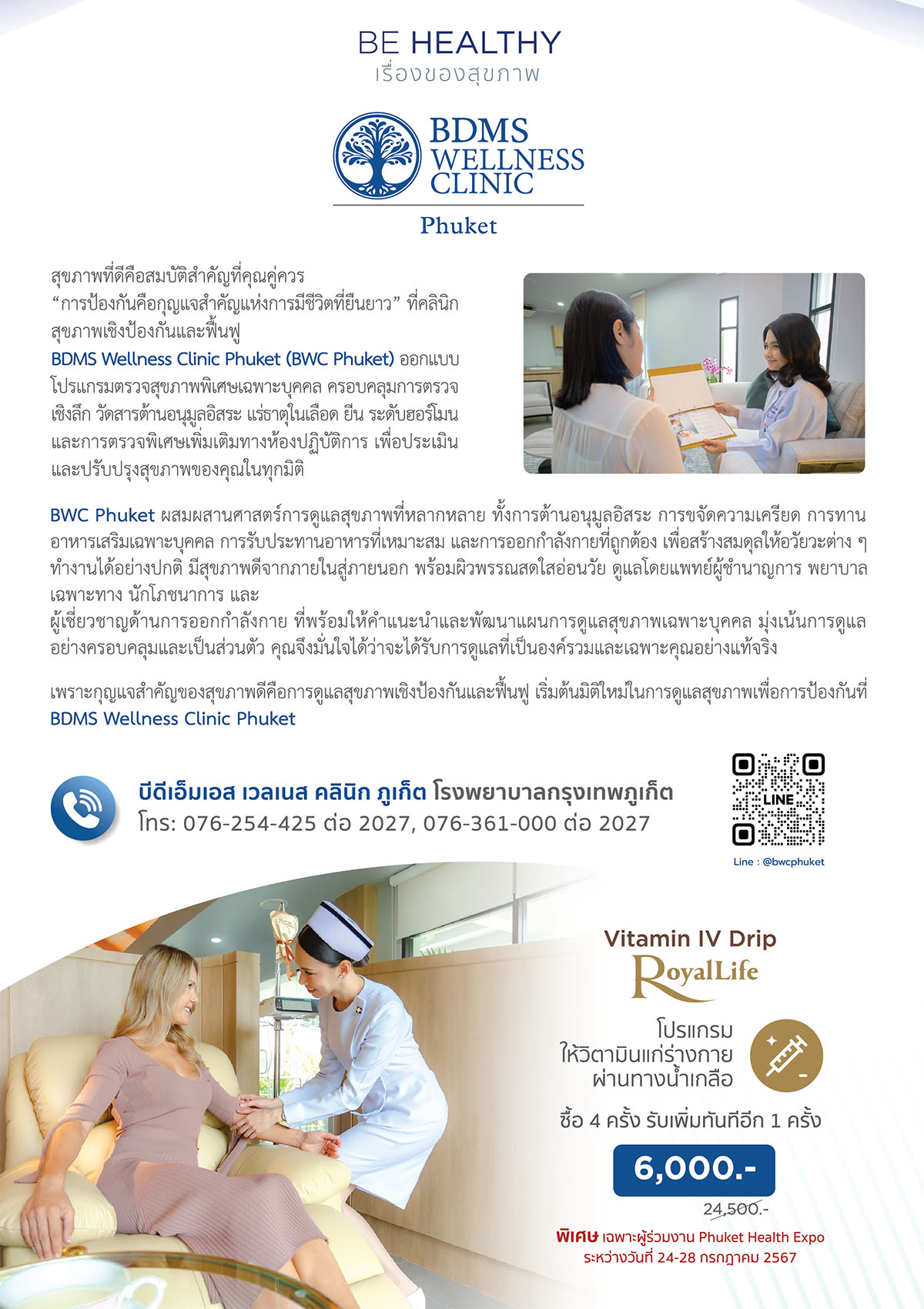 - เมื่อแสดงใบปลิวนี้ที่ BWC Phuket รพ.กรุงเทพภูเก็ต ภายในวันที่ 31 สิงหาคม 2567 ซื้อโปรแกรมให้วิตามินแก่ร่างกาย 1 ครั้ง ในราคา 2,500 บาท จากราคาปกติ 4,900 บาท