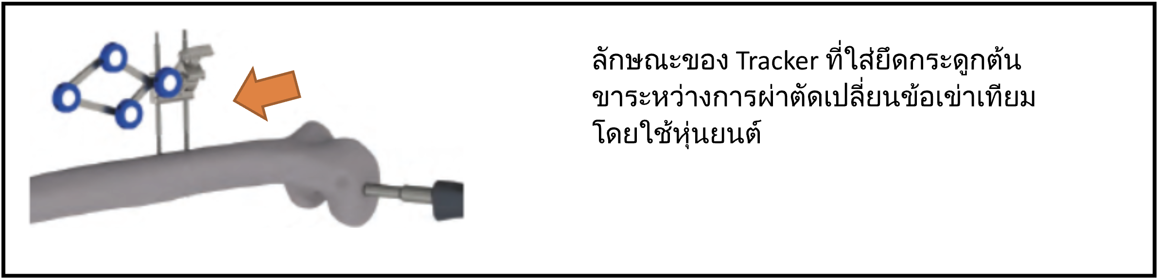 *อุปกรณ์ที่ยึดกับกระดูกเพื่อระบุตำแหน่ง (Tracker) จะทำหน้าที่เป็นตัวระบุจุดอ้างอิงของข้อเข่า เปรียบเสมือนระบบ GPS ในรถยนต์ที่ใช้บอกตำแหน่งว่าเราอยู่ตรงไหนบนแผนที่ อย่างไรก็ตาม ความแม่นยำของ GPS ในรถยนต์อาจคลาดเคลื่อนได้ในระดับหลายเมตร ในขณะที่ Tracker ที่ใช้ในหุ่นยนต์ช่วยผ่าตัดเปลี่ยนข้อเข่าเทียมมีความแม่นยำสูงมาก โดยมีความคลาดเคลื่อนน้อยกว่า 1 มิลลิเมตร