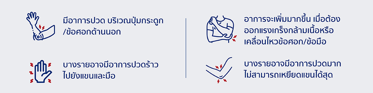 - พักการใช้งานข้อศอก/มือ หลีกเลี่ยงท่าทาง/กิจกรรมที่กระตุ้นให้มีอาการปวด