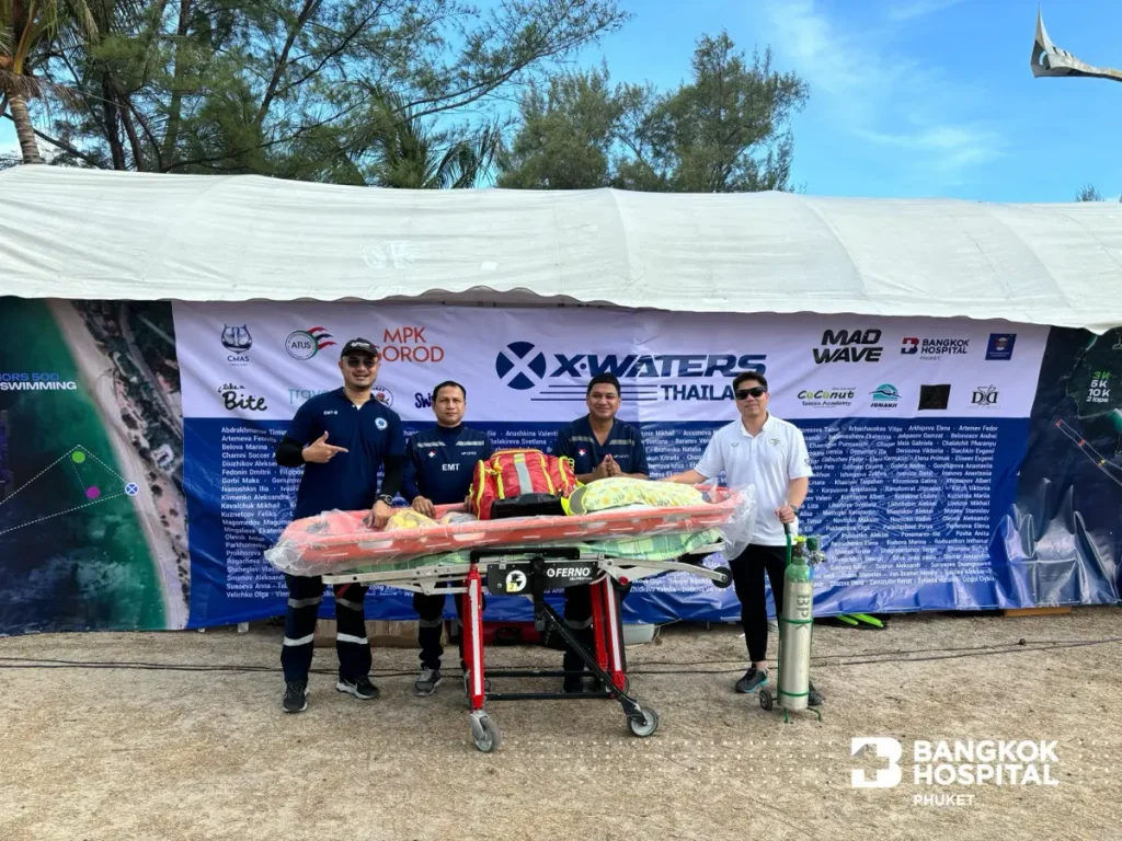 นายแพทย์พฤทธิ์ เกียรติตันสกุล ผู้อำนวยการศูนย์อุบัติเหตุและฉุกเฉินพร้อมด้วยทีมพยาบาล และบุคลากรทางการแพทย์จากโรงพยาบาลกรุงเทพภูเก็ตออกหน่วยปฐมพยาบาลดูแลสุขภาพและความปลอดภัยของผู้เข้าร่วมแข่งขันรายการ X-Waters Thailand 2025 นับเป็นอีกหนึ่งกิจกรรมที่โรงพยาบาลฯ มีส่วนร่วมในการสนับสนุนการแข่งขันกีฬาระดับนานาชาติ ดูแลสุขภาพประชาชนภายใต้มาตรฐานสากลเมื่อวันที่ 23 กุมภาพันธ์ 2568 ที่ผ่านมา ณ หาดกะรน จังหวัดภูเก็ต