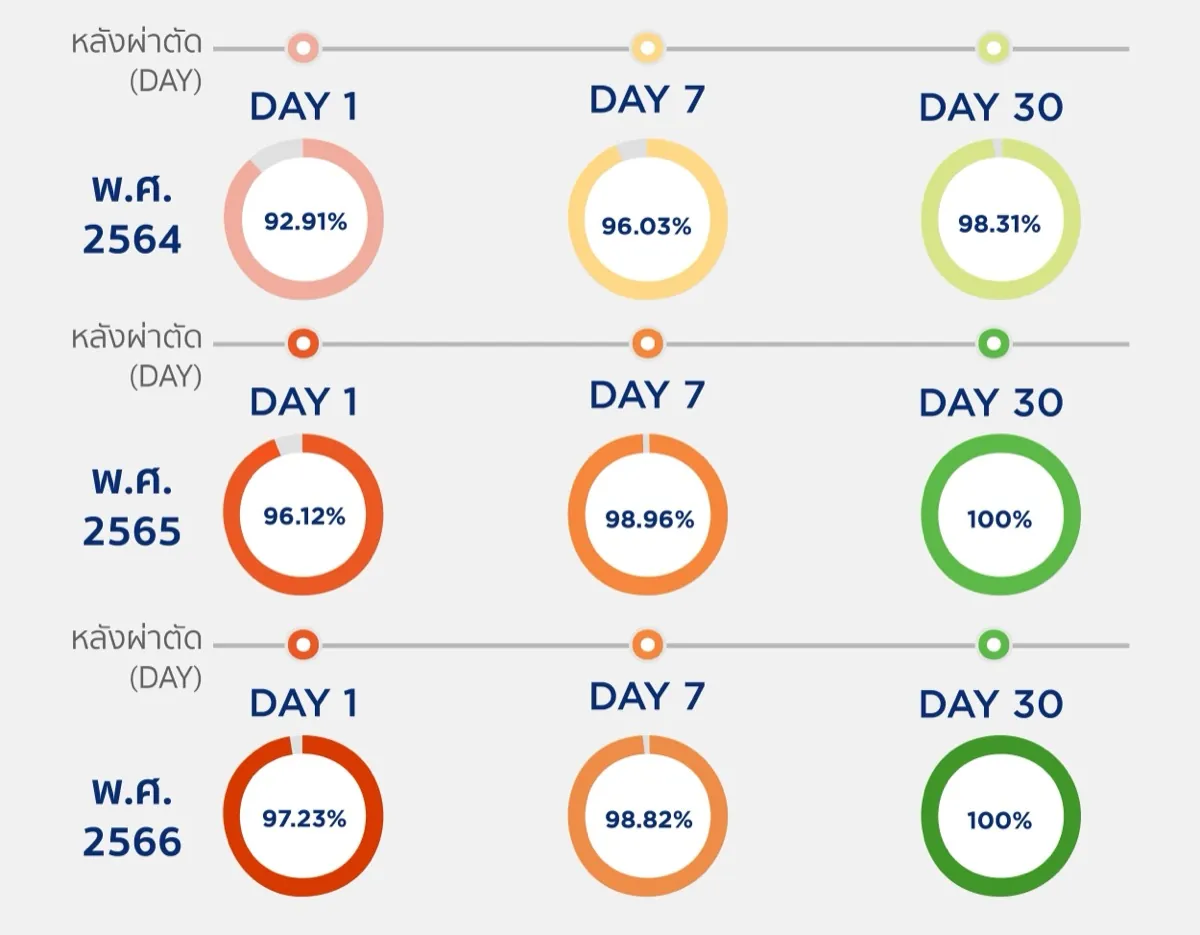 ในปี 2566 ผู้ป่วยโรคต้อกระจกของศูนย์จักษุ รพ. กรุงเทพภูเก็ต ที่ได้รับการรักษาโดยการผ่าตัด จะได้รับการติดตามอาการหลังผ่าตัด 1 วัน 7 วัน และ 30 วัน เพื่อประเมินการมองเห็นตามมาตรฐานสากล ซึ่งพบว่าผู้ป่วยที่เข้ามาติดตามอาการทั้งหมด มีการมองเห็นดีขึ้น และในกรณีที่ผู้ป่วยรับการผ่าตัดเปลี่ยนเลนส์ชนิดโฟกัสหลายระยะ ผู้ป่วยสามารถจะมองเห็นที่ไกลได้ดี และสามารถอ่านหนังสือได้โดยไม่ต้องใช้แว่น