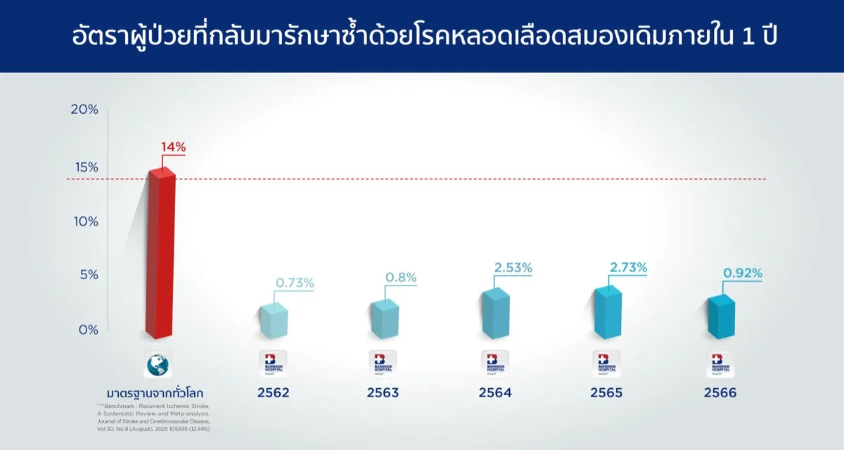 ในปี พ.ศ. 2562-2566 โรงพยาบาลกรุงเทพภูเก็ต มีผู้ป่วยที่กลับมารักษาซ้ำด้วยโรคหลอดเลือดสมองเดิม ภายใน 1 ปี เพียง 1.542%