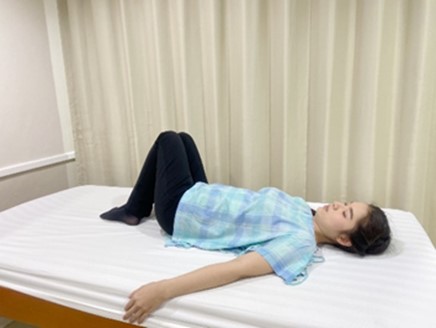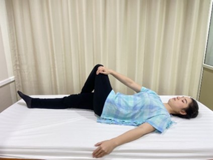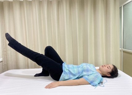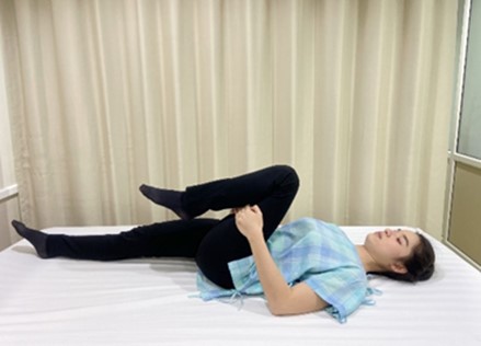 ท่าที่ 3 ขาข้างหนึ่งเหยียดตรง อีกข้างงอเข่างอสะโพกไขว้ไปยังขาที่เหยียดตรง ใช้มือข้างที่ขาเหยียดตรงเอื้อมมาจับขาข้างที่งอเข่าสะโพกให้รู้สึกตรง มืออีกด้านจับขอบเตียง