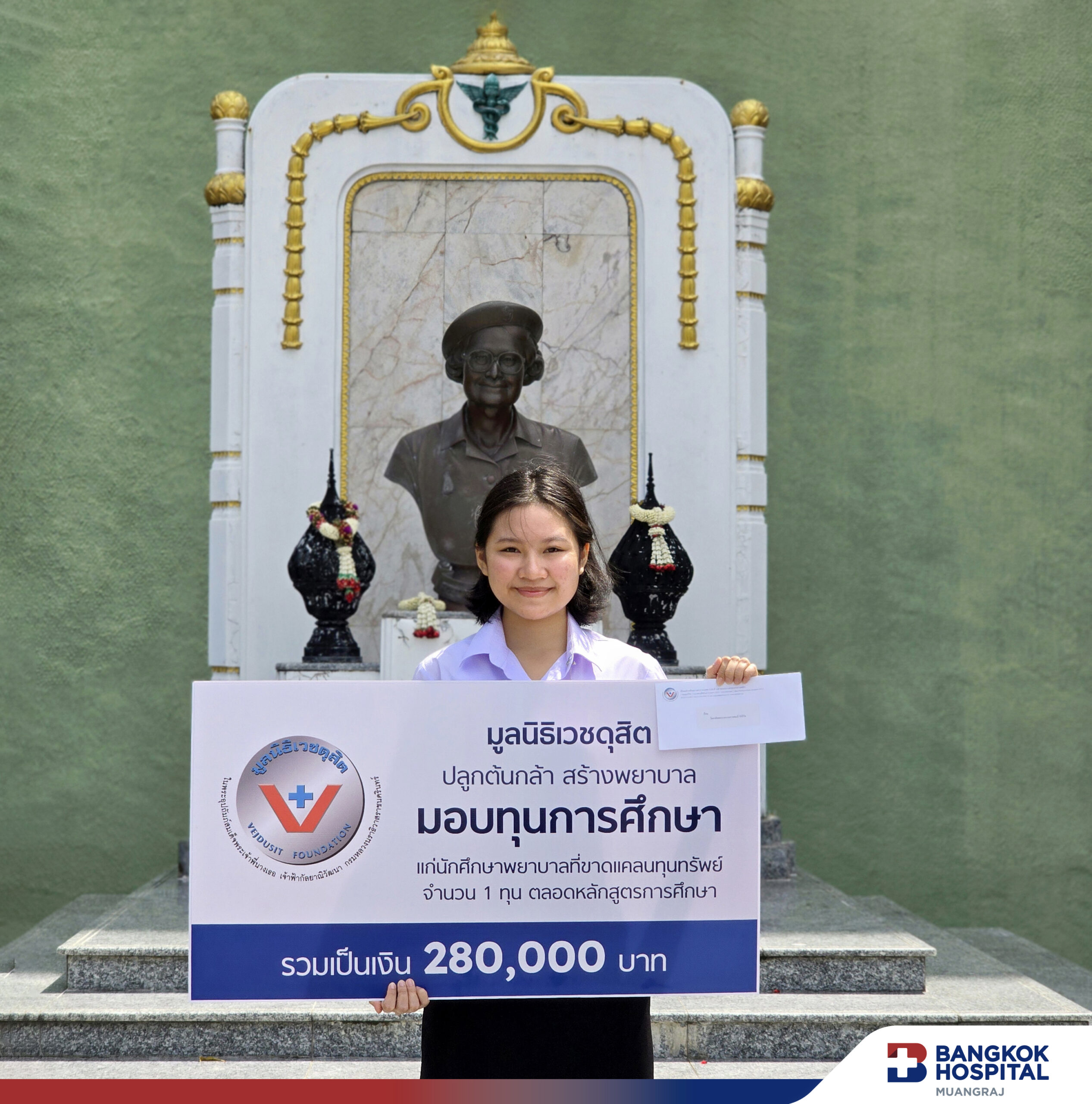 มูลนิธิเวชดุสิตฯ สนับสนุนทุนการศึกษาภายใต้โครงการ “เวชดุสิตฯ ปลูกต้นกล้า สร้างพยาบาล” ให้กับ นางสาวศุภณัฐ โสภาบุตร นักศึกษาพยาบาลศาสตร์บัณฑิตชั้นปีที่ 1 วิทยาลัยบรมราชชนนี จักรีรัช จังหวัดราชบุรี