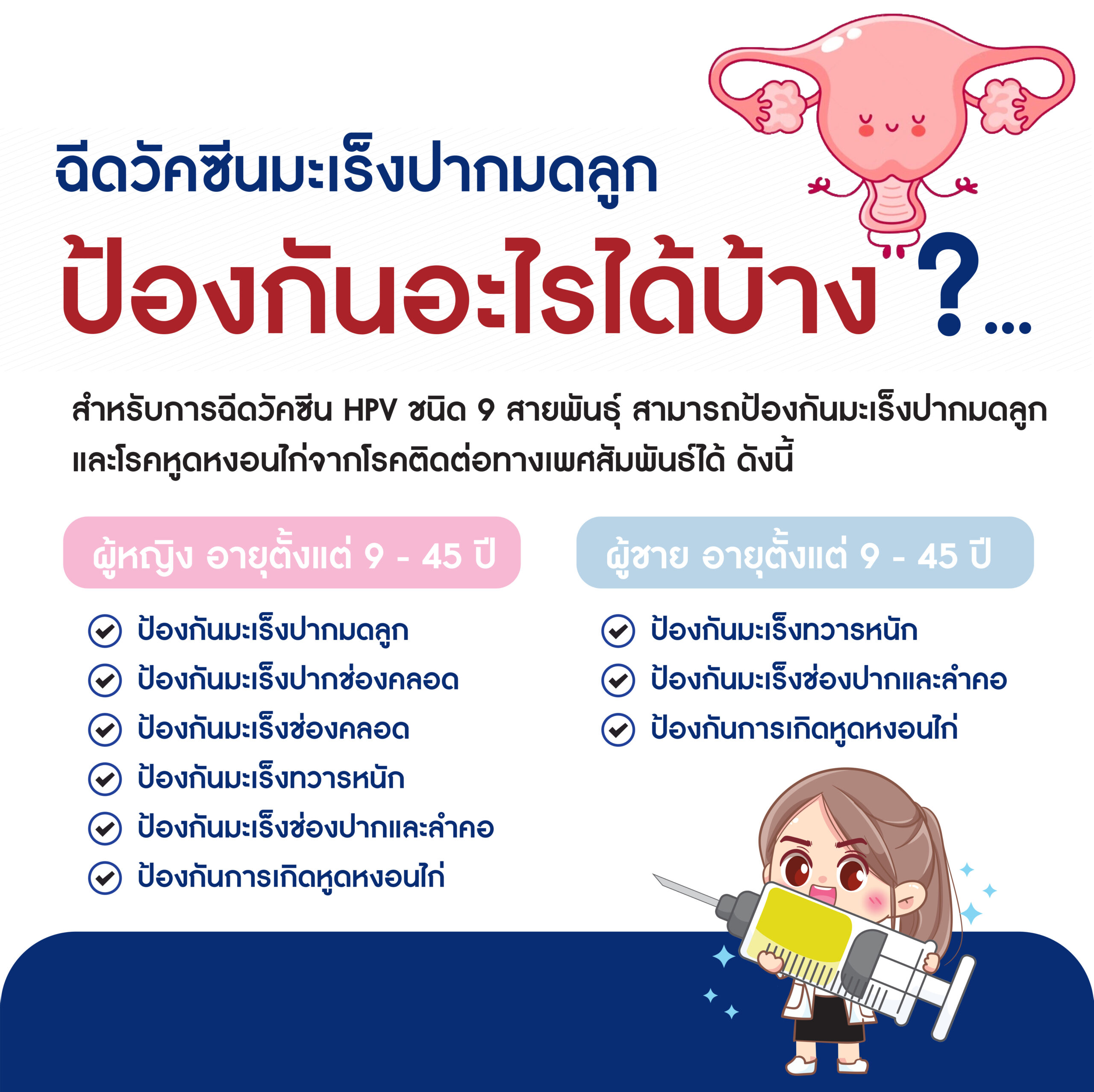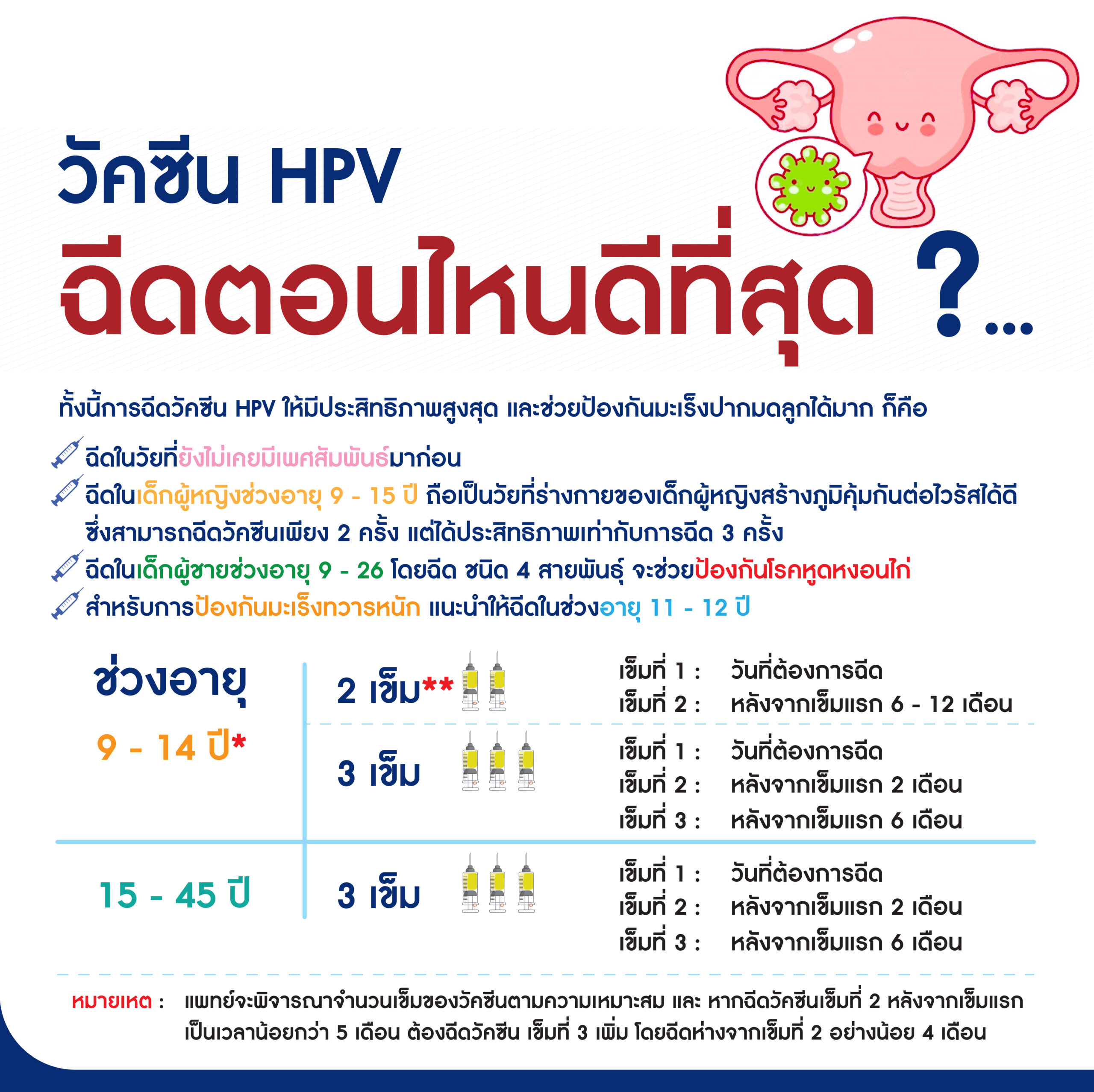 สรุปวัคซีน HPV สามารถฉีดได้ทั้งในหญิงและชาย อายุที่แนะนำให้ฉีดคือหลัง อายุ 9 ปี ขึ้นไป