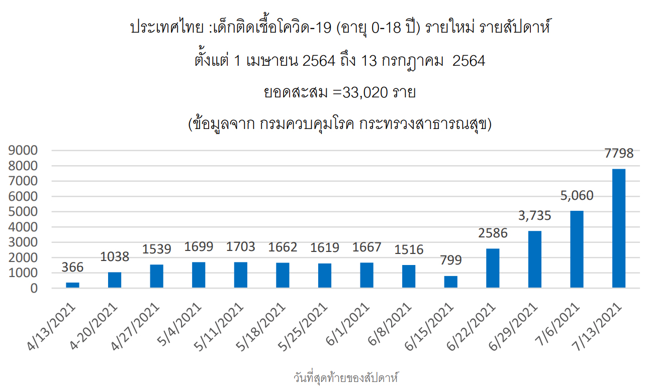 ในสถานการณ์การระบาดของโรคโควิด-19 และการกลายพันธุ์ของไวรัสทำให้มีการแพร่อย่างรวดเร็วของสาย พันธุ์เดลต้าในประเทศไทย ขณะนี้พบมีรายงานการติดโรคโควิด-19 ในผู้ป่วยเด็กเพิ่มสูงขึ้นกว่าการระบาดในระลอกหนึ่ง และระลอกสองอย่างมาก จากข้อมูลจากกรมควบคุมโรค กระทรวงสาธารณสุขตั้งแต่ 1 เมษายนถึง 15 มิถุนายน 2564 รายงานผู้ป่วยเด็กอายุน้อยกว่า 18 ปีติดโรคโควิด-19 สะสม จำนวน 13,608 รายจากผู้ป่วยติดเชื้อทุกอายุ 173,401 ราย คิดเป็นผู้ติดเชื้อที่เป็นเด็กร้อยละ 7.8 ของผู้ติดเชื้อทุกกลุ่มอายุ มีผู้ป่วยเด็กเสียชีวิต 4 ราย คิดเป็นอัตราการ เสียชีวิตร้อยละ 0.03 ทั้งหมดเป็นผู้ที่มีโรคประจำตัว และเมื่อติดตามข้อมูลจนถึง 13 กรกฎาคม 2564 พบผู้ป่วยเด็ก ติดเชื้อเพิ่มอย่างรวดเร็ว เป็น 33,020 ราย โดยมีอัตราส่วนของเด็กติดเชื้อสูงขึ้นเป็นร้อยละ 13.8 ของผู้ติดเชื้อ ทุกกลุ่มอายุการเพิ่มขึ้นอย่างรวดเร็วของเด็กติดเชื้อโควิด-19 ในระยะ 4 สัปดาห์ที่ผ่านมา สะท้อนถึงการระบาดใน ชุมชนและครอบครัวที่ยังควบคุมไม่ได้และมีแนวโน้มที่สูงขึ้น อย่างไรก็ดีพบว่าผู้ป่วยเด็กส่วนใหญ่ติดเชื้อโดยไม่แสดง อาการ หรือมีอาการเพียงเล็กน้อย
